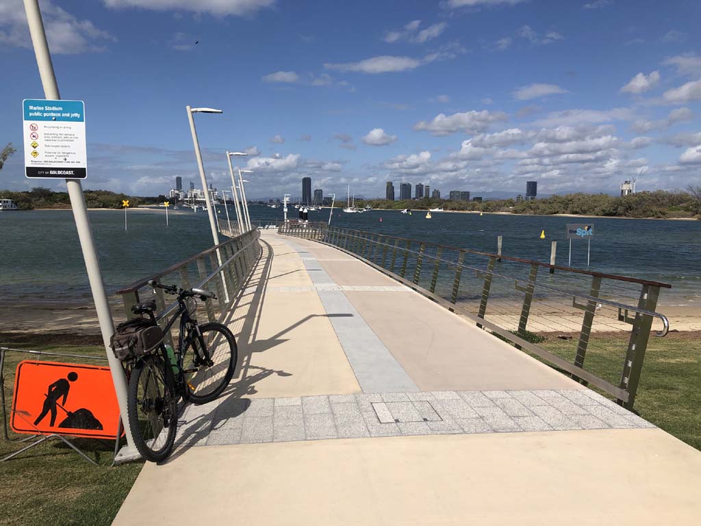 I left The Spit, and continued along the Shared Path that runs beside Seaworld Drive. Rode through Muriel Henchman park, did a lap of the Seaworld carpark. The Seaworld carpark was less than half full. Then rode around Marina Mirage, past Helitours which is on the jetty. Continued back to MacIntosh Island, did another lap.