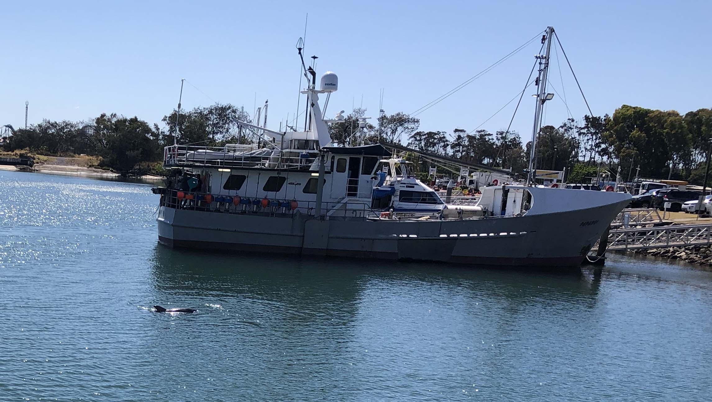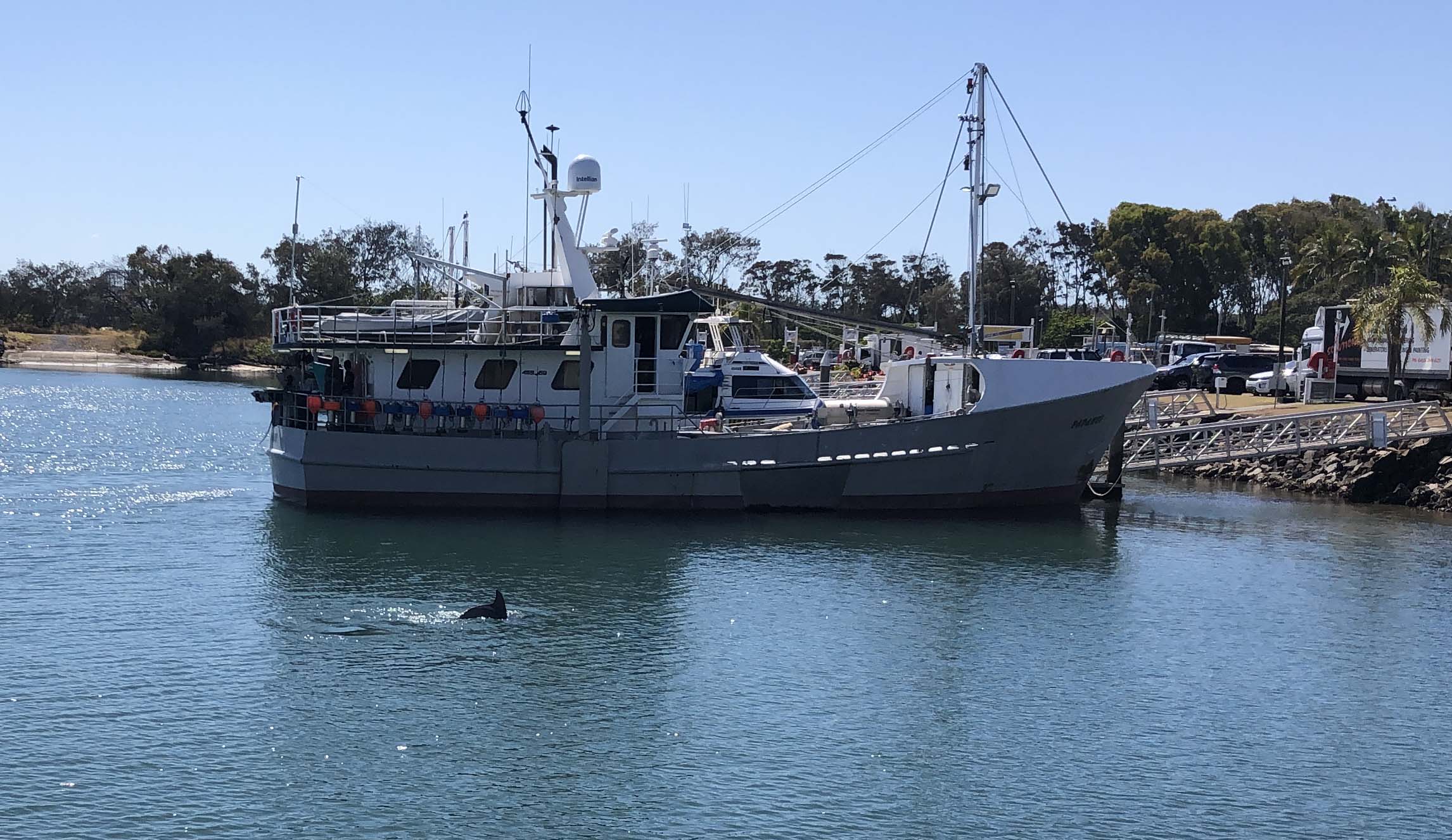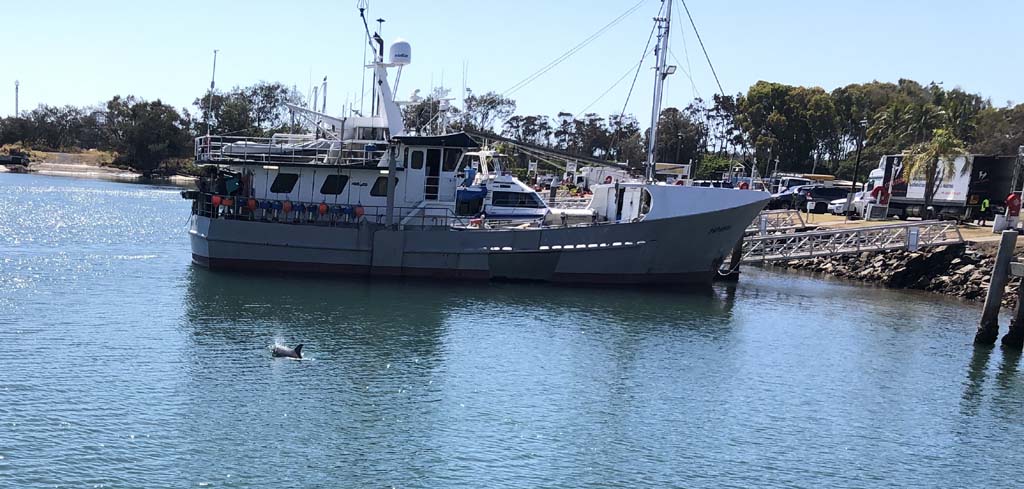 I left The Spit, and continued along the Shared Path that runs beside Seaworld Drive. I couldn't believe the amount of work the council had done at the Muriel Henchman park, did a lap of the Seaworld carpark. The Seaworld carpark was less than half full. As I approached the Fisherman's Co-Op, there was a couple taking photos and I just caught a glimpse of Danny dolphin about 6 feet from the jetty. I immediately stopped and got my phone out to photo him. By the time I was ready he was chasing a school of fish, BUT I managed a couple of photos.