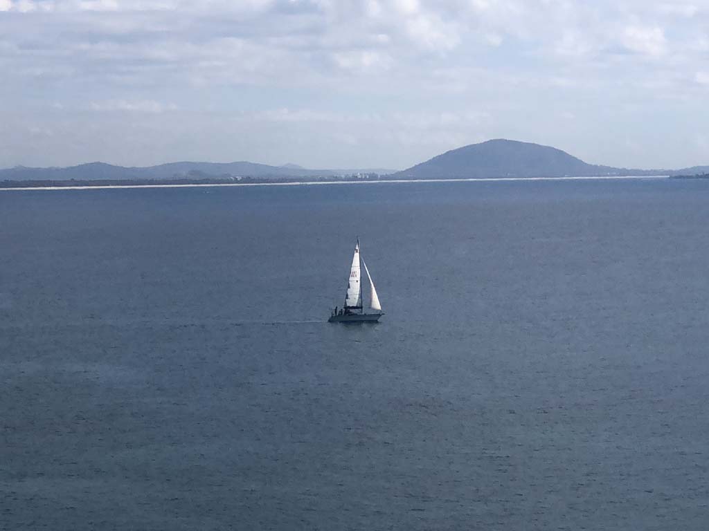 I left home at 7:41am, after going for a coffee and some shopping at Coles Lab Park. The breeze was a light, building North Westly. The Broadwater was calm.