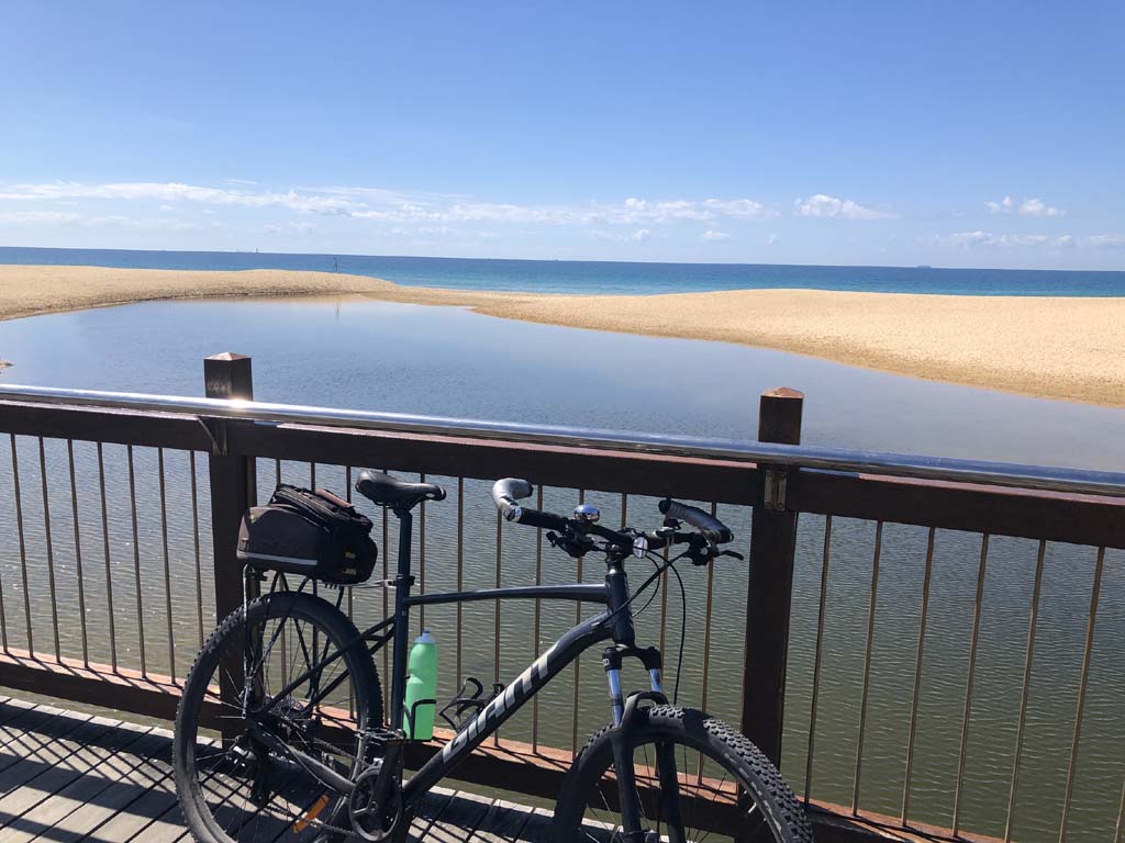 Headed off towards The Seaway/Spit, via the Federation Walk. Continued riding to the tip of the Seawall/Spit. Stopped and took my photos and ate my museli bar, then rode to the tip of the Moondarewa Spit, took more photos. During my lap, my friendly magpie attacked me once. No damage to me, as I am prepared for their attacks.