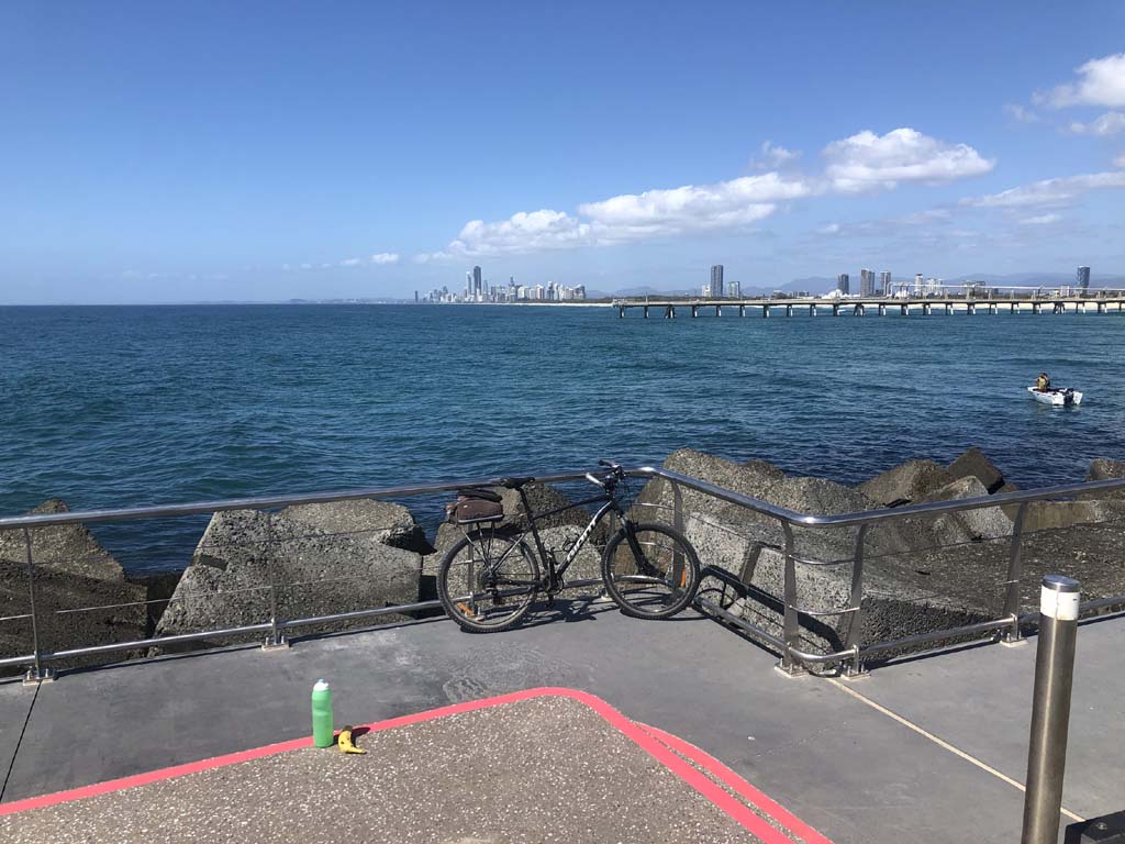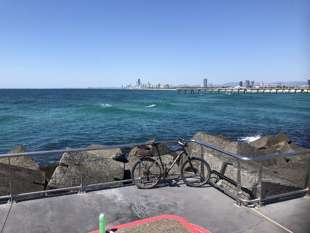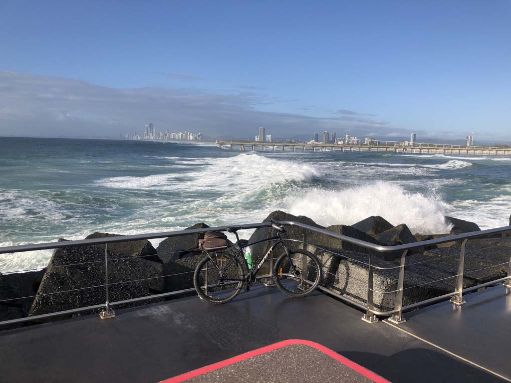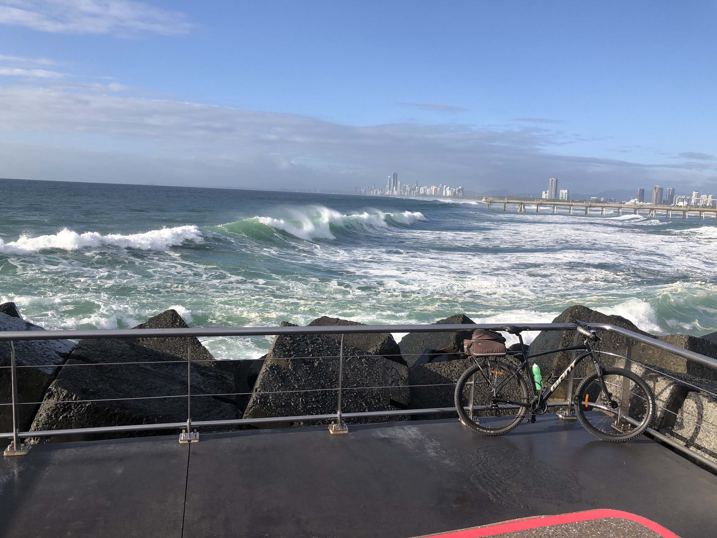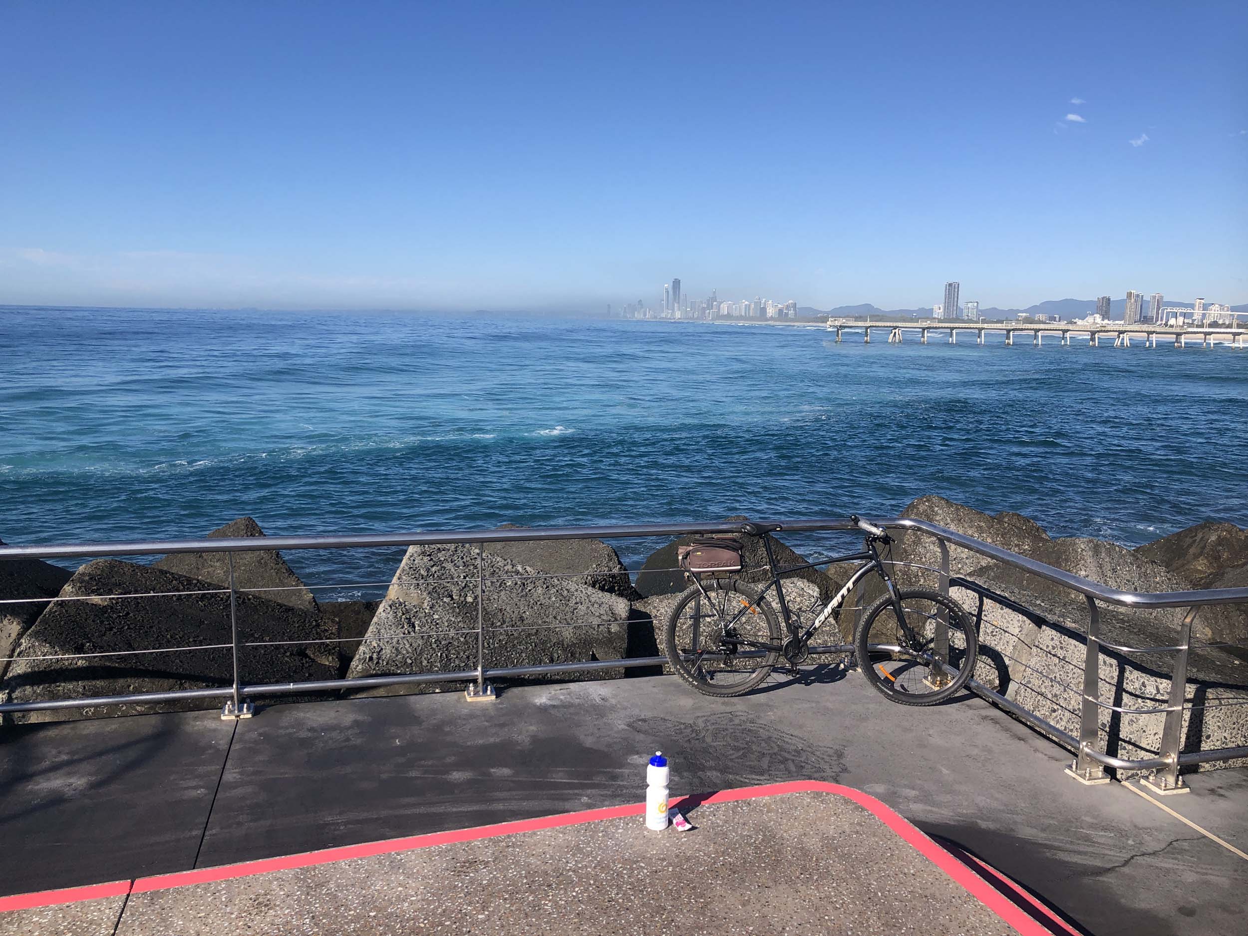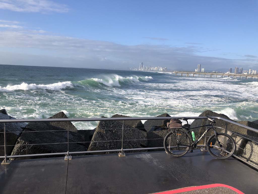 Home to Turnaround Pt down to Surfers via GC600 Park to Surfers to The Spit (both ends - twice) then back through GC600 Park back to Cafe Rockpool and finally back Home about 50+kms.