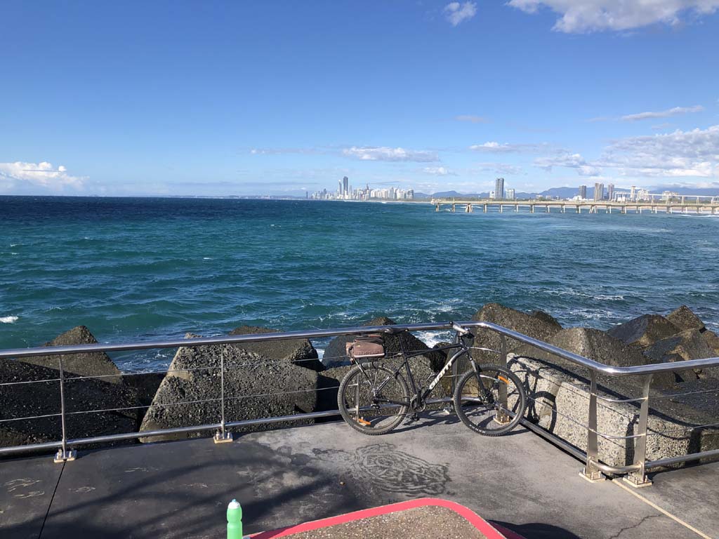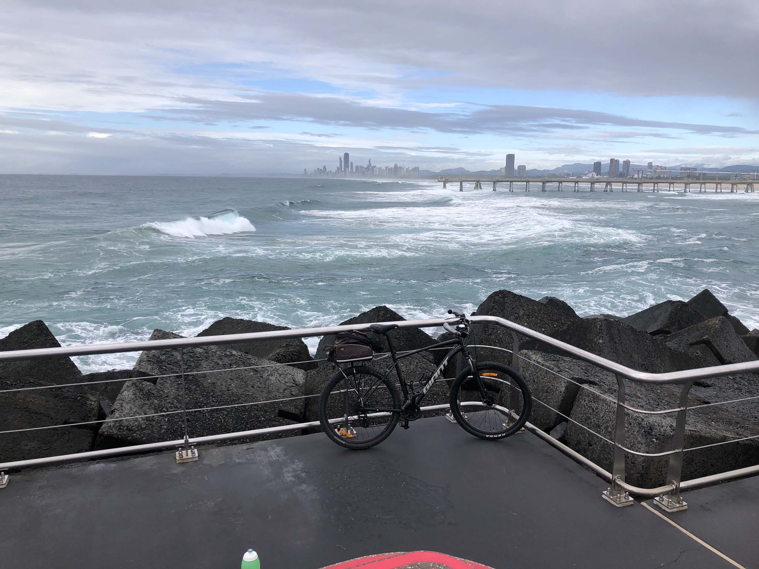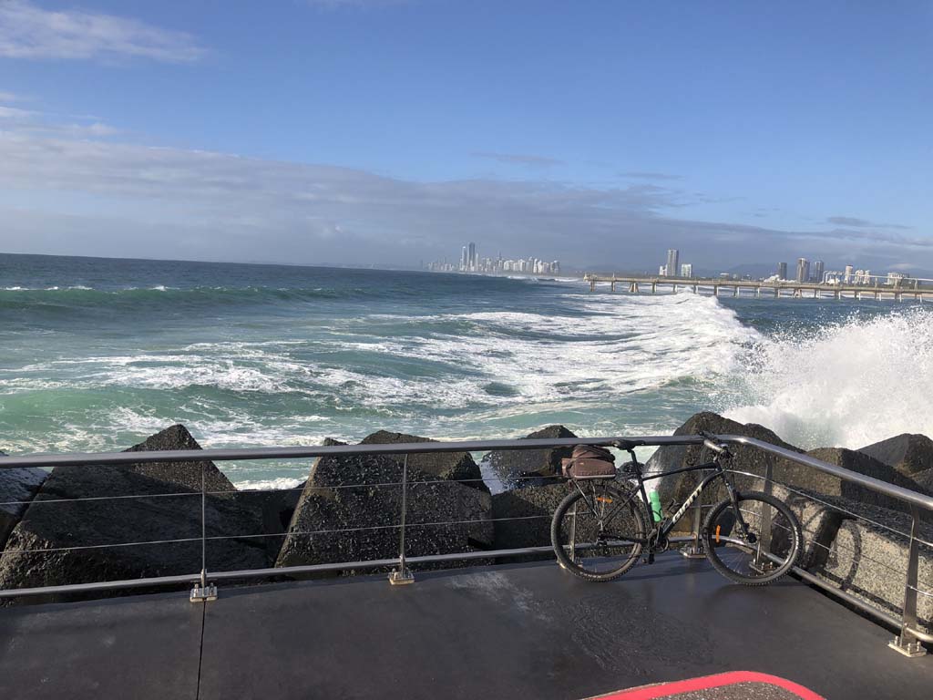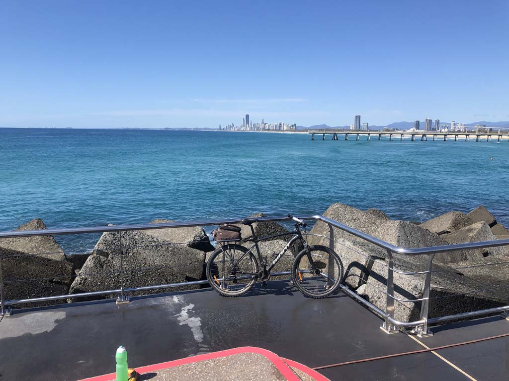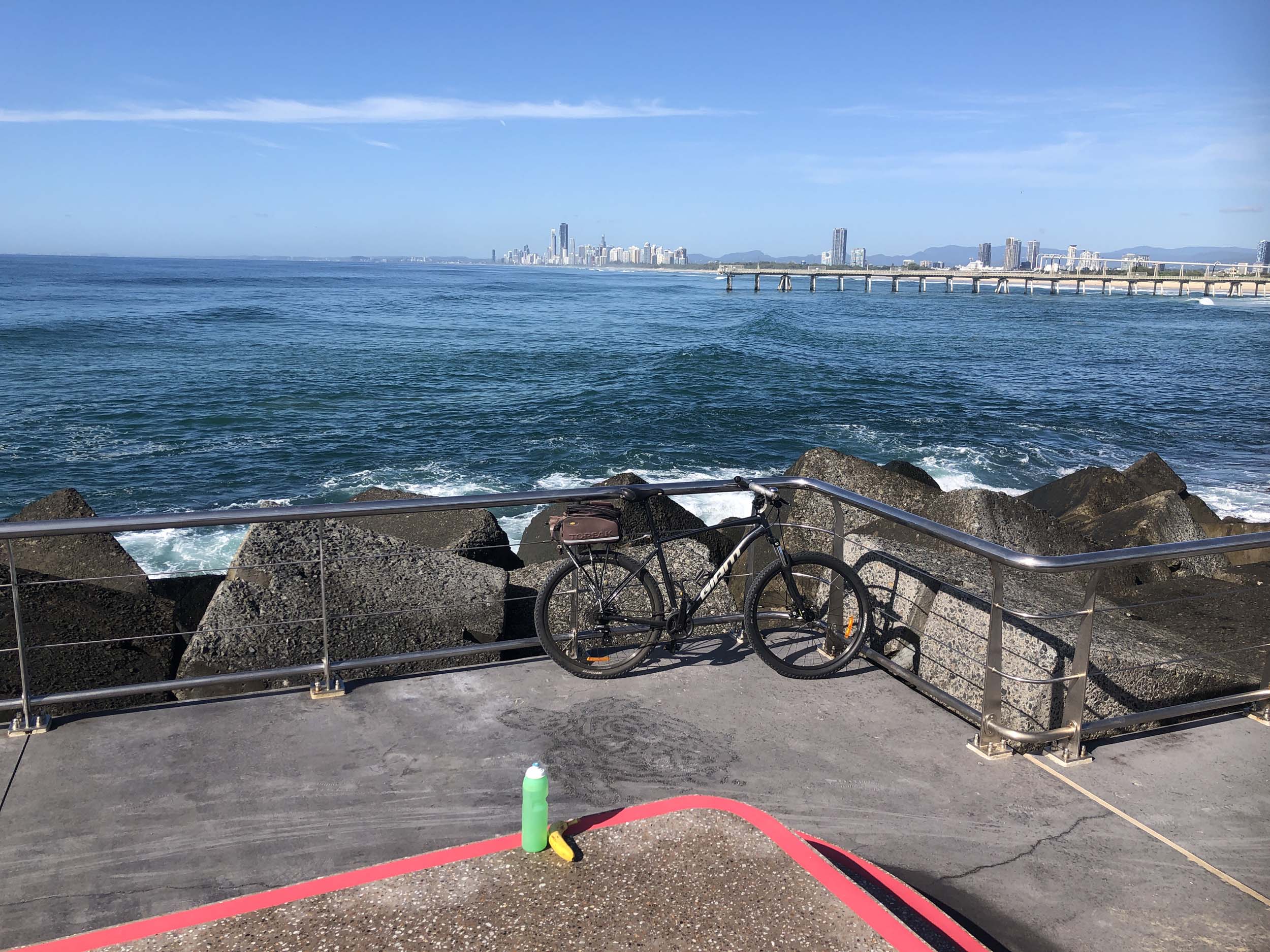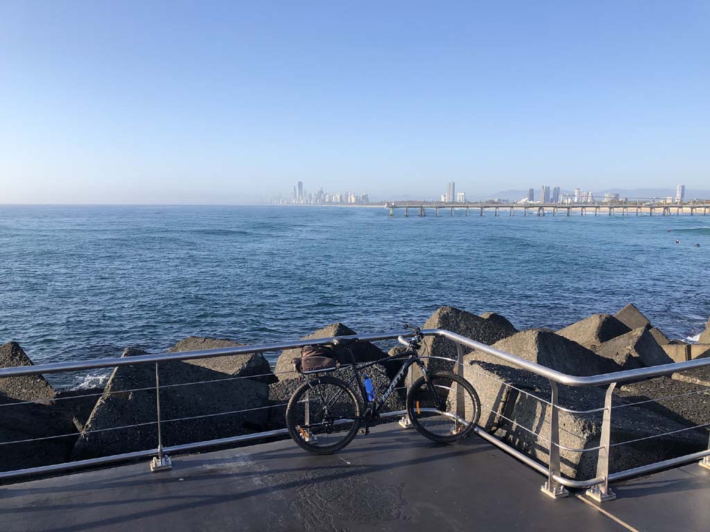 Home to Turnaround Pt down to Surfers via GC600 Park to Surfers to The Spit (both ends - twice) then back through GC600 Park back to Cafe Rockpool and finally back Home about 50+kms.