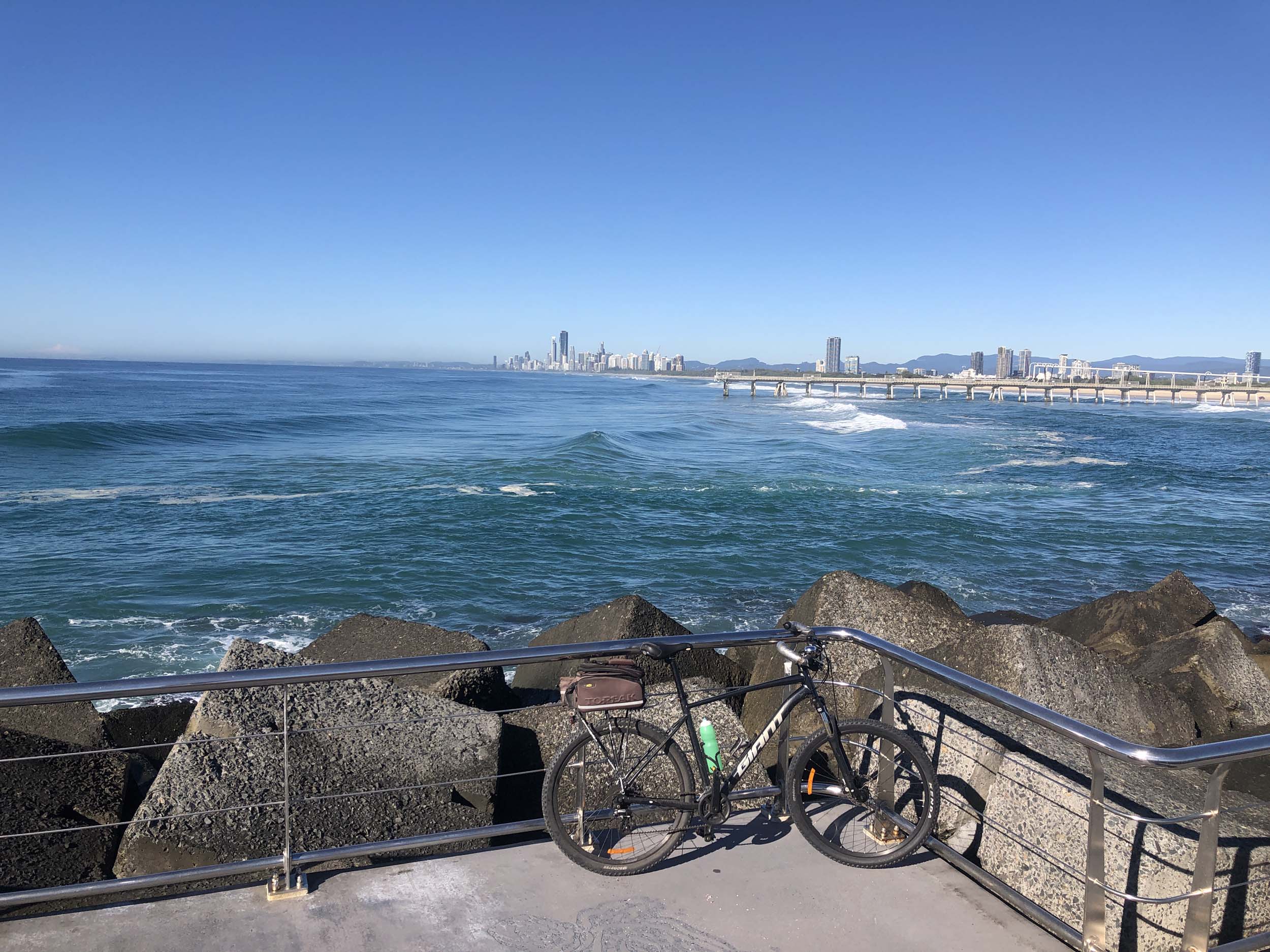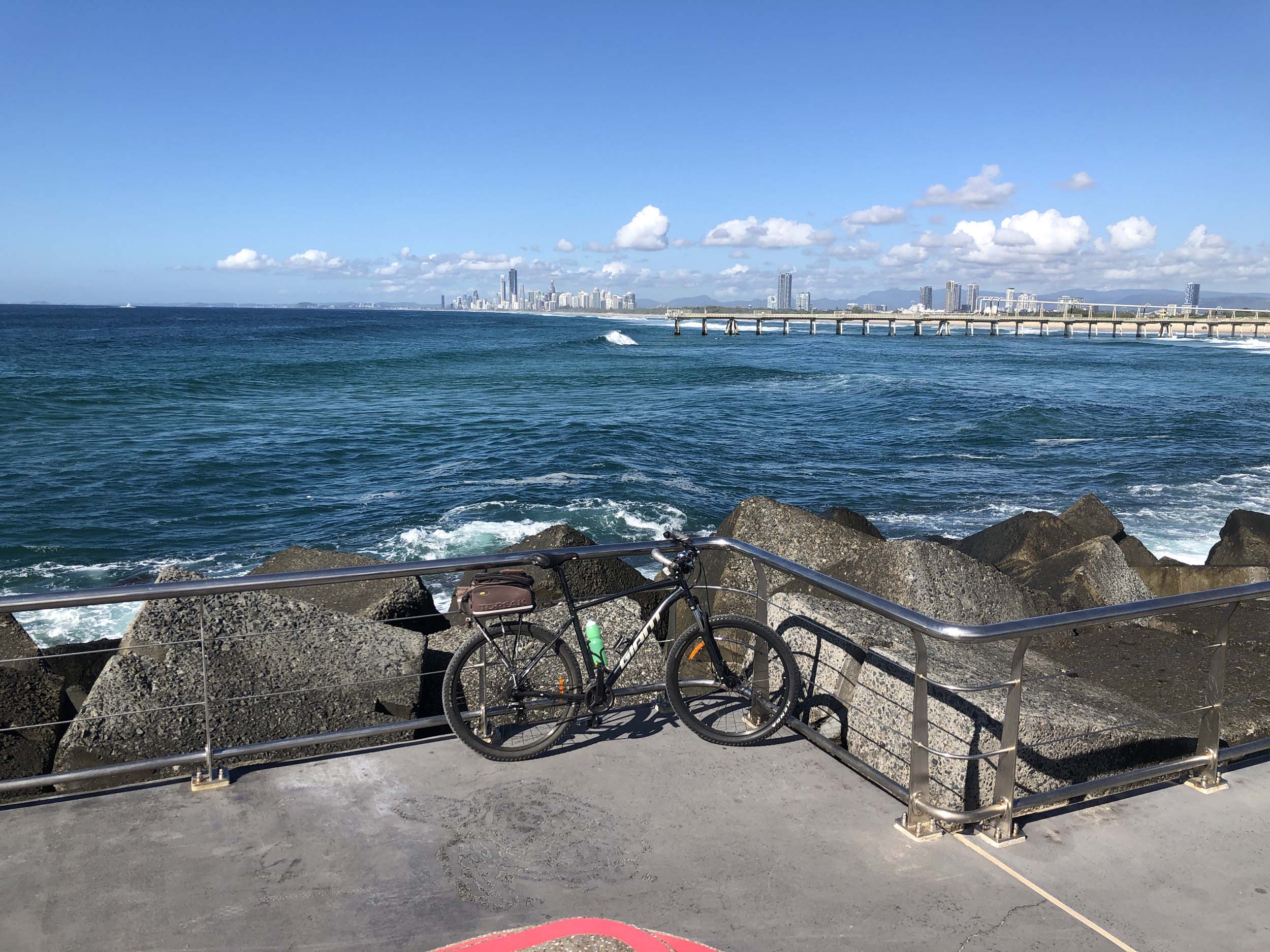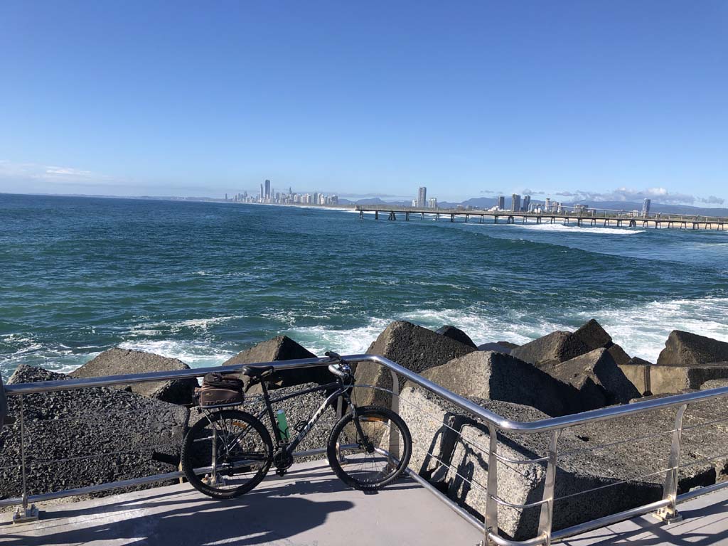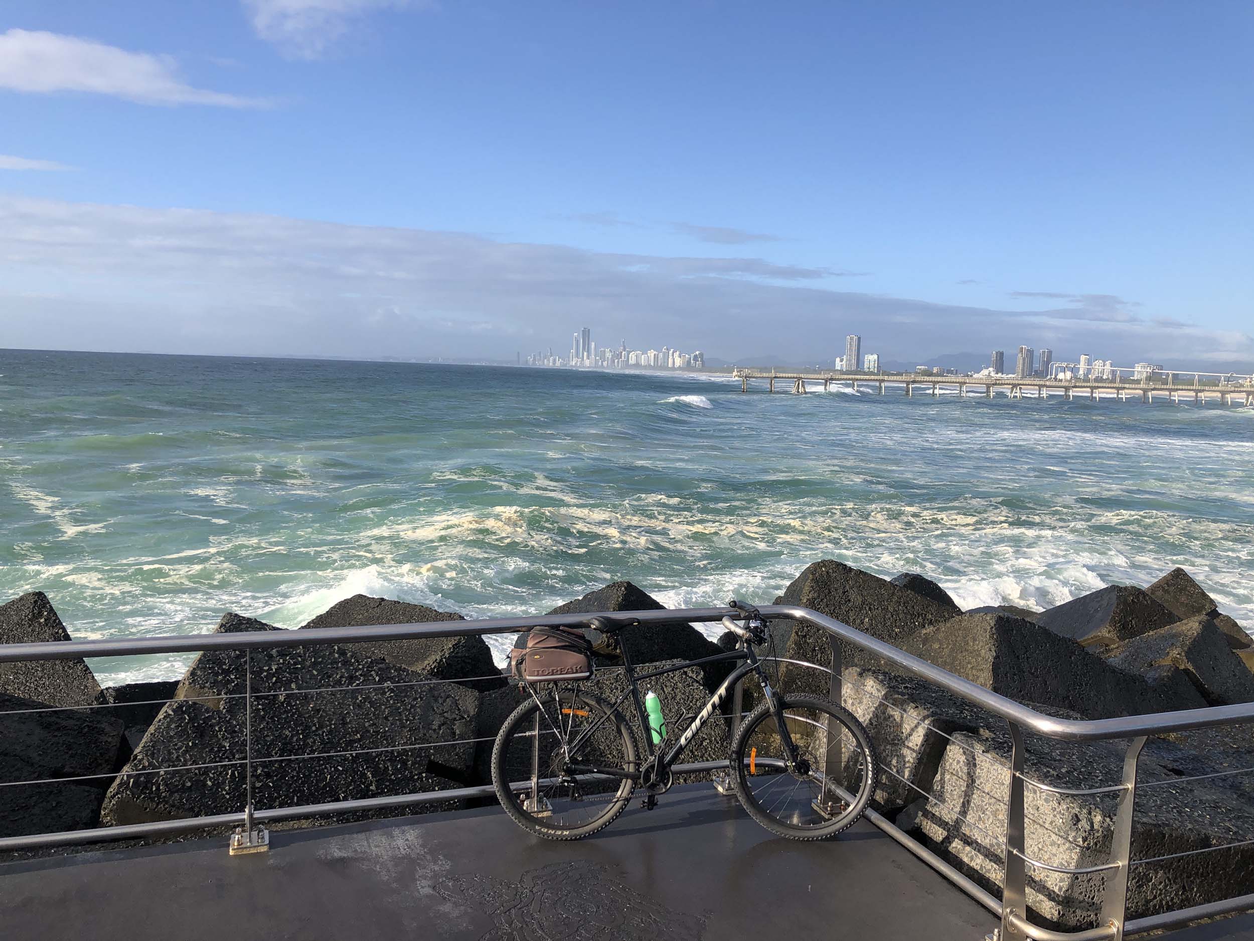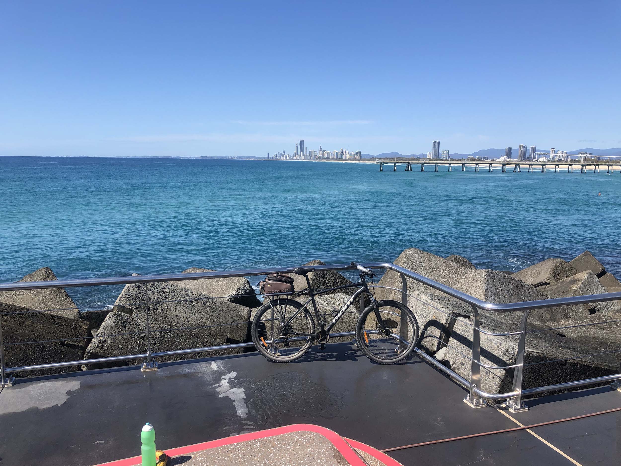 Home to Turnaround Pt down to Surfers via GC600 Park to Surfers to The Spit (both ends - twice) then back through GC600 Park back to Cafe Rockpool and finally back Home about 50+kms.
