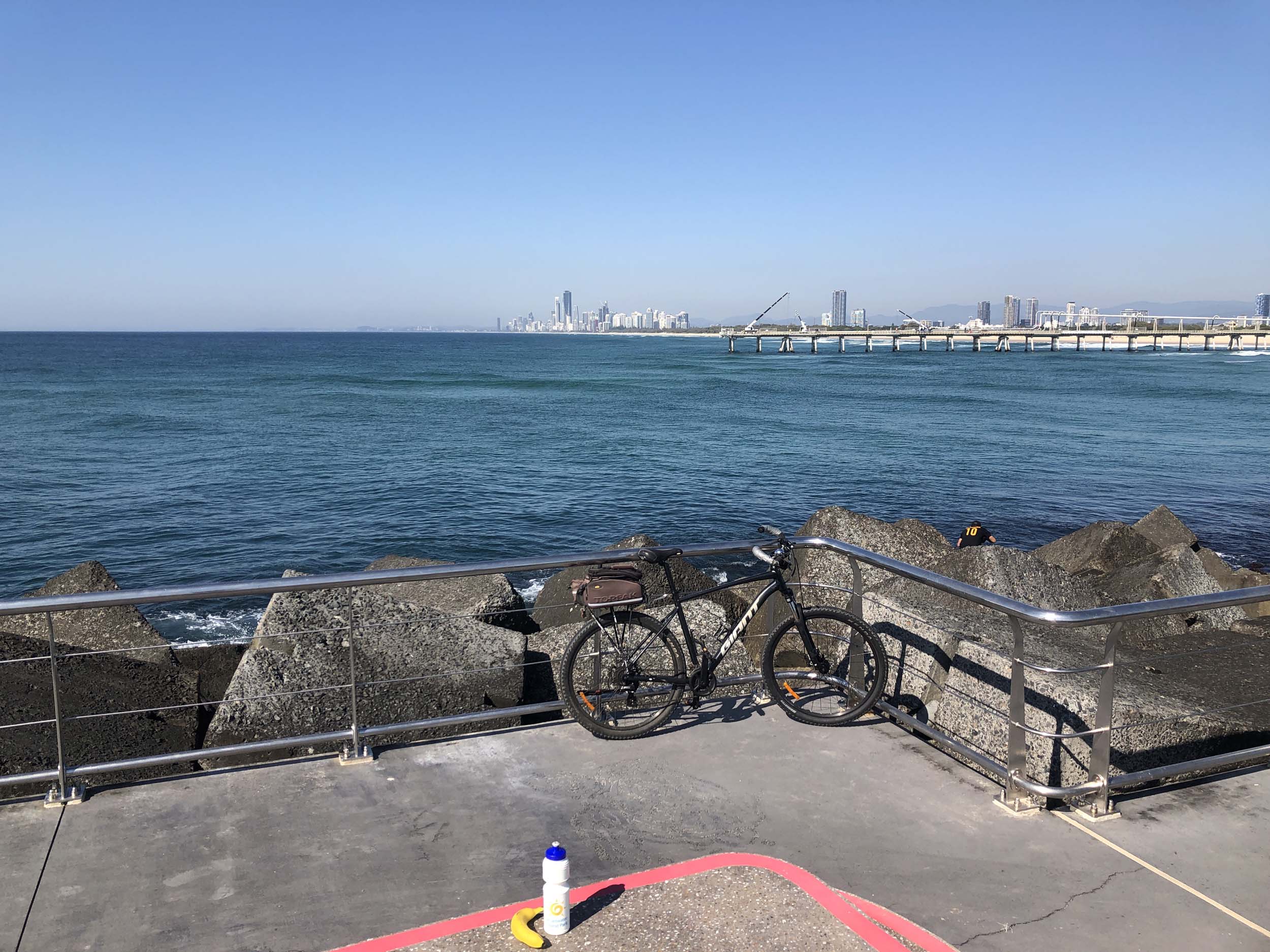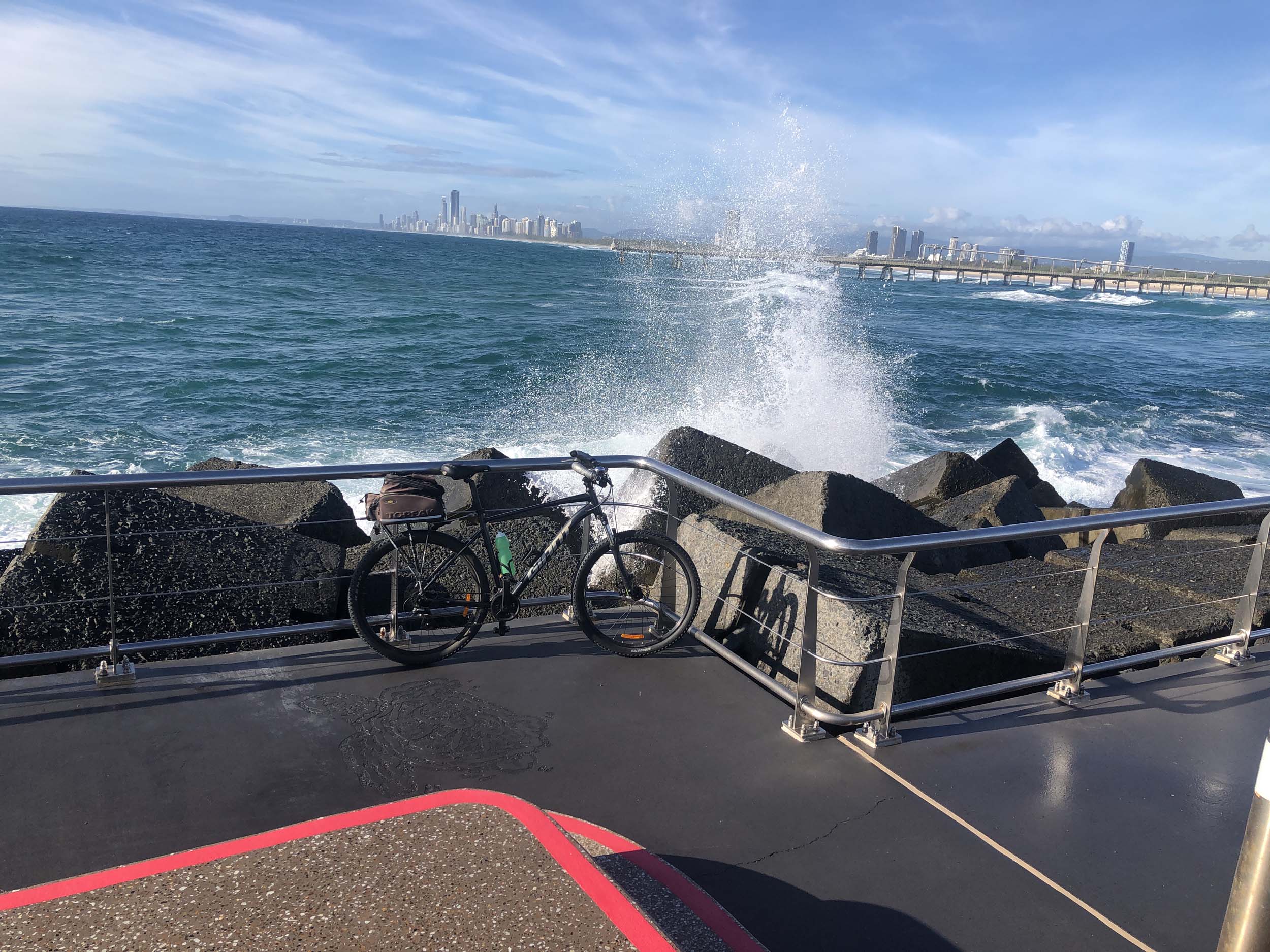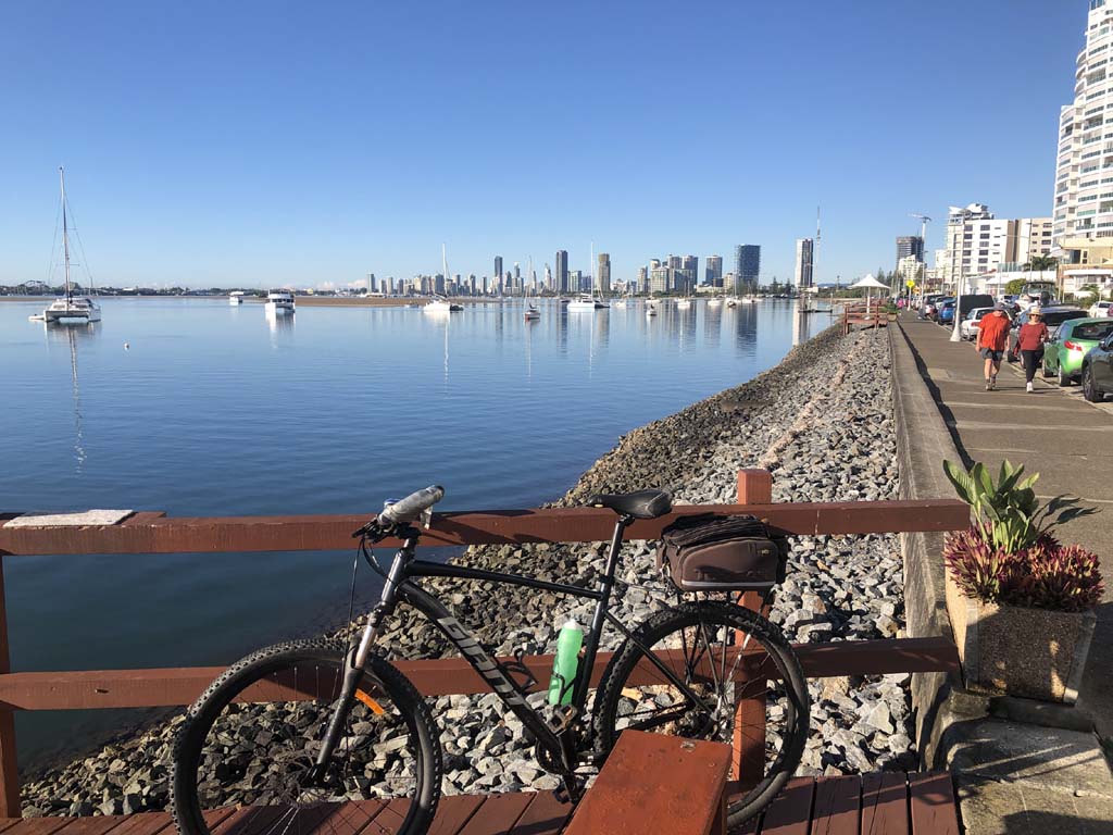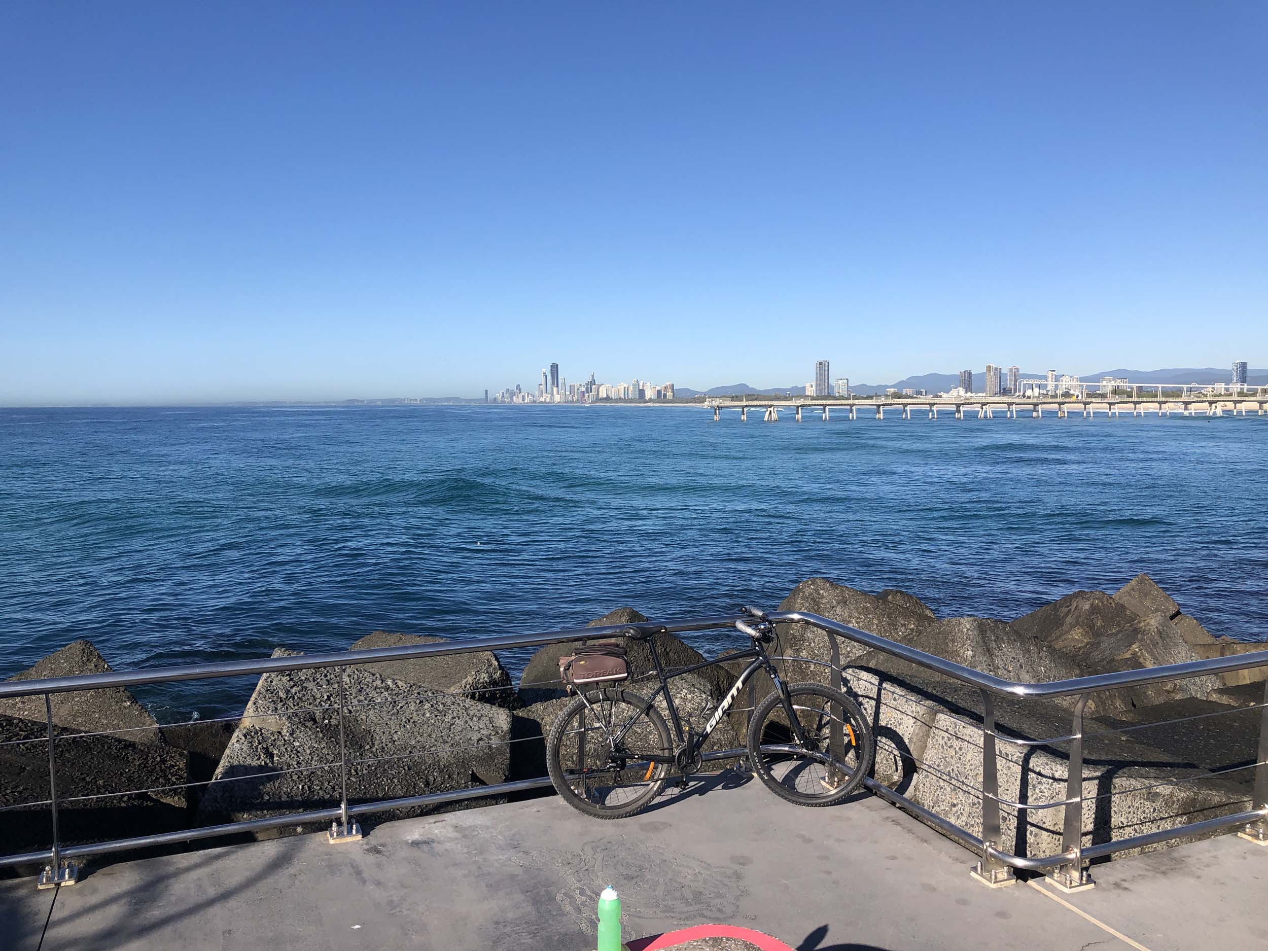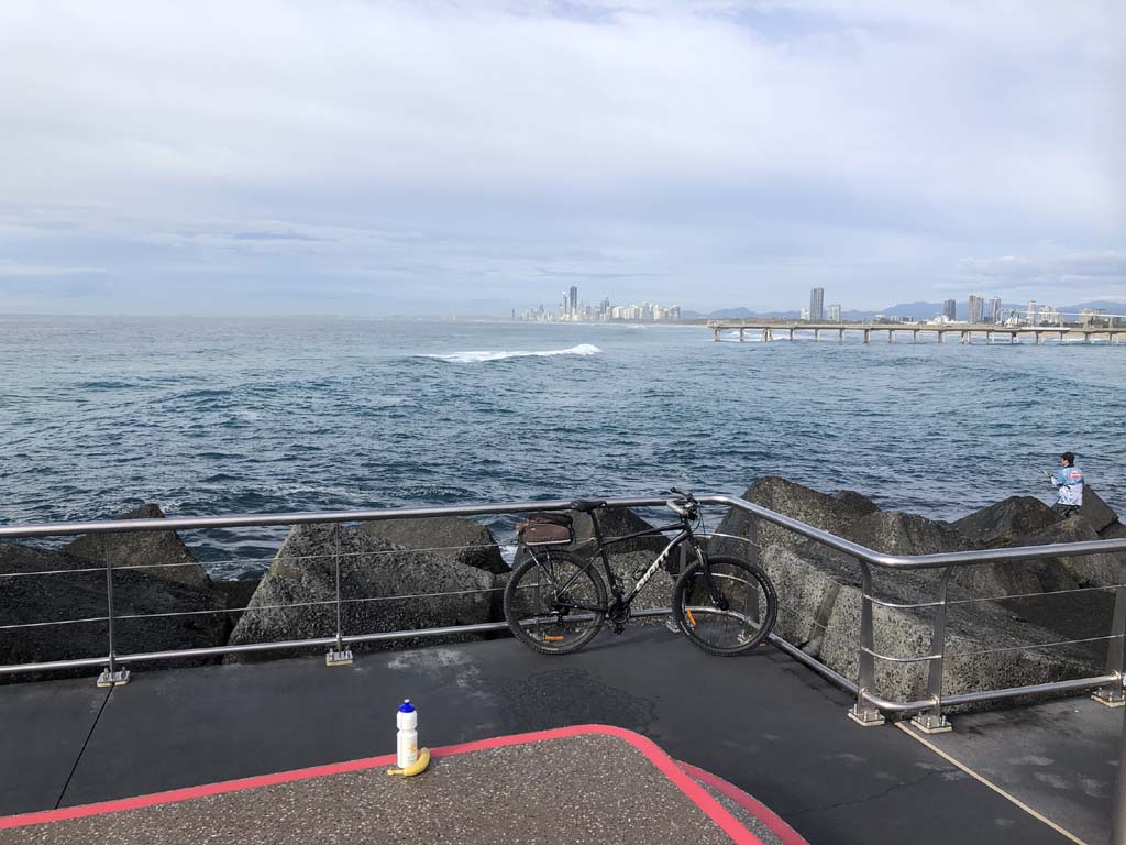 Home to Turnaround Pt down to Surfers via GC600 Park to Surfers to The Spit (both ends - twice) then back through GC600 Park back to Cafe Rockpool and finally back Home about 50+kms.