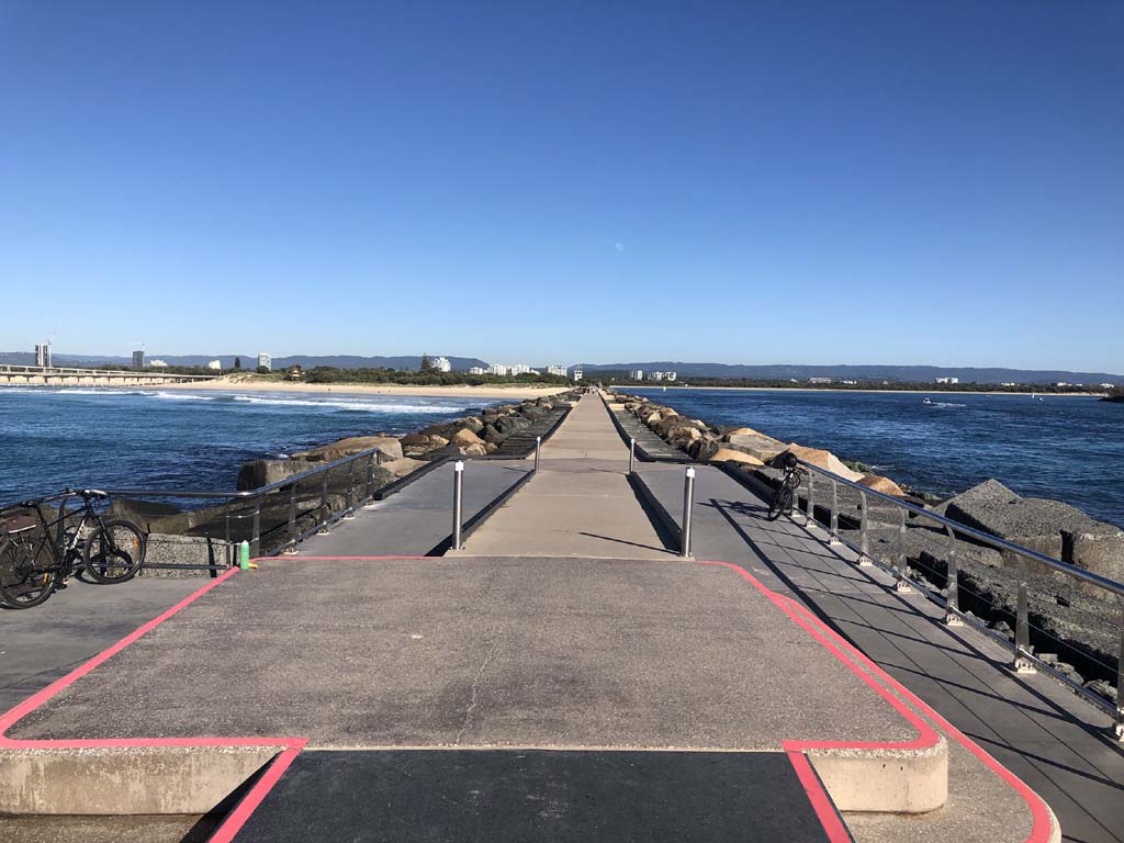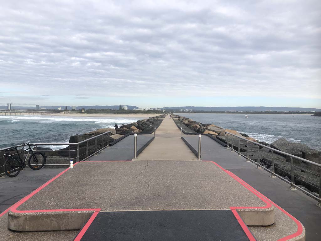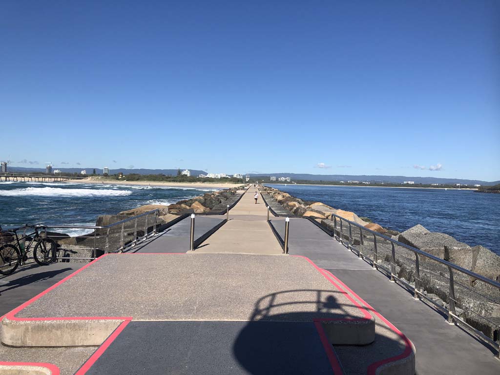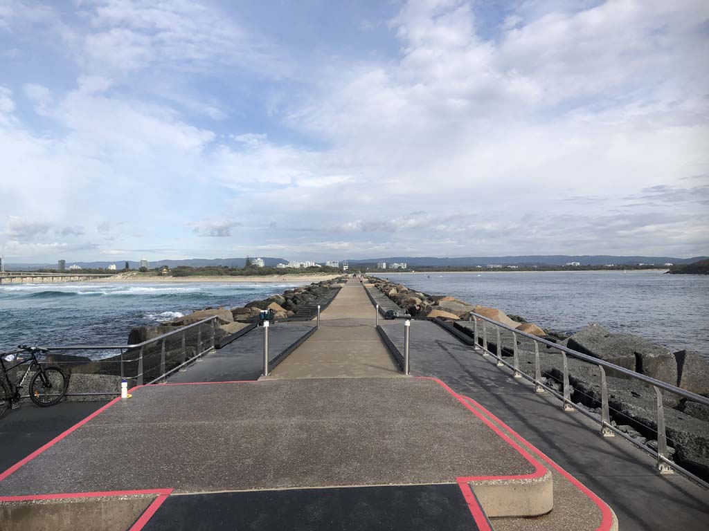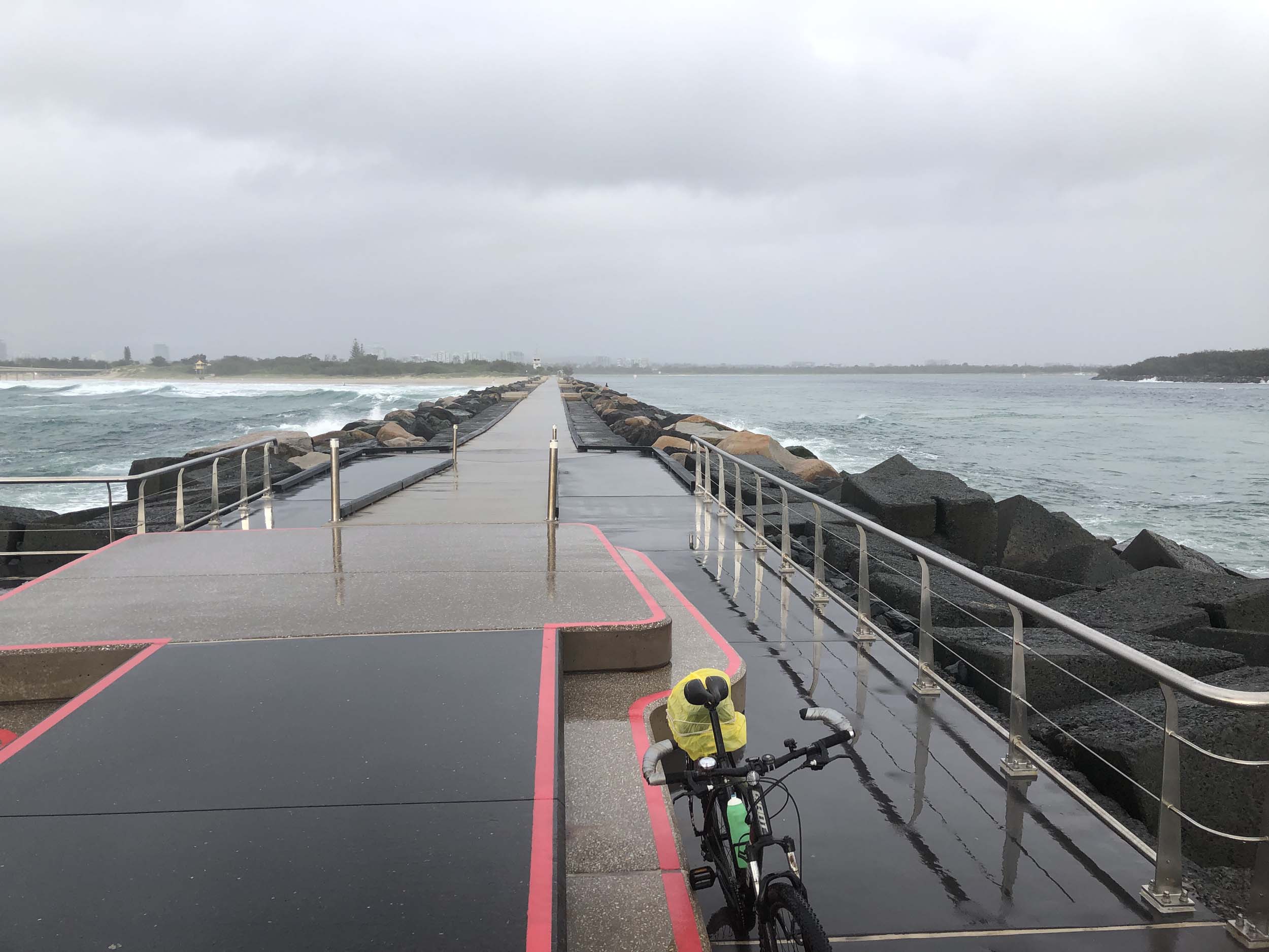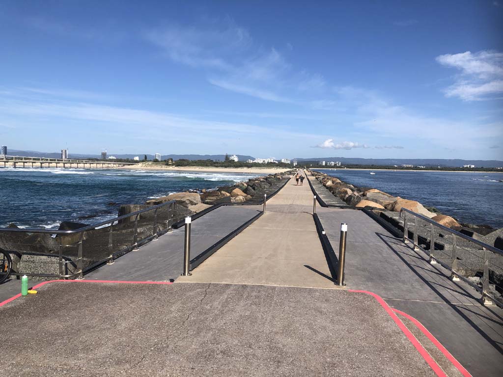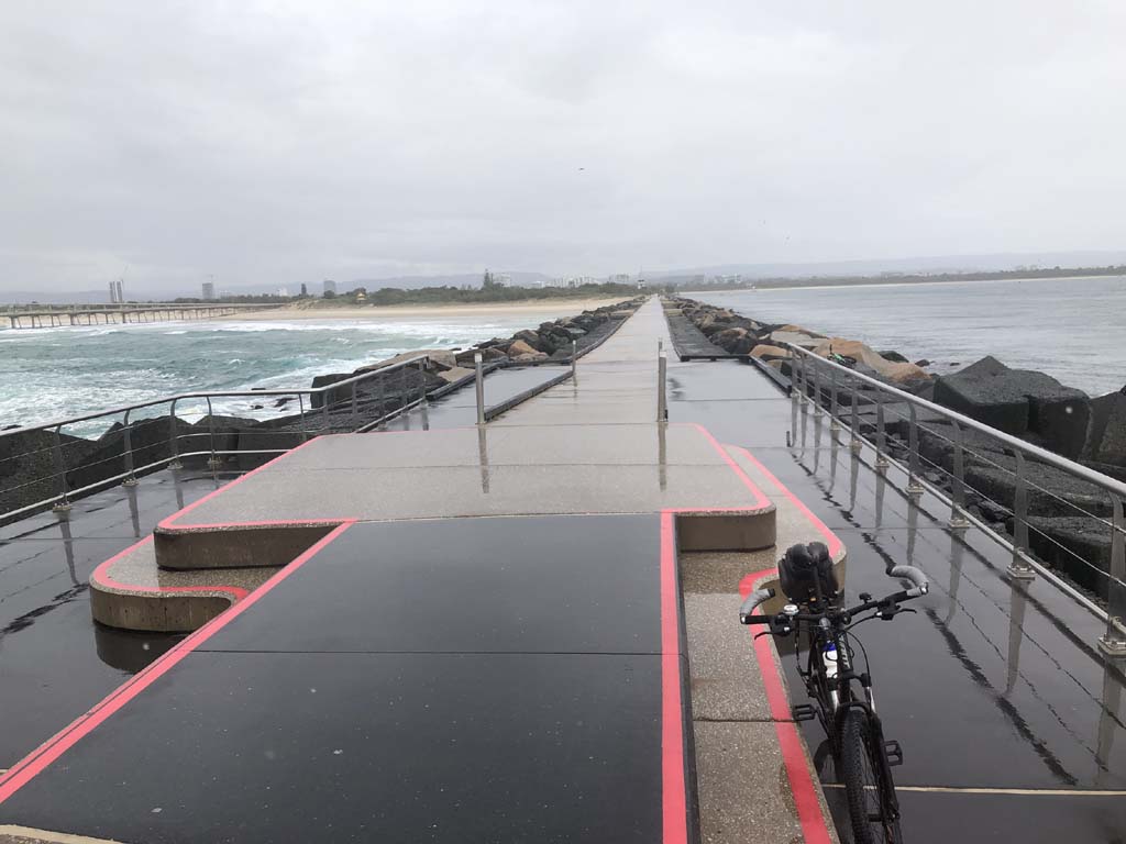 Over the Bridge at Narrowneck then along the Shared Path, towards The Seaway/Spit, via the jetties of Marina Mirage, a lap of the Seaworld Carpark, a lap of the Muriel Henchman carpark and finally made it to the tip of the Seawall/Spit. Stopped and took my photos and ate my banana, then rode to the tip of the Moondarewa Spit, took more photos.