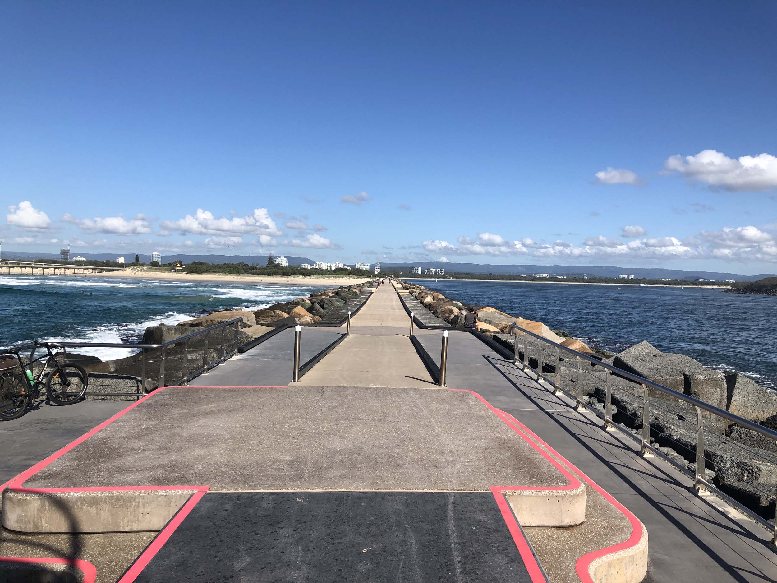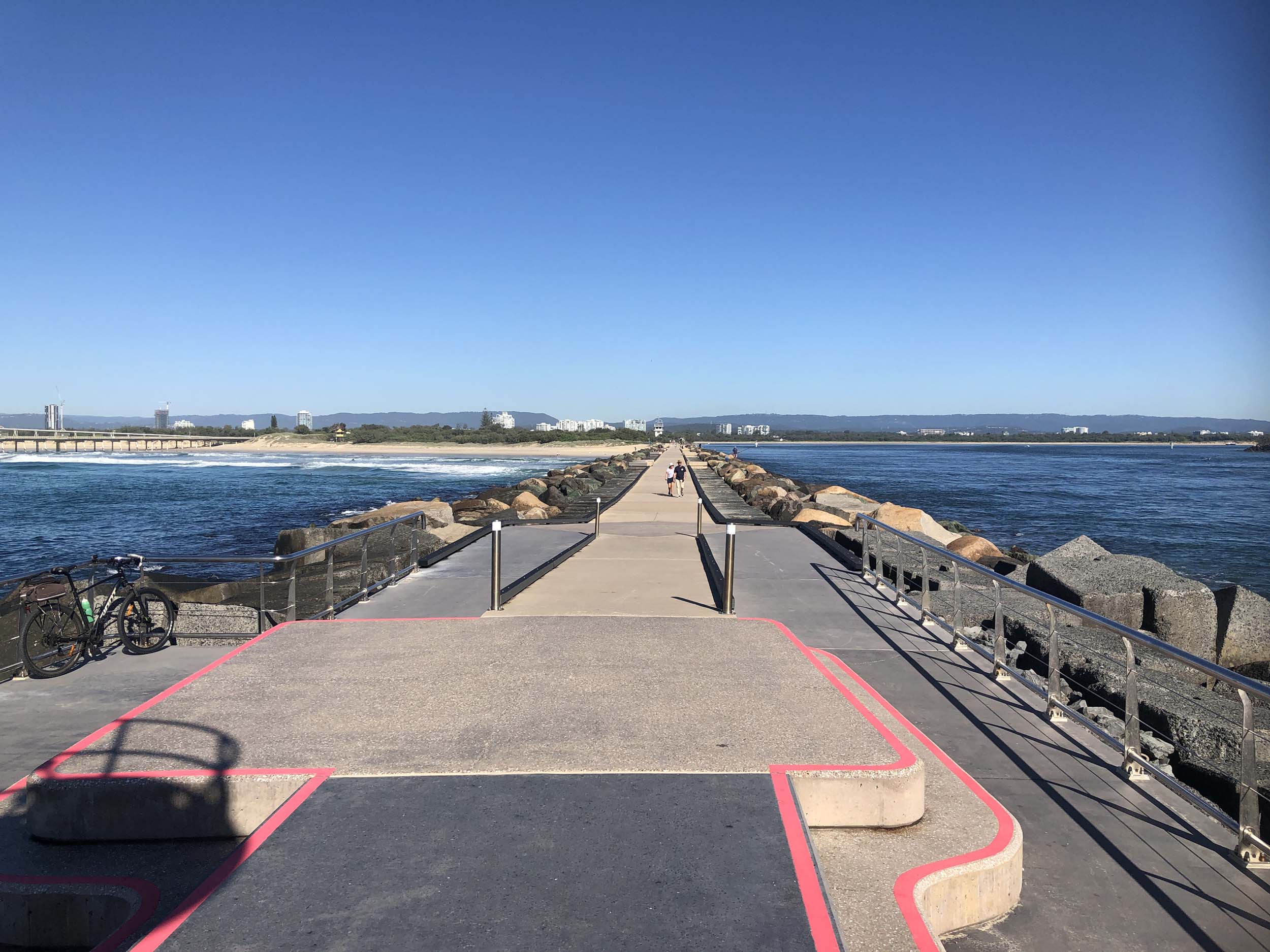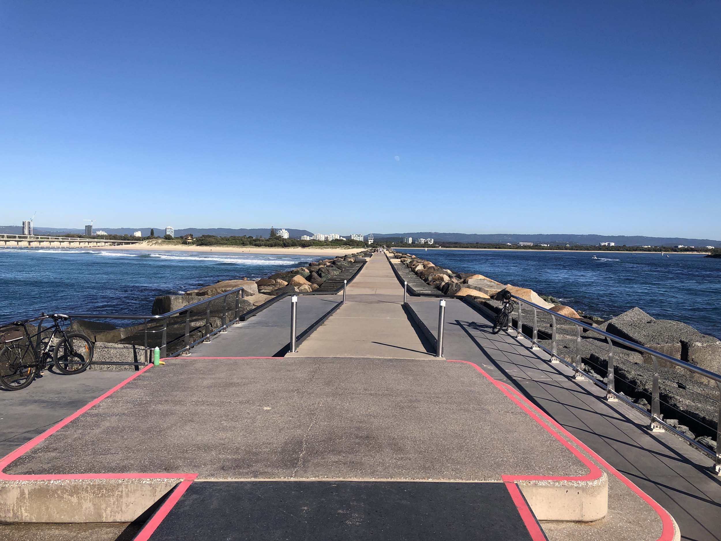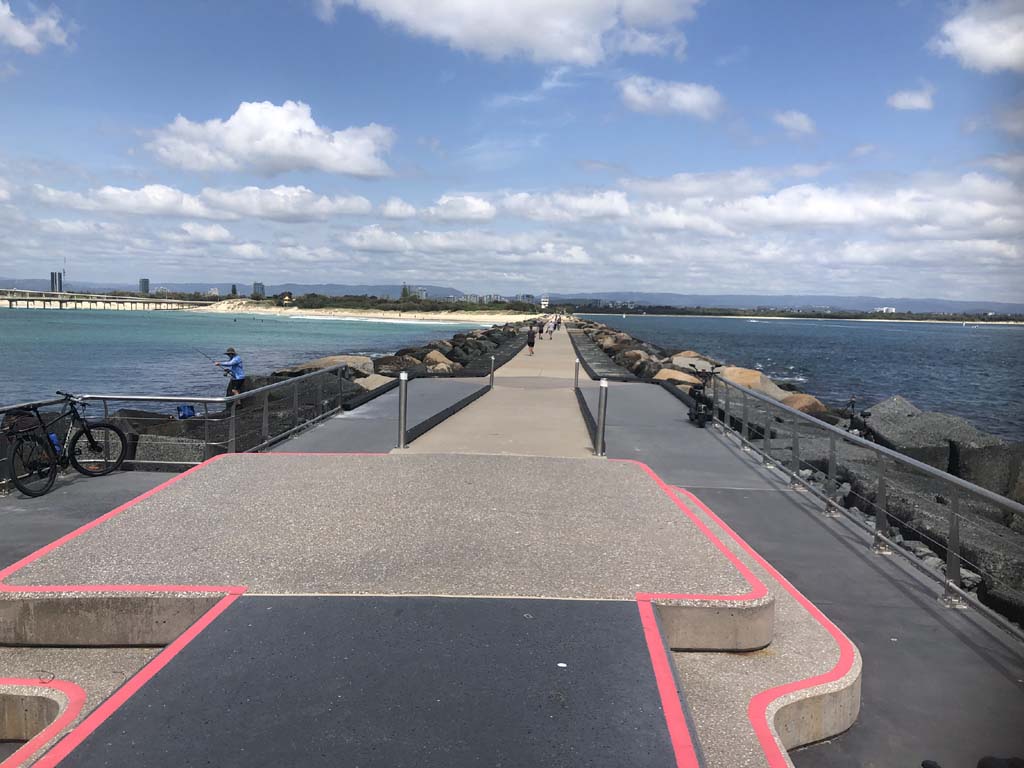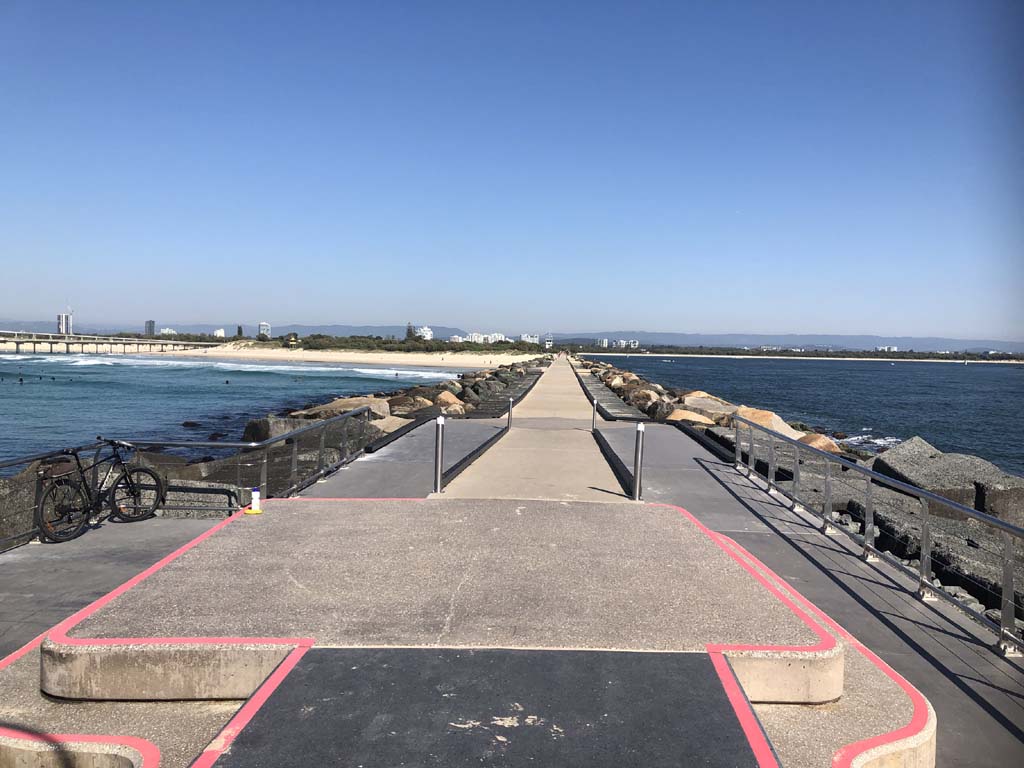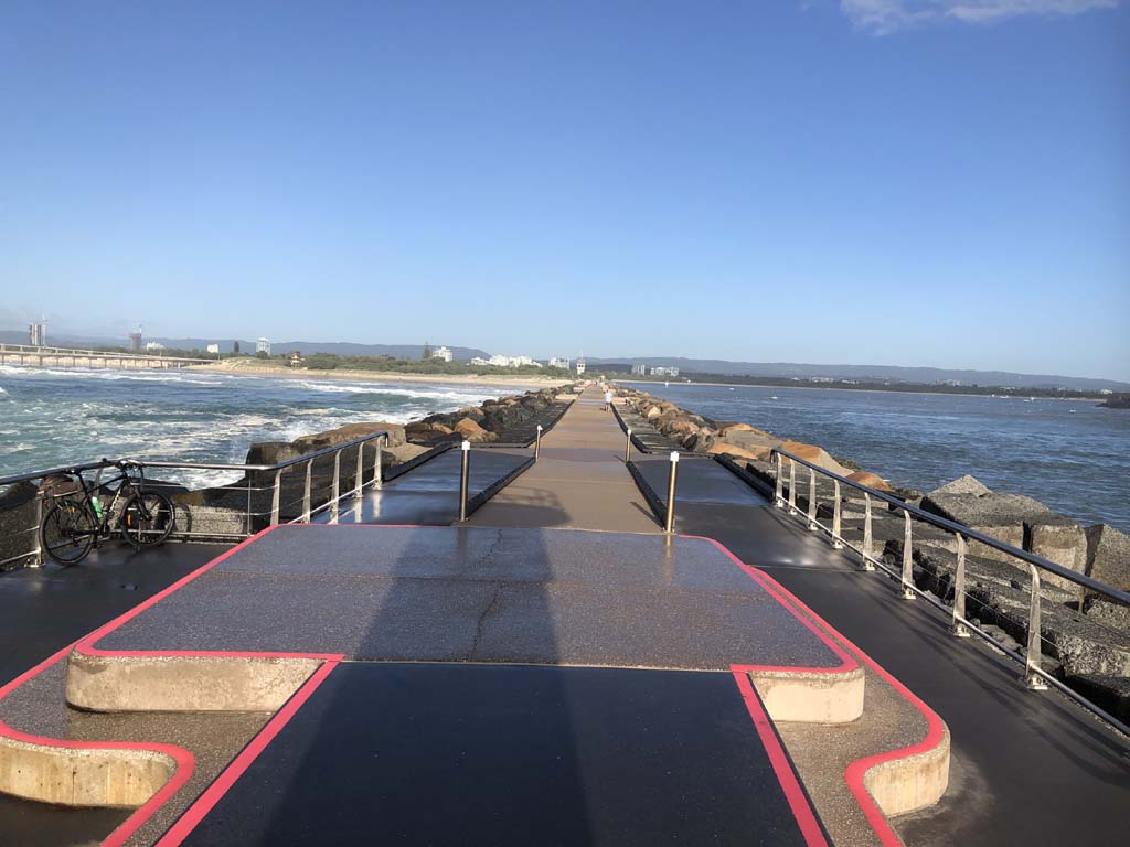 Over the Bridge at Narrowneck then along the Shared Path, towards The Seaway/Spit, via the jetties of Marina Mirage, a lap of the Seaworld Carpark, a lap of the Muriel Henchman carpark and finally made it to the tip of the Seawall/Spit. Stopped and took my photos and ate my banana, then rode to the tip of the Moondarewa Spit, took more photos.