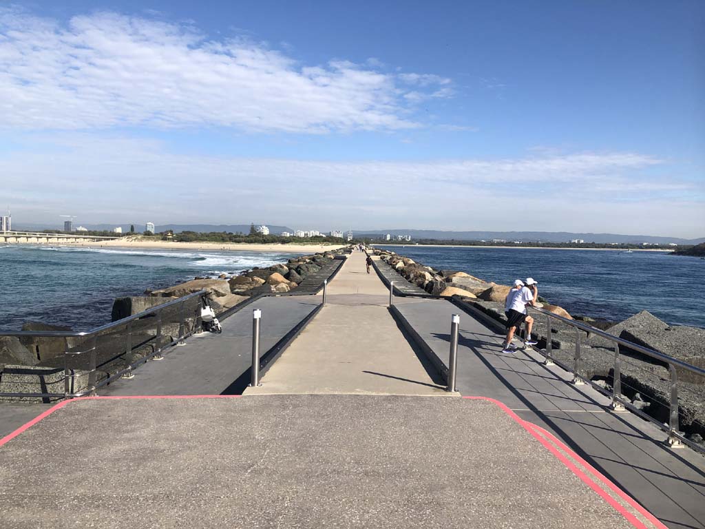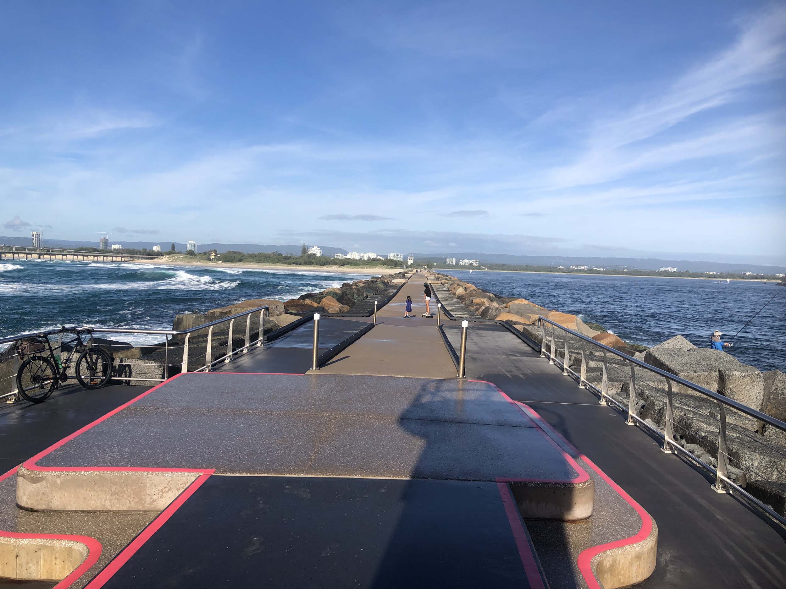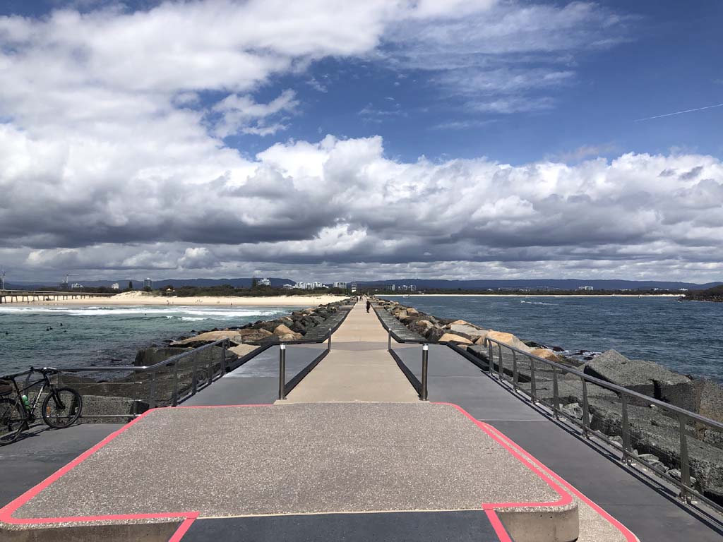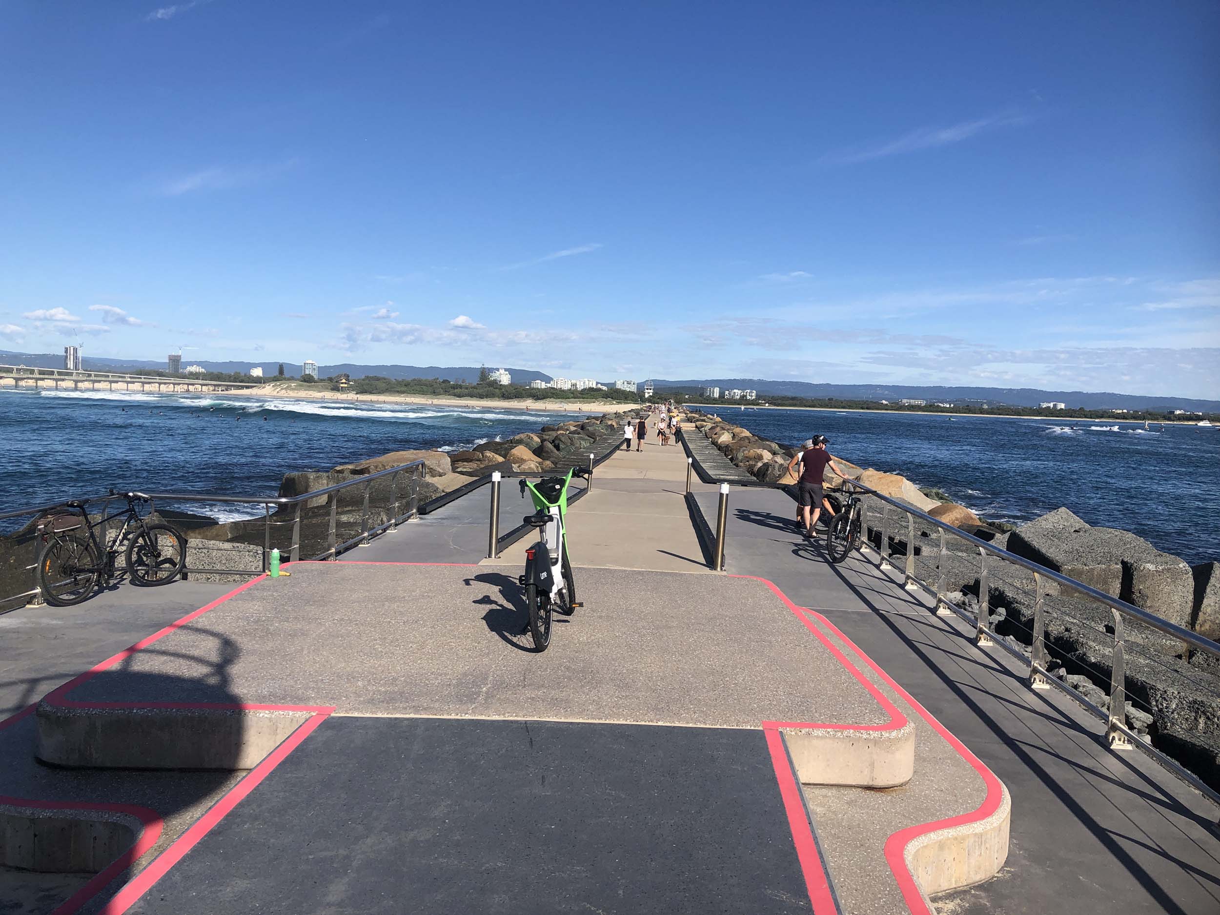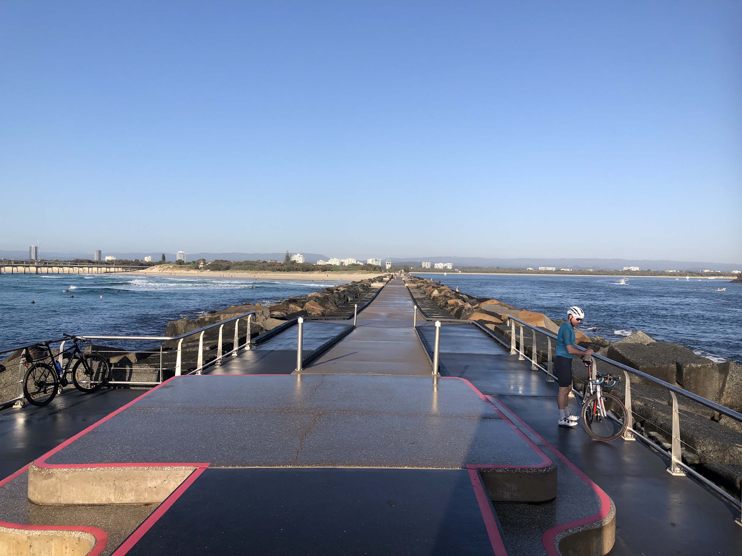 Over the Bridge at Narrowneck then along the Shared Path, towards The Seaway/Spit, via the jetties of Marina Mirage, a lap of the Seaworld Carpark, a lap of the Muriel Henchman carpark and finally made it to the tip of the Seawall/Spit. Stopped and took my photos and ate my banana, then rode to the tip of the Moondarewa Spit, took more photos.