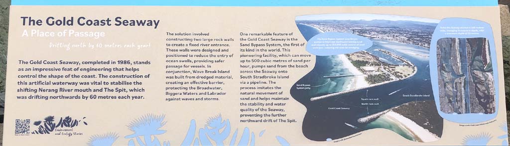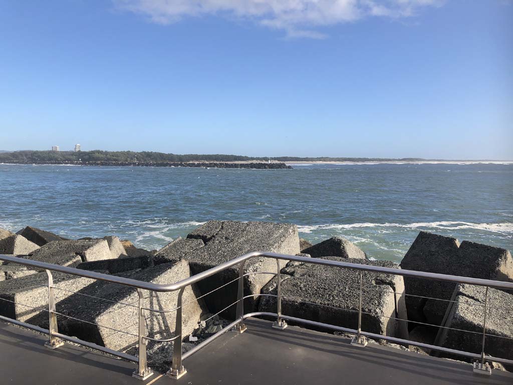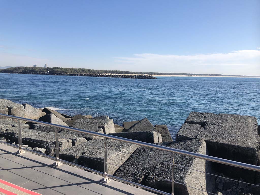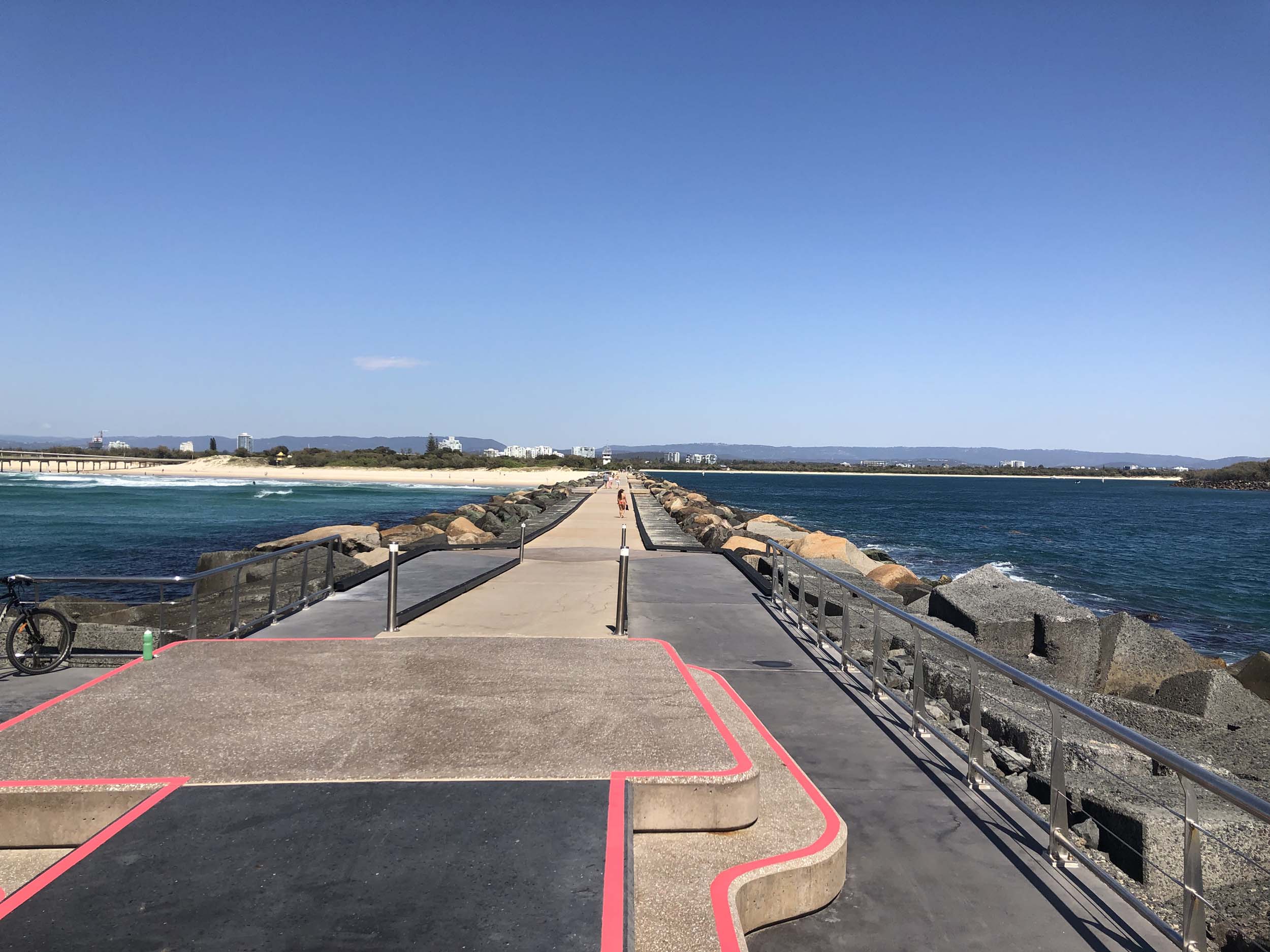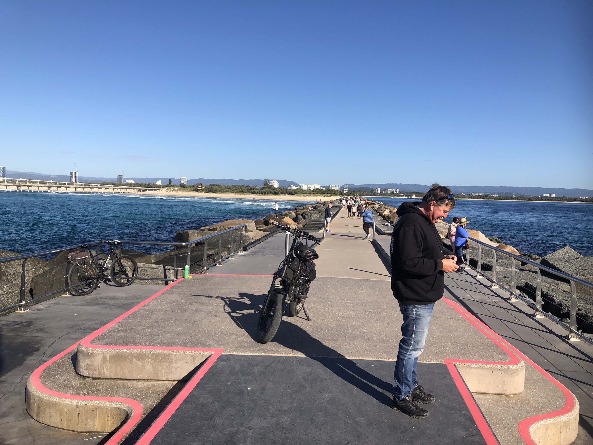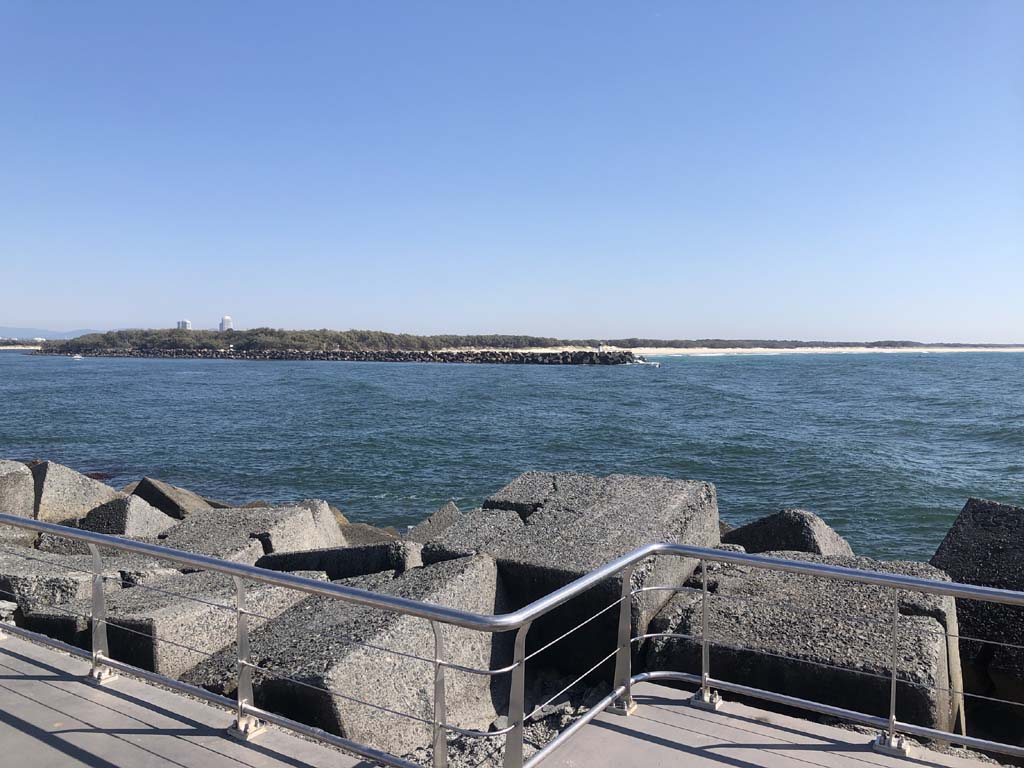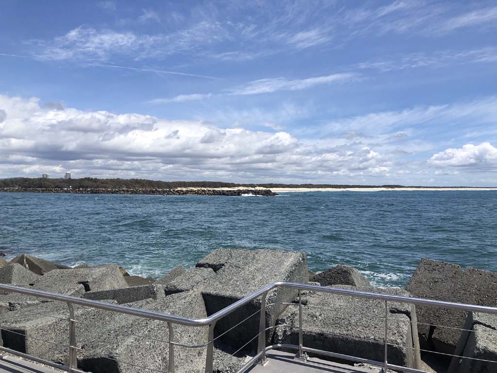 Over the Bridge at Narrowneck then along the Shared Path, towards The Seaway/Spit, via the jetties of Marina Mirage, a lap of the Seaworld Carpark, a lap of the Muriel Henchman carpark and finally made it to the tip of the Seawall/Spit. Stopped and took my photos and ate my banana, then rode to the tip of the Moondarewa Spit, took more photos.