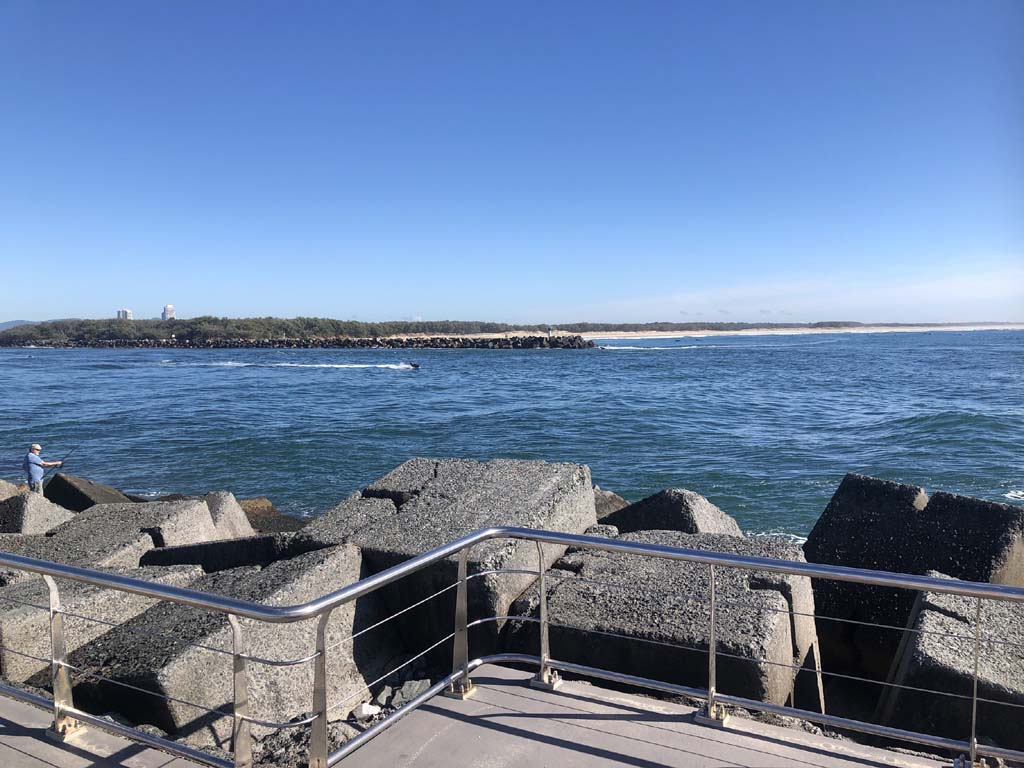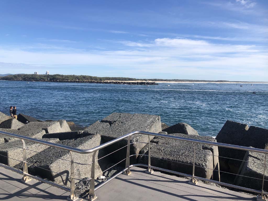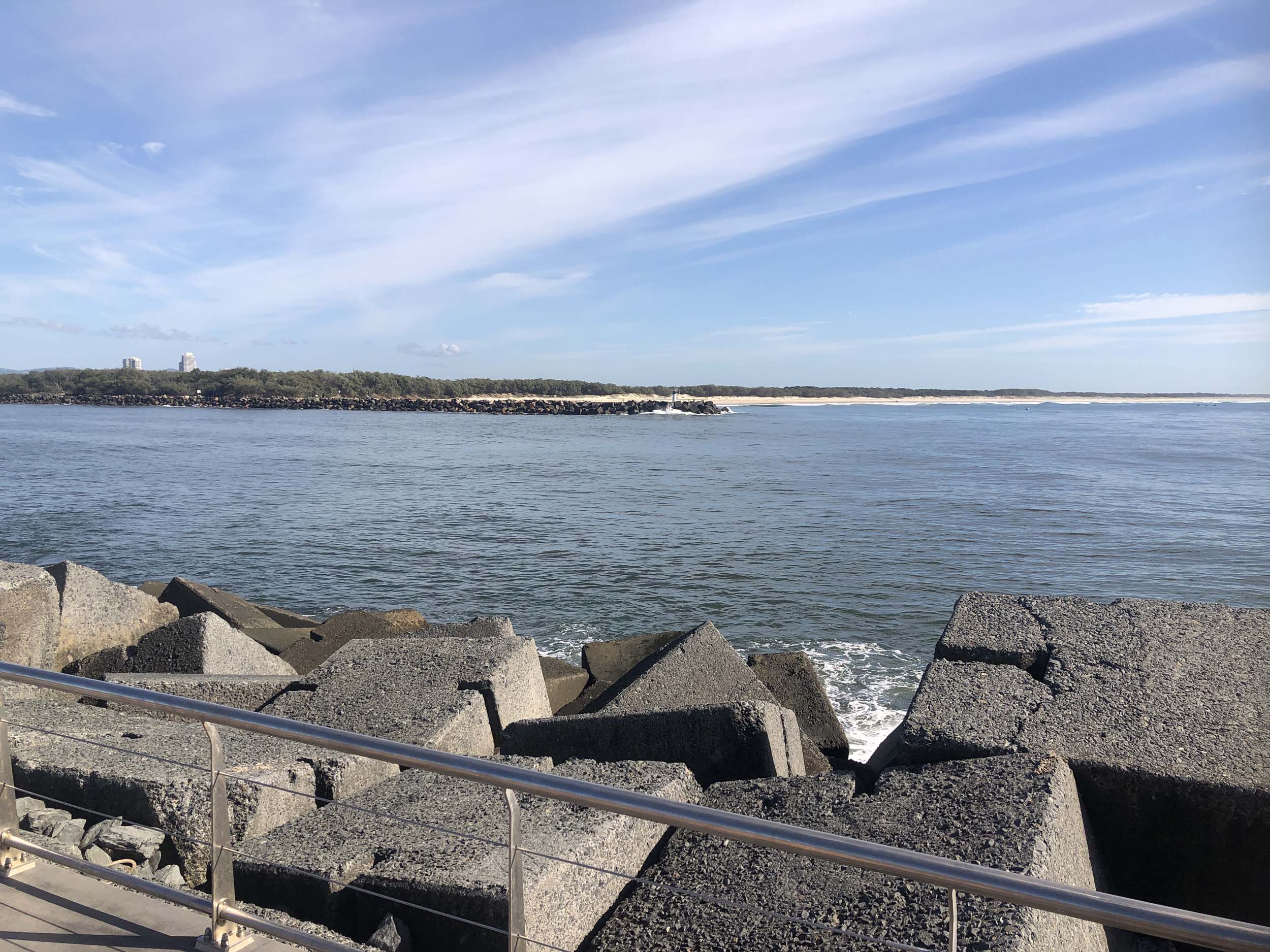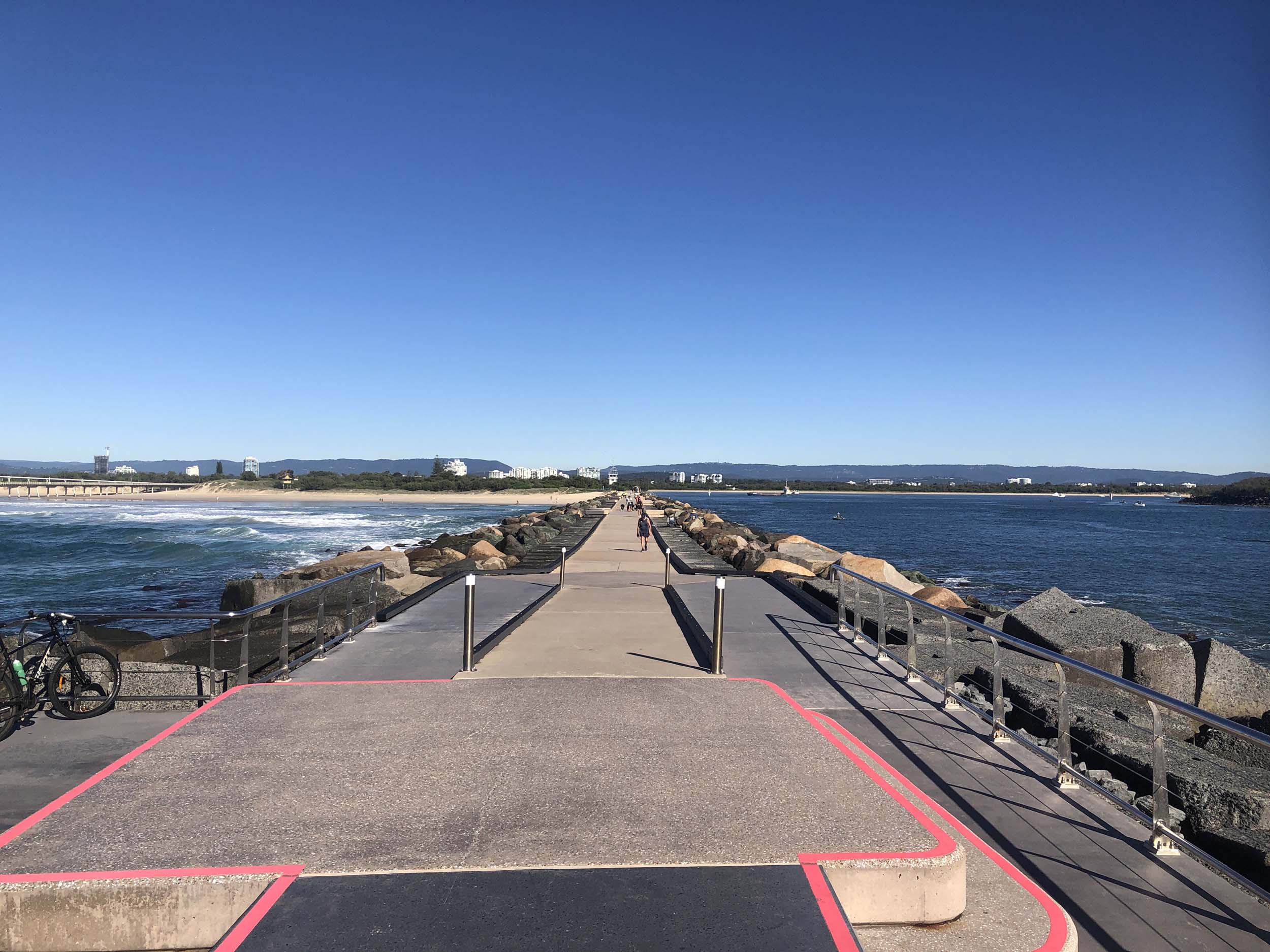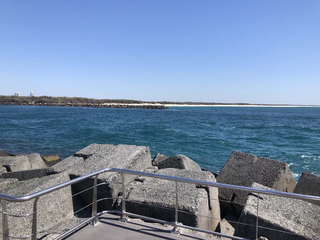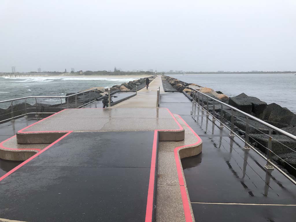 Over the Bridge at Narrowneck then along the Shared Path, towards The Seaway/Spit, via the jetties of Marina Mirage, a lap of the Seaworld Carpark, a lap of the Muriel Henchman carpark and finally made it to the tip of the Seawall/Spit. Stopped and took my photos and ate my banana, then rode to the tip of the Moondarewa Spit, took more photos.