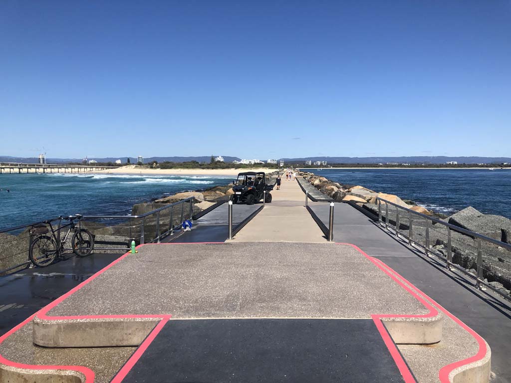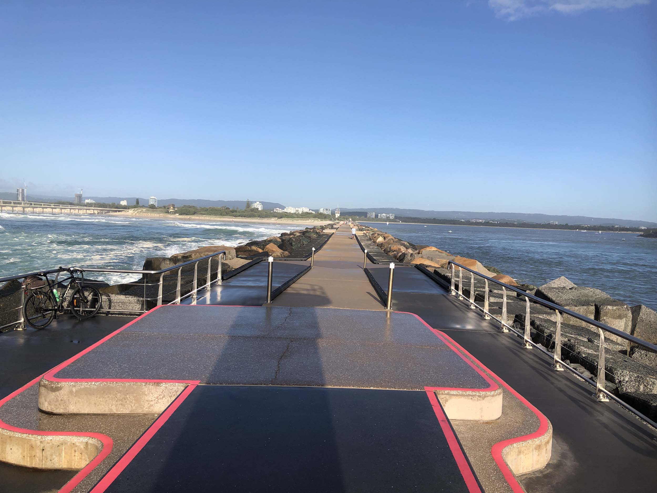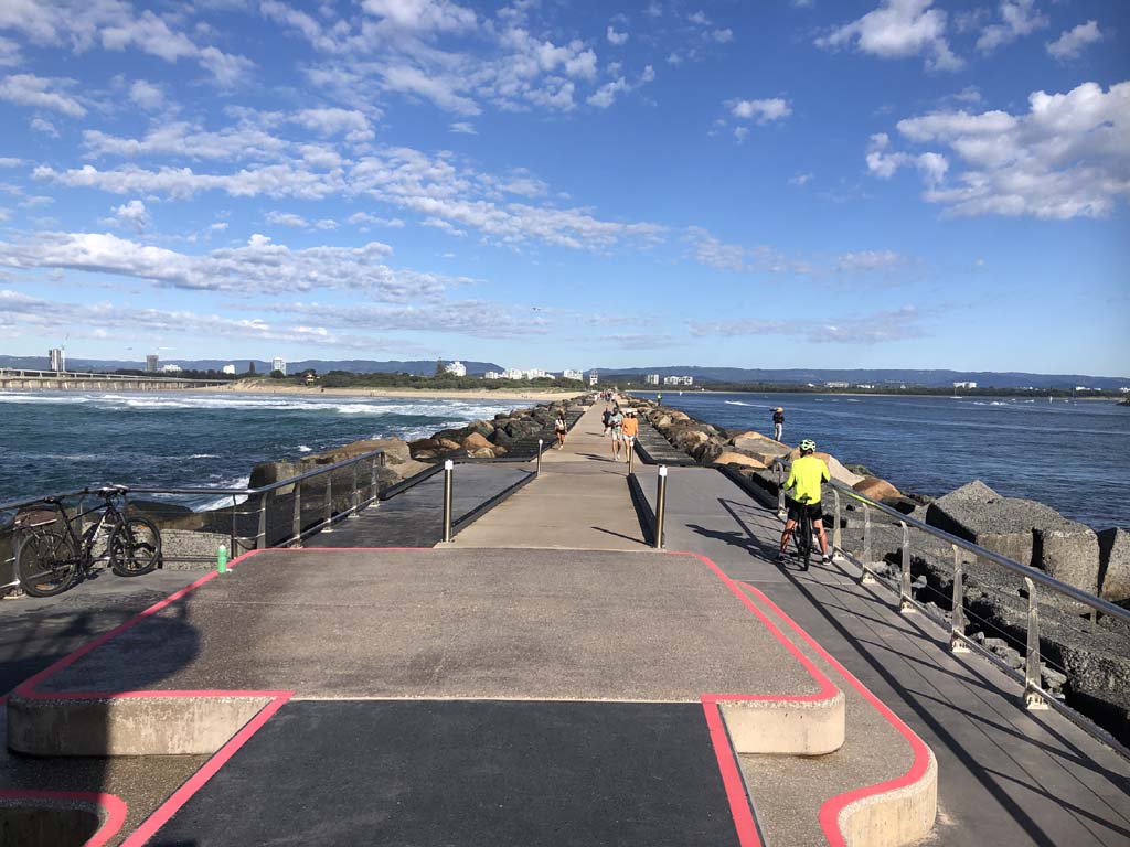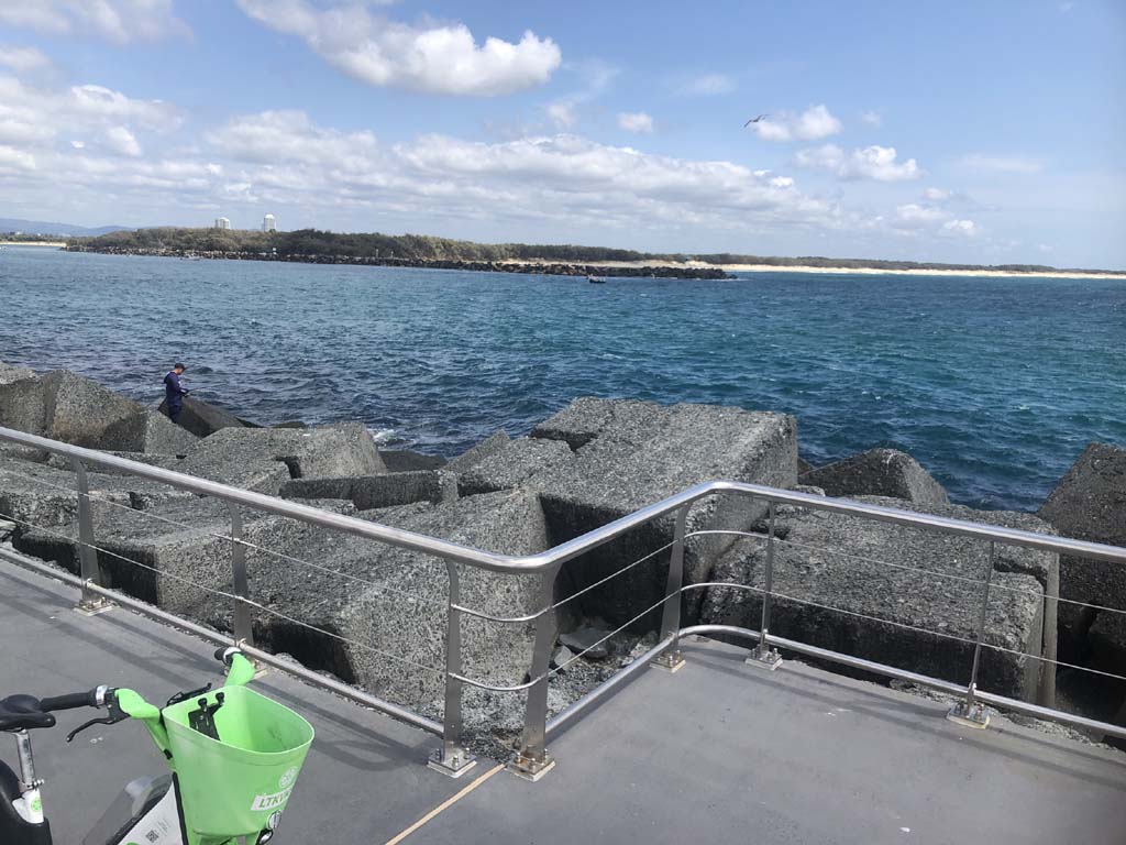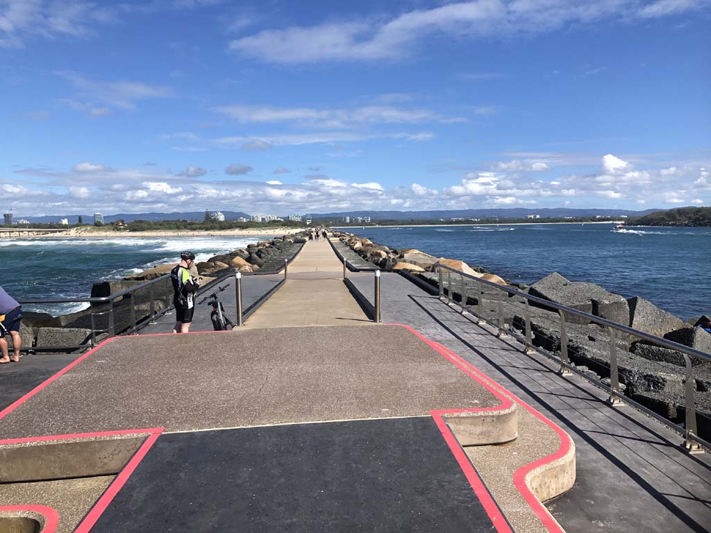 Continued riding to the tip of the Seawall/Spit. I took some photos and ate my roll, then rode to the tip of the Moondarewa Spit, took more photos and then rode back to the end of the Seaway/Spit. The workers were packing up after the 3 day Promiseland Music Festival. I noticed that there were about 20 surfers trying to catch waves between the Seaway/Spit and the Sanding Pumping Pier. I left The Spit, and continued along the Shared path that runs parallel to Seaworld Drive, back around the Marina Mirage jetty.