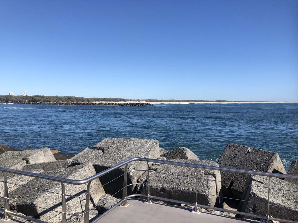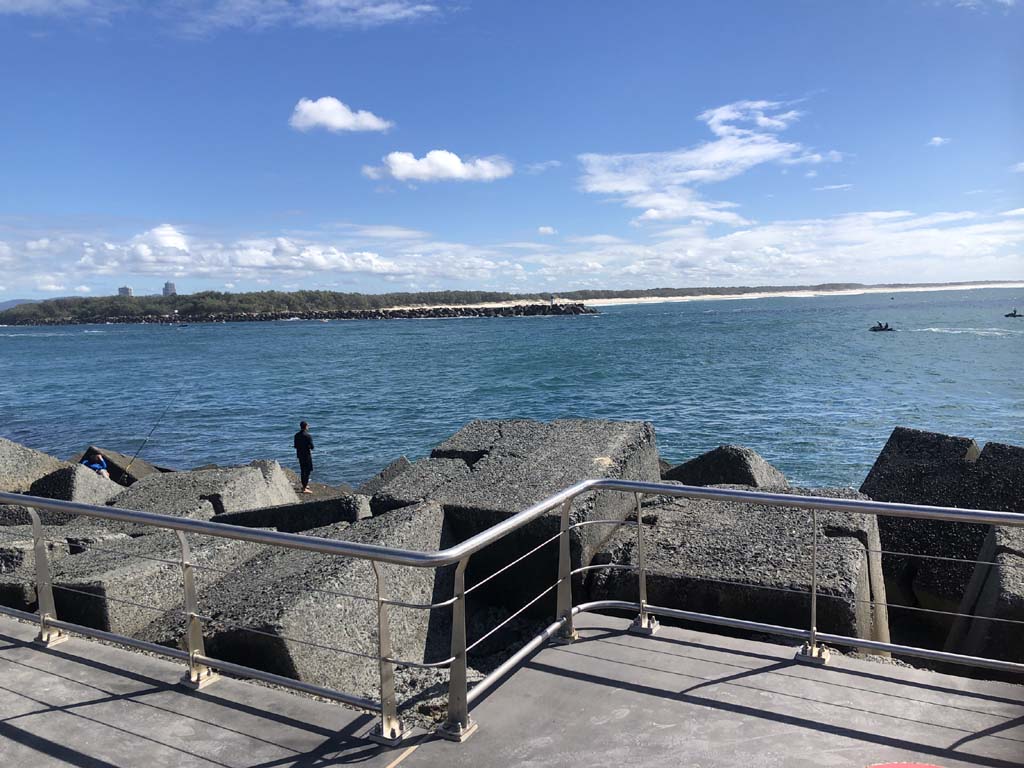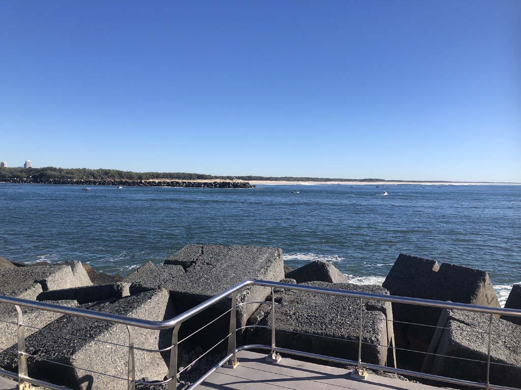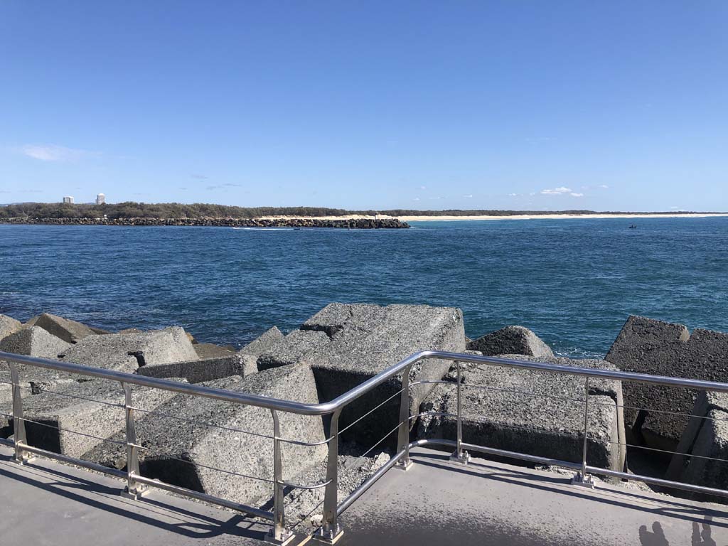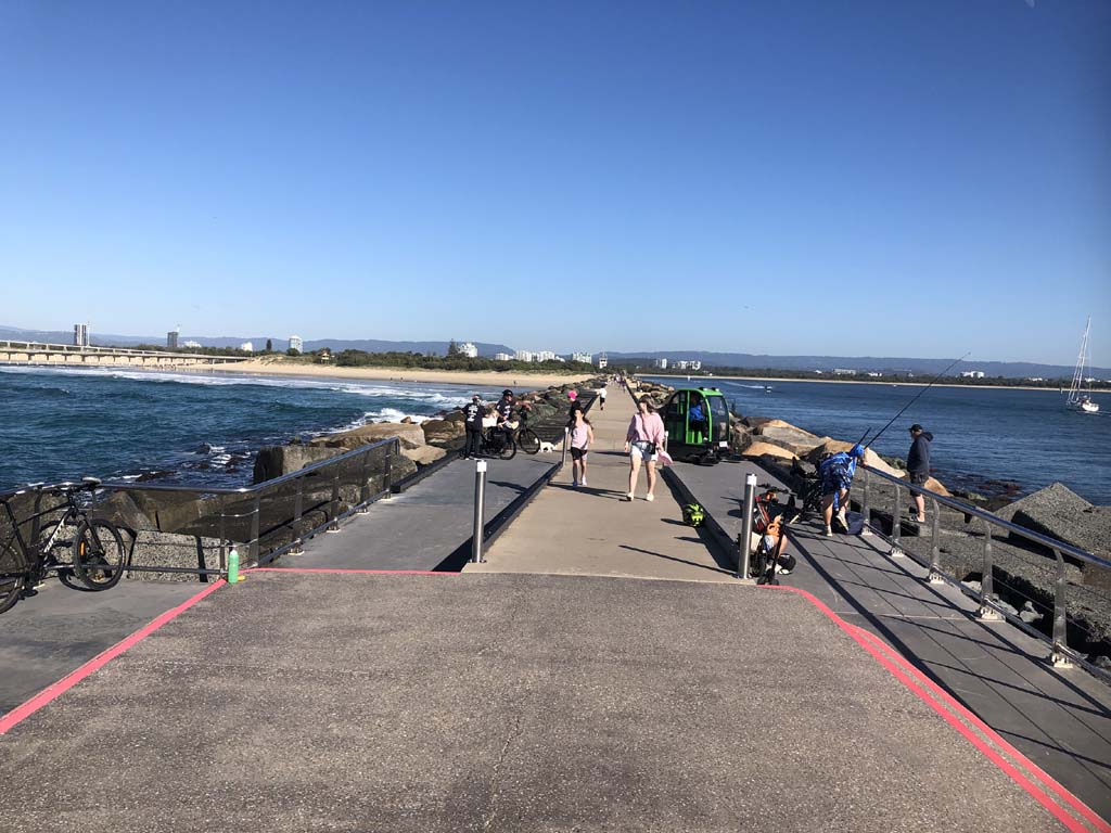 Continued riding to the tip of the Seawall/Spit. I took some photos and ate my roll, then rode to the tip of the Moondarewa Spit, took more photos and then rode back to the end of the Seaway/Spit. The workers were packing up after the 3 day Promiseland Music Festival. I noticed that there were about 20 surfers trying to catch waves between the Seaway/Spit and the Sanding Pumping Pier. I left The Spit, and continued along the Shared path that runs parallel to Seaworld Drive, back around the Marina Mirage jetty.