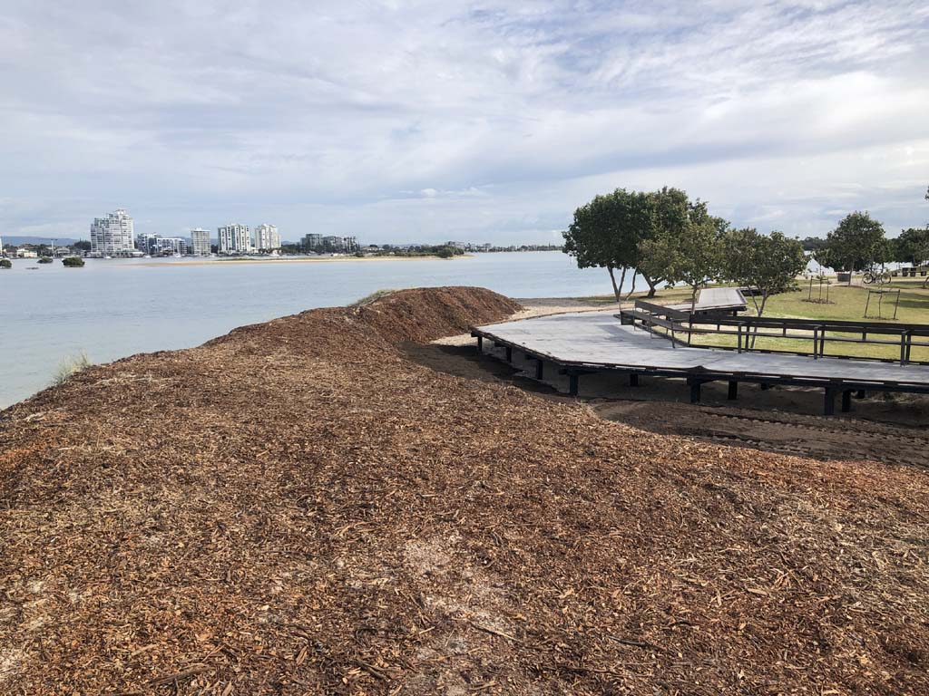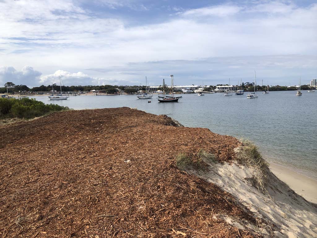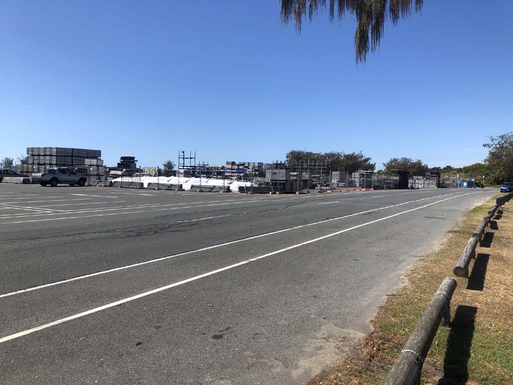 Continued riding to the tip of the Seawall/Spit. I took some photos and ate my banana, then rode to the tip of the Moondarewa Spit, took more photos and did another lap of both Spits. The council workers are adding more tanbark to the Moondarewa Spit. I left The Spit, and continued along the Shared path that runs parallel to Seaworld Drive, took a photo of the Seaworld carpark, 12 minutes after opening time, back along the Marina Mirage jetty, took photos.