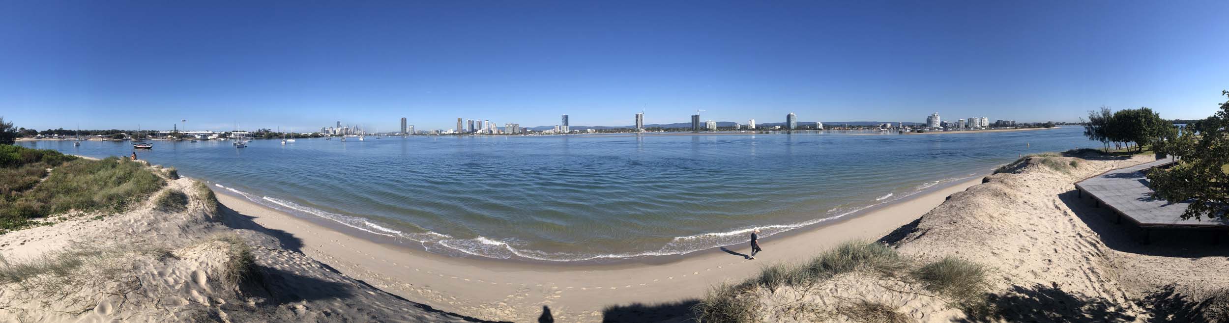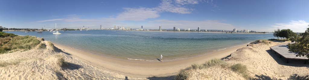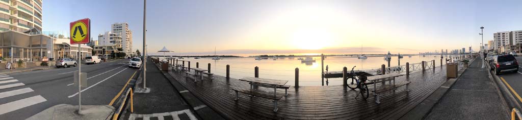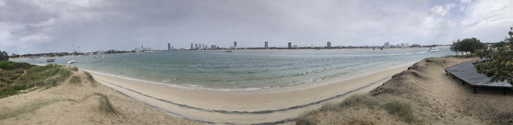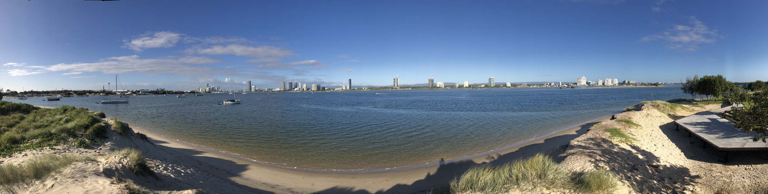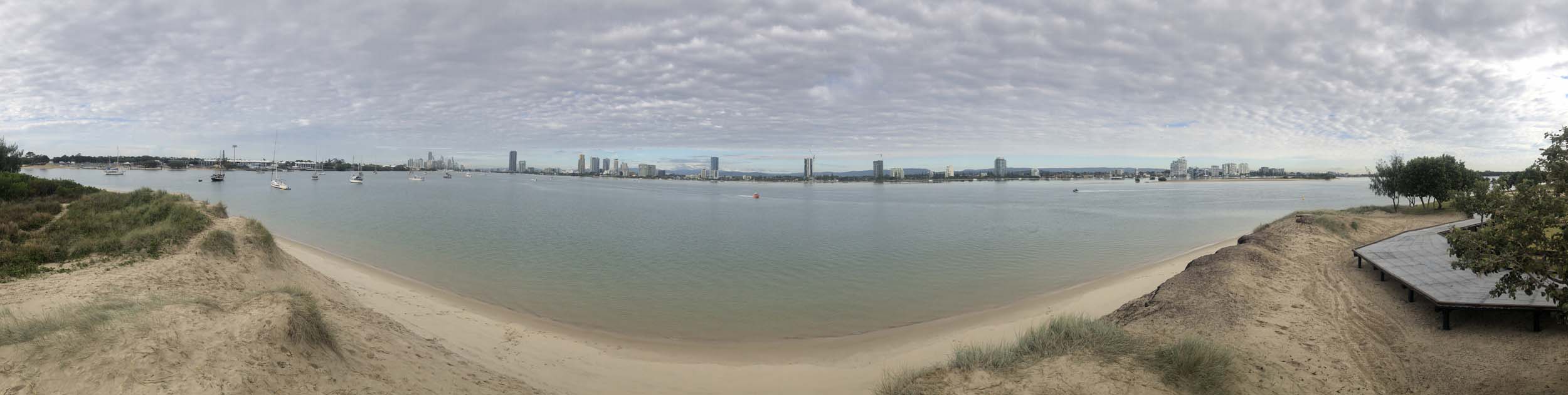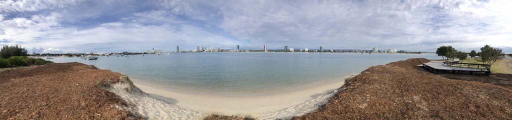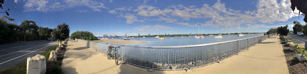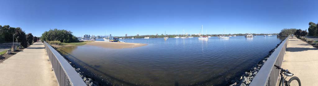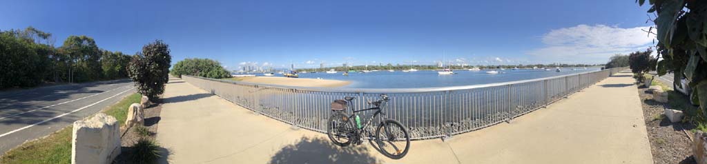 I left home about 6:28am, and rode Northward, to my Lands End turnaround point. Continued through the Broadwater Parklands over the Sundale Bridge and turned left and stopped at the Super Yacht jetty. Venus (Mrs Steve Jobs - Apple) was still moored there, while Clive Palmer's Australia has gone. Continued through the Southport YC, along the jetties at Marina Mirage and then around the edge of the Seaworld carpark, stopped and took a panoramic photo of Bum's Bay. It looked so beautiful this morning, with 2 Black Swans swimming along, then continued along the shared path to The Spit.