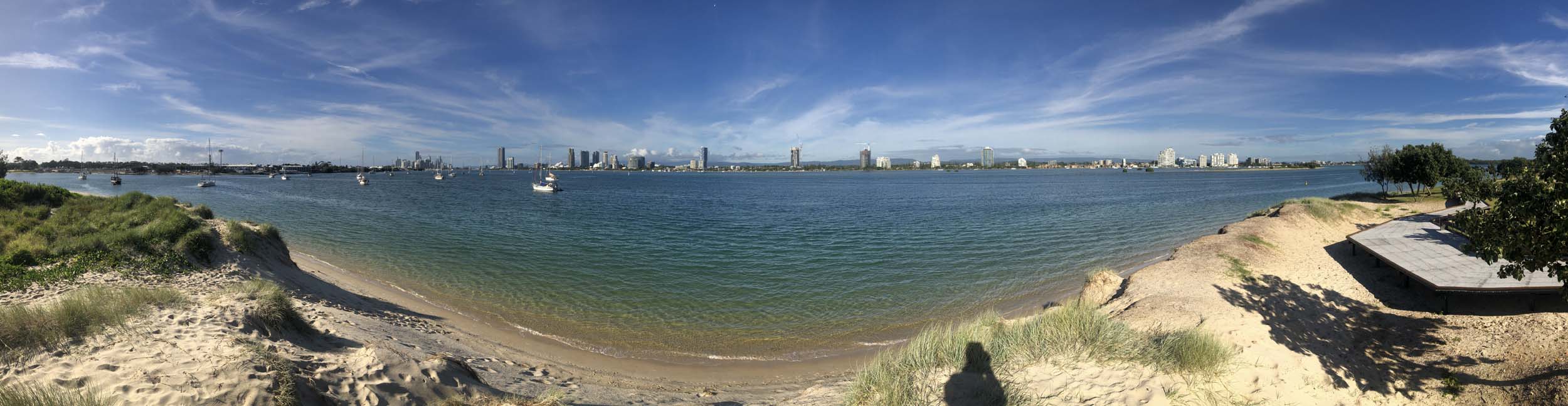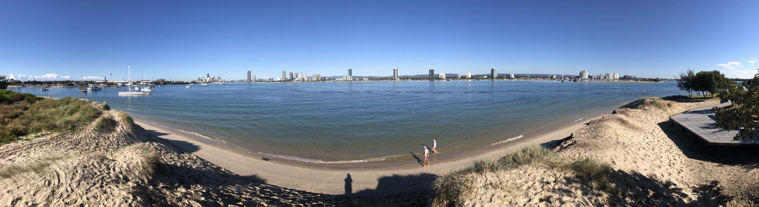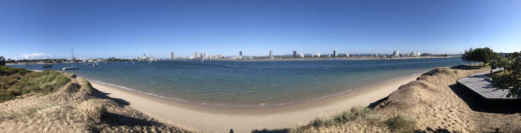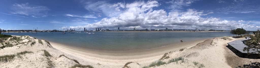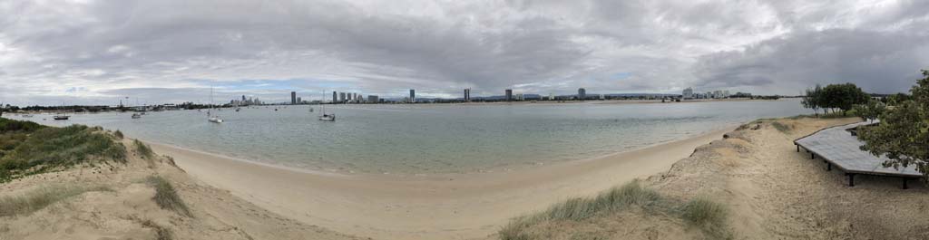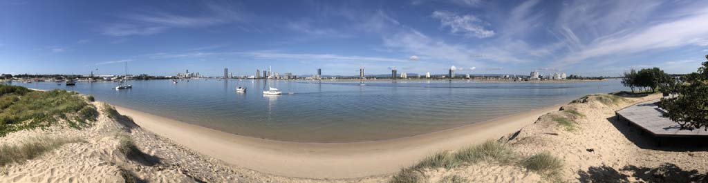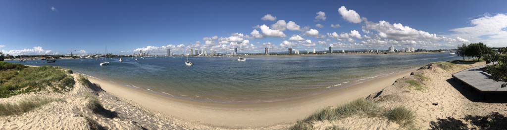 I left home about 6:28am, and rode Northward, to my Lands End turnaround point. Continued through the Broadwater Parklands over the Sundale Bridge and turned left and stopped at the Super Yacht jetty. Venus (Mrs Steve Jobs - Apple) was still moored there, while Clive Palmer's Australia has gone. Continued through the Southport YC, along the jetties at Marina Mirage and then around the edge of the Seaworld carpark, stopped and took a panoramic photo of Bum's Bay. It looked so beautiful this morning, with 2 Black Swans swimming along, then continued along the shared path to The Spit.