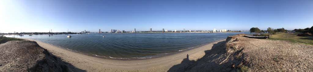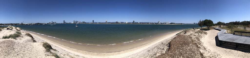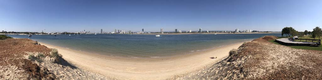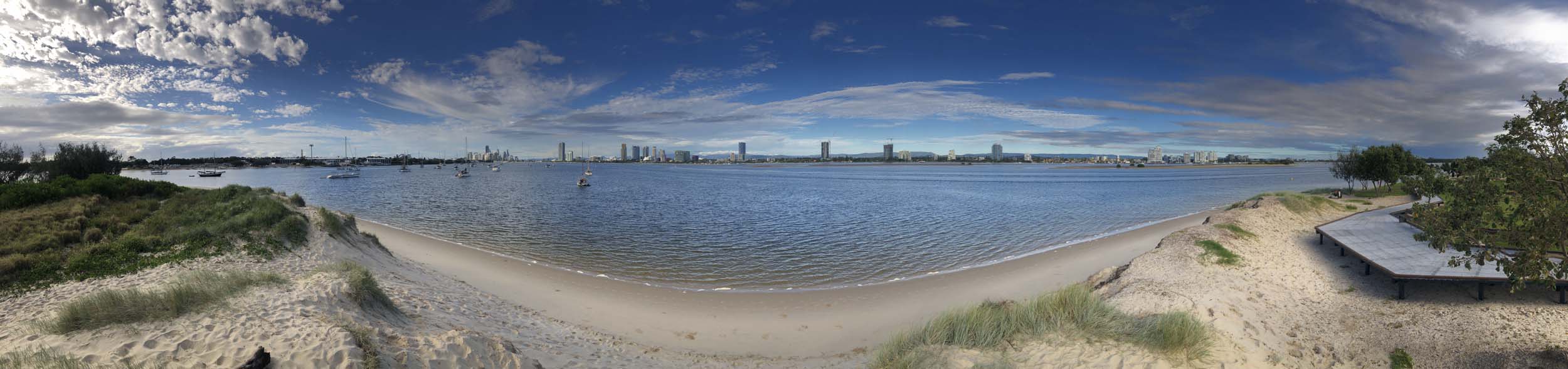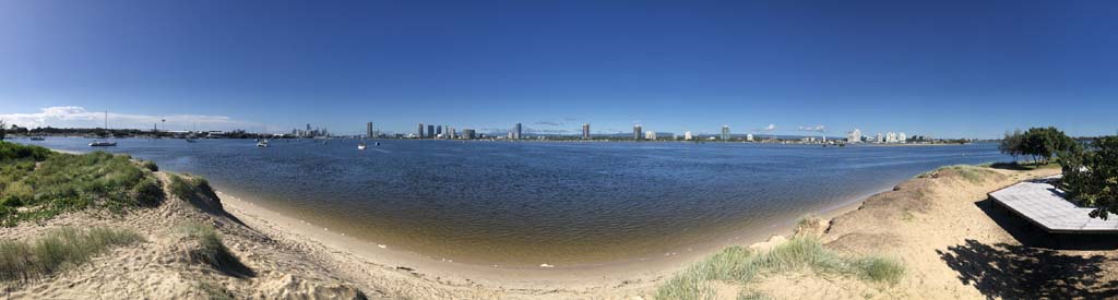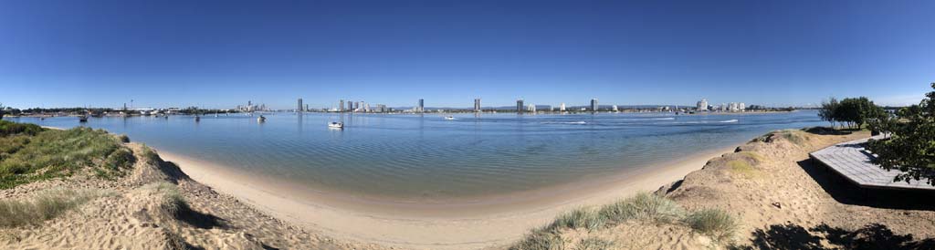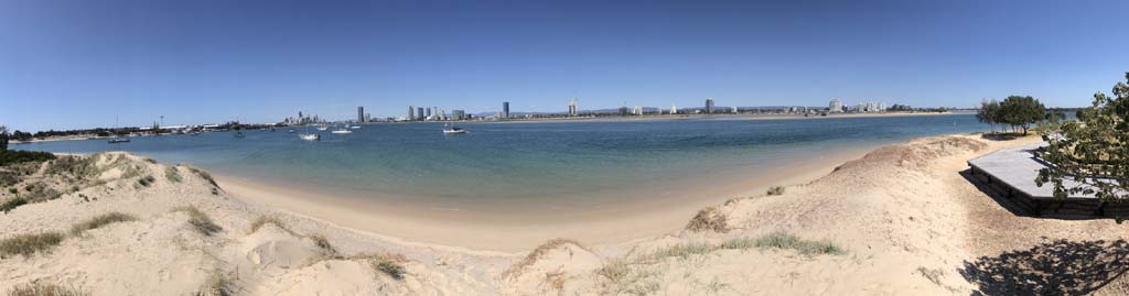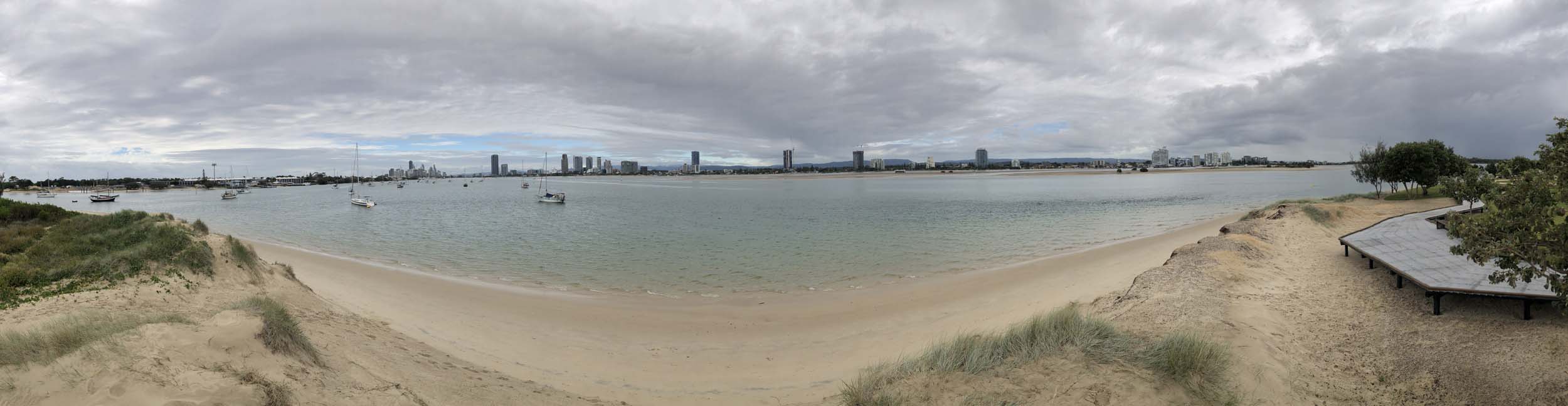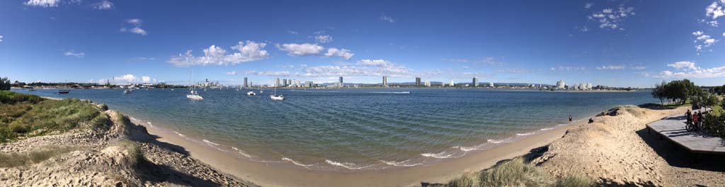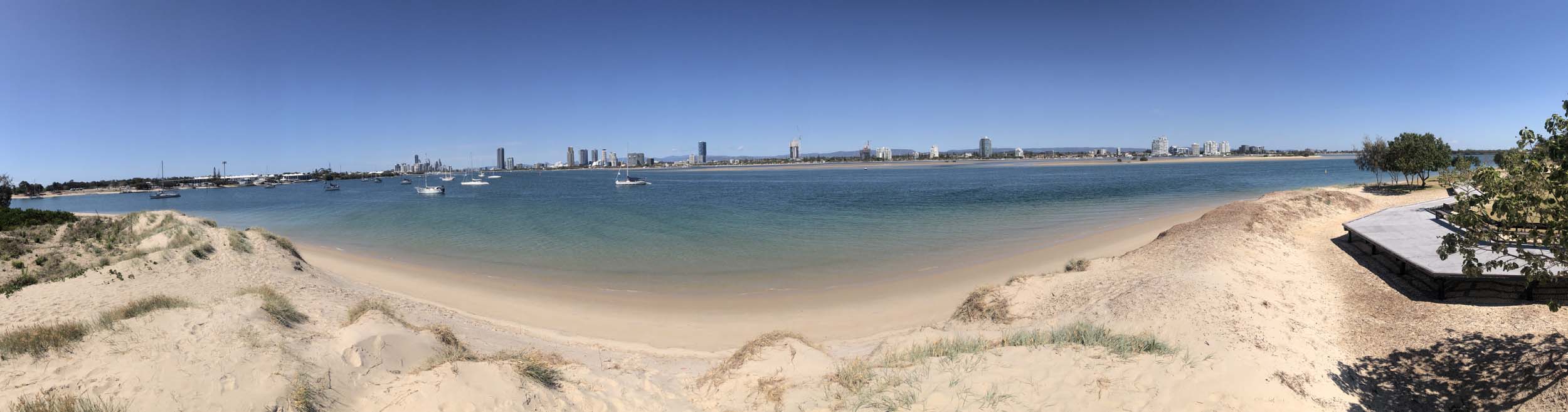 I left home about 6:28am, and rode Northward, to my Lands End turnaround point. Continued through the Broadwater Parklands over the Sundale Bridge and turned left and stopped at the Super Yacht jetty. Venus (Mrs Steve Jobs - Apple) was still moored there, while Clive Palmer's Australia has gone. Continued through the Southport YC, along the jetties at Marina Mirage and then around the edge of the Seaworld carpark, stopped and took a panoramic photo of Bum's Bay. It looked so beautiful this morning, with 2 Black Swans swimming along, then continued along the shared path to The Spit.