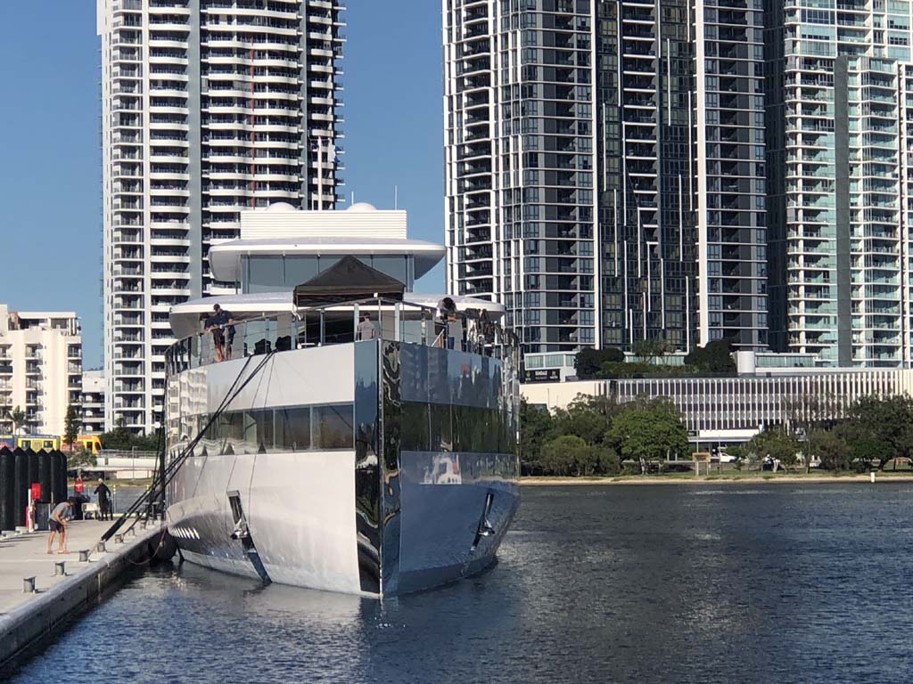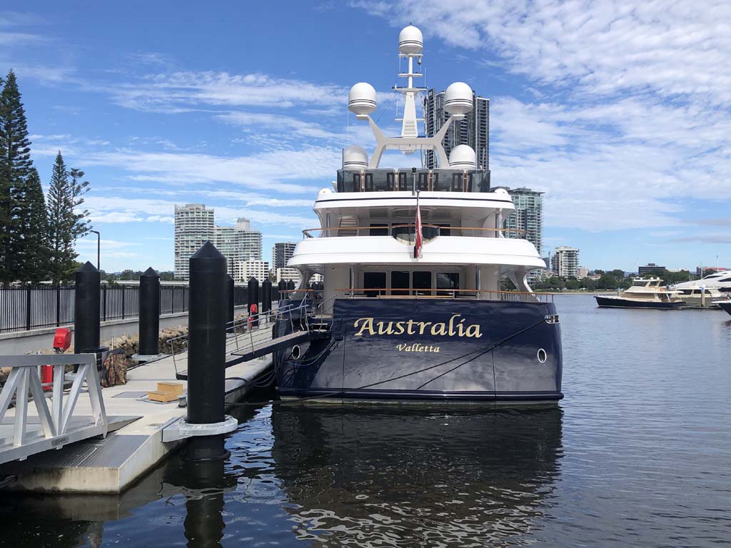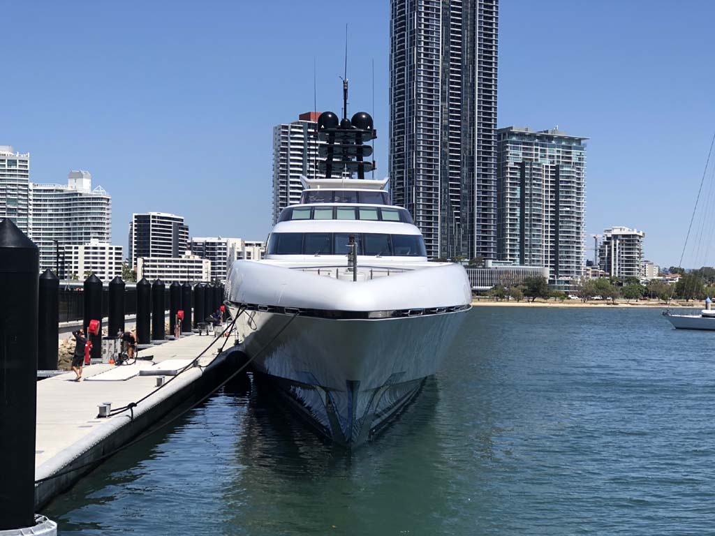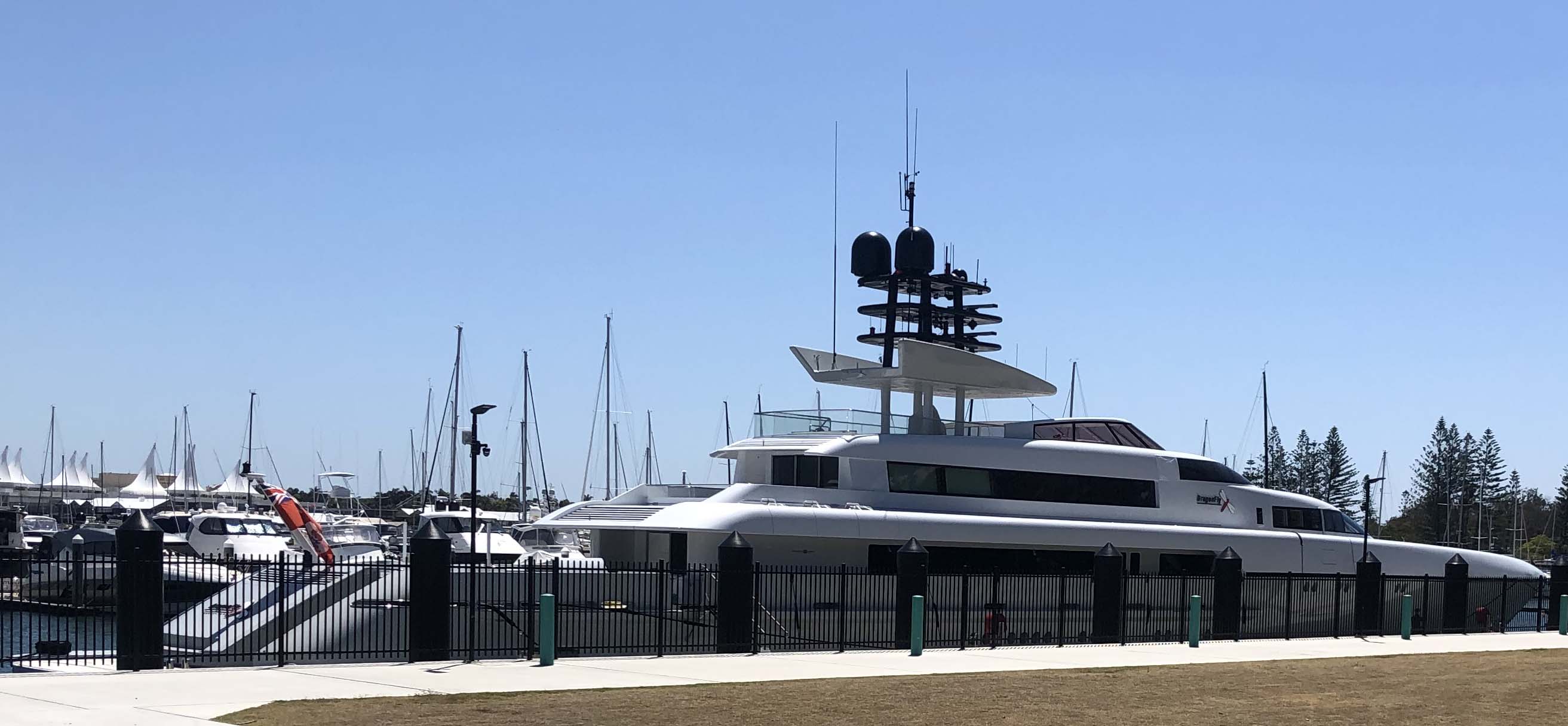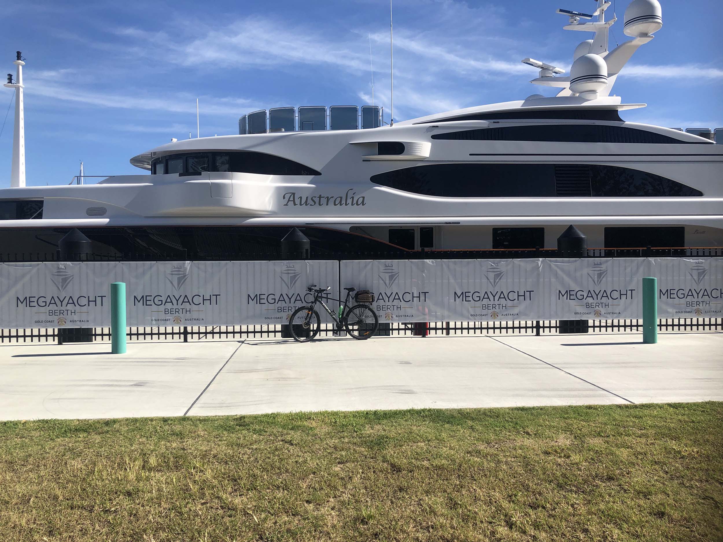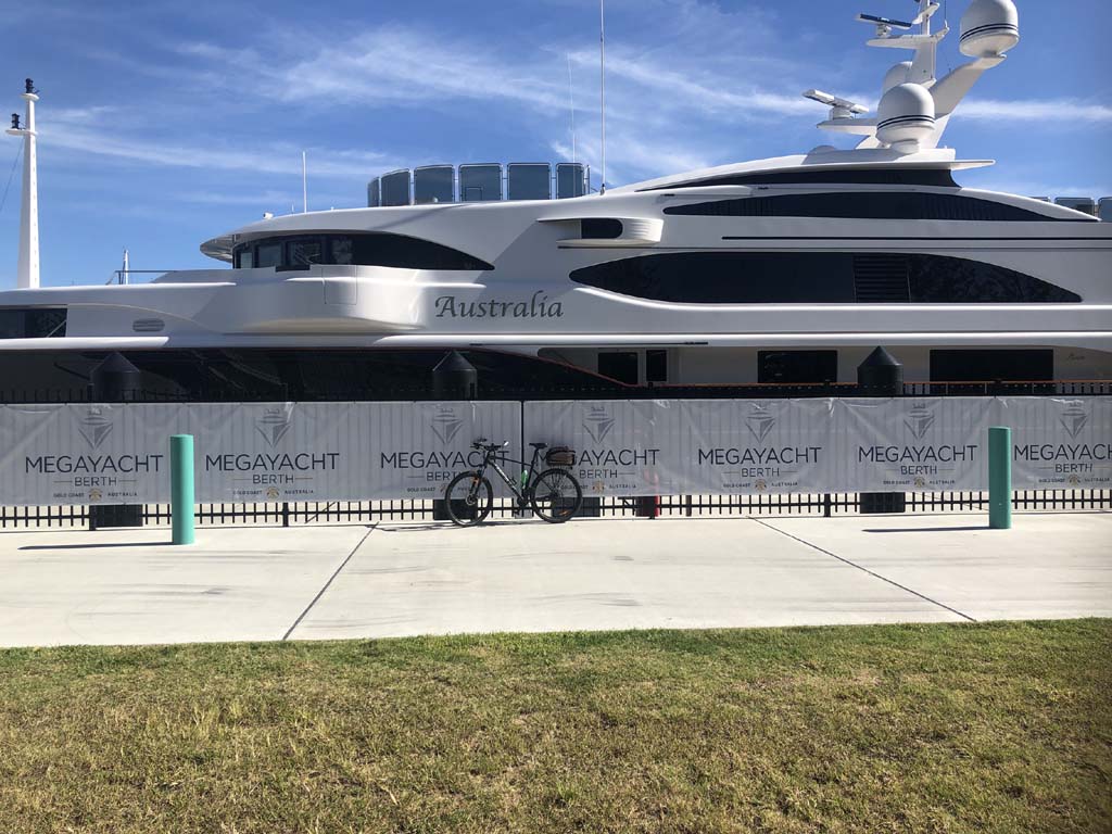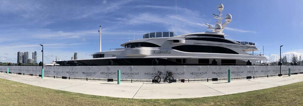 I rode Northward, to my Lands End/Biggera Creek turnaround point. Continued through the Broadwater Parklands, which is being set up for this weekends "gold Coast Show", then over the Sundale Bridge and turned left and stopped at the Super Yacht jetty. Evan Spiegel's $200m yacht "Bliss" is still moored at the Super Yacht jetty. Clive Palmer's $40m "Australia" was also moored there BUT not at the Super Yacht jetty as there was no room left for other boats. Bliss is 95m in length, so it is bloody huge.