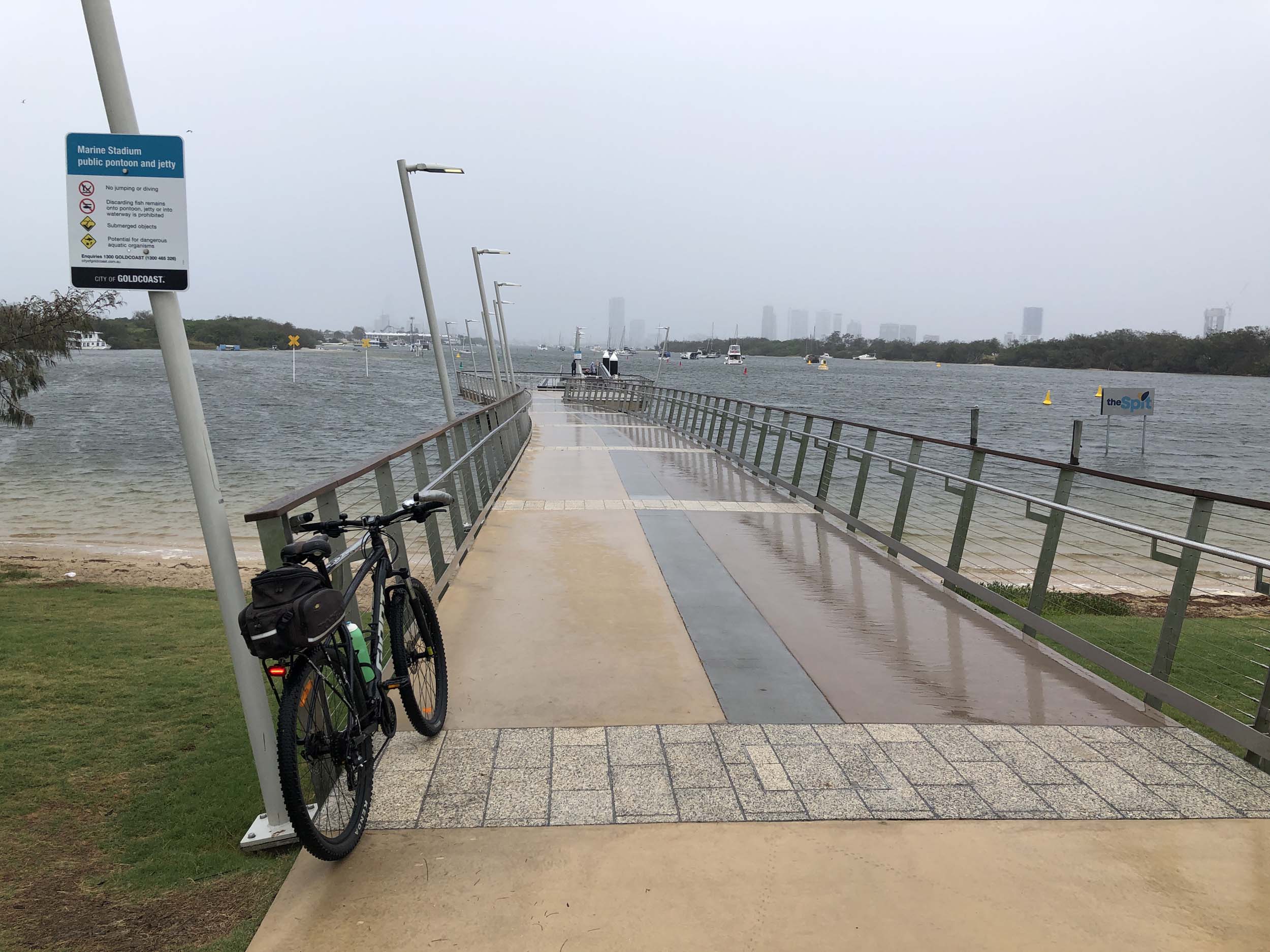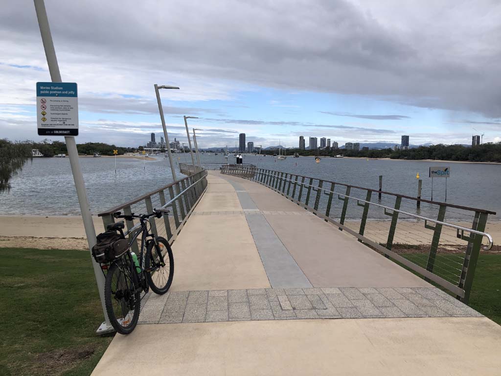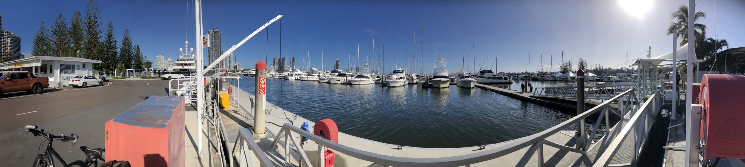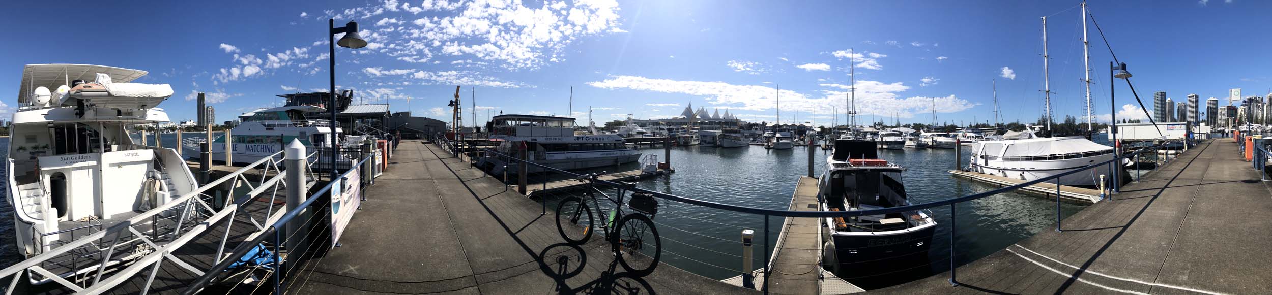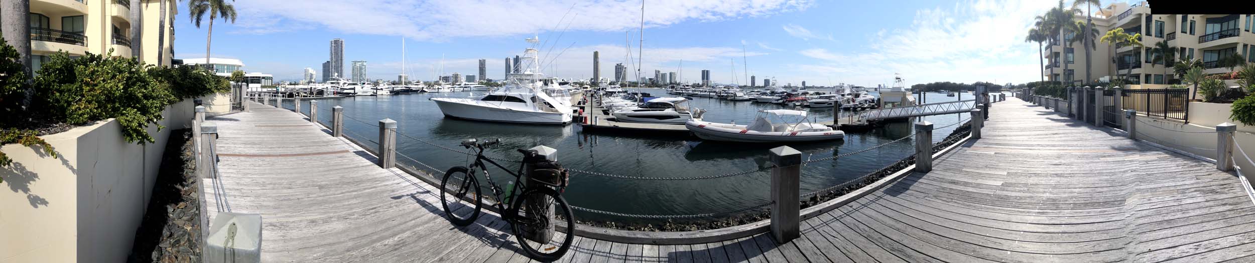 I rode Northward, to my Lands End/Biggera Creek turnaround point. Continued through the Broadwater Parklands, then over the Sundale Bridge and turned left and stopped at the Super Yacht jetty. No boats moored there.