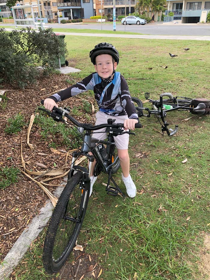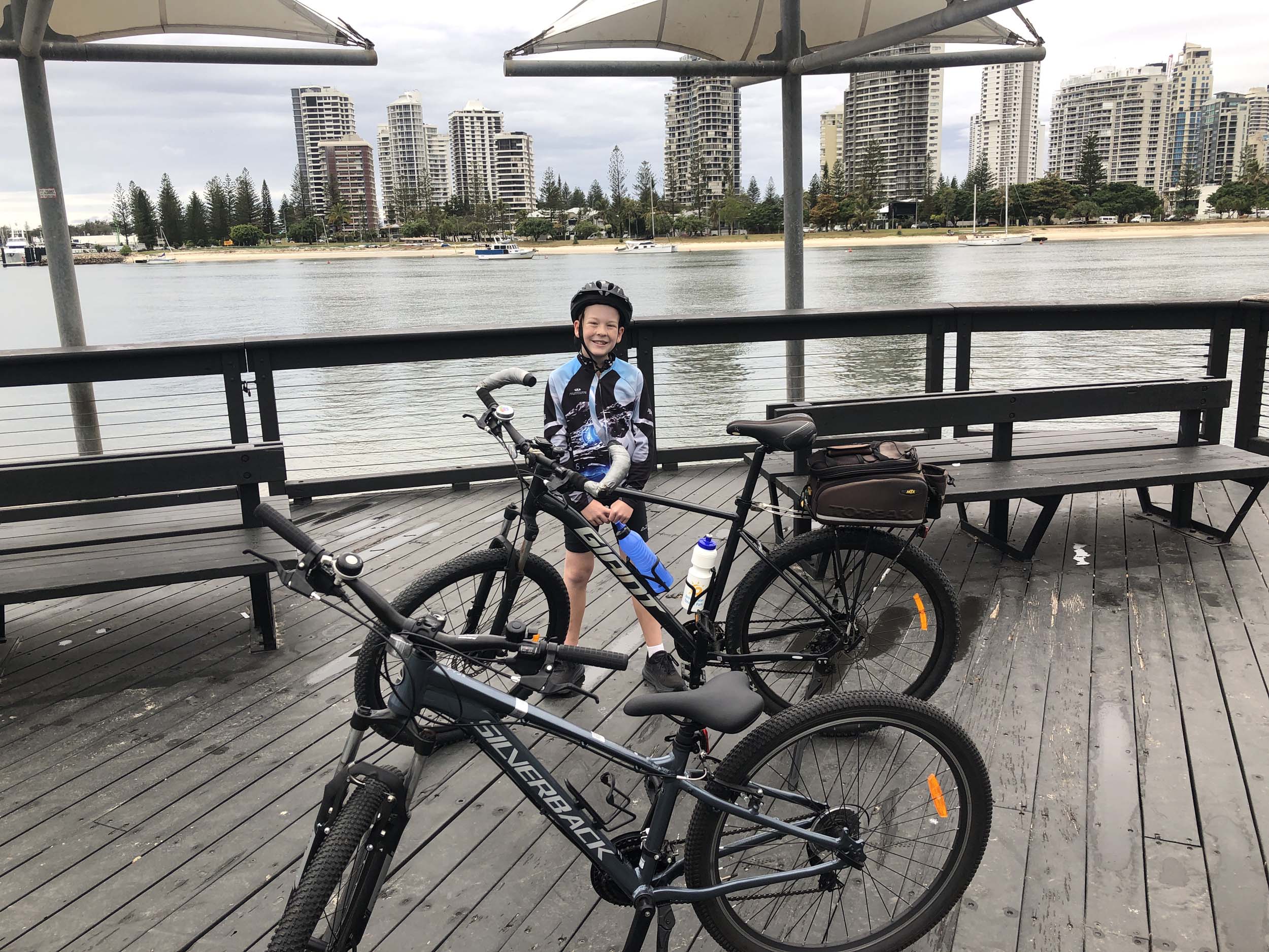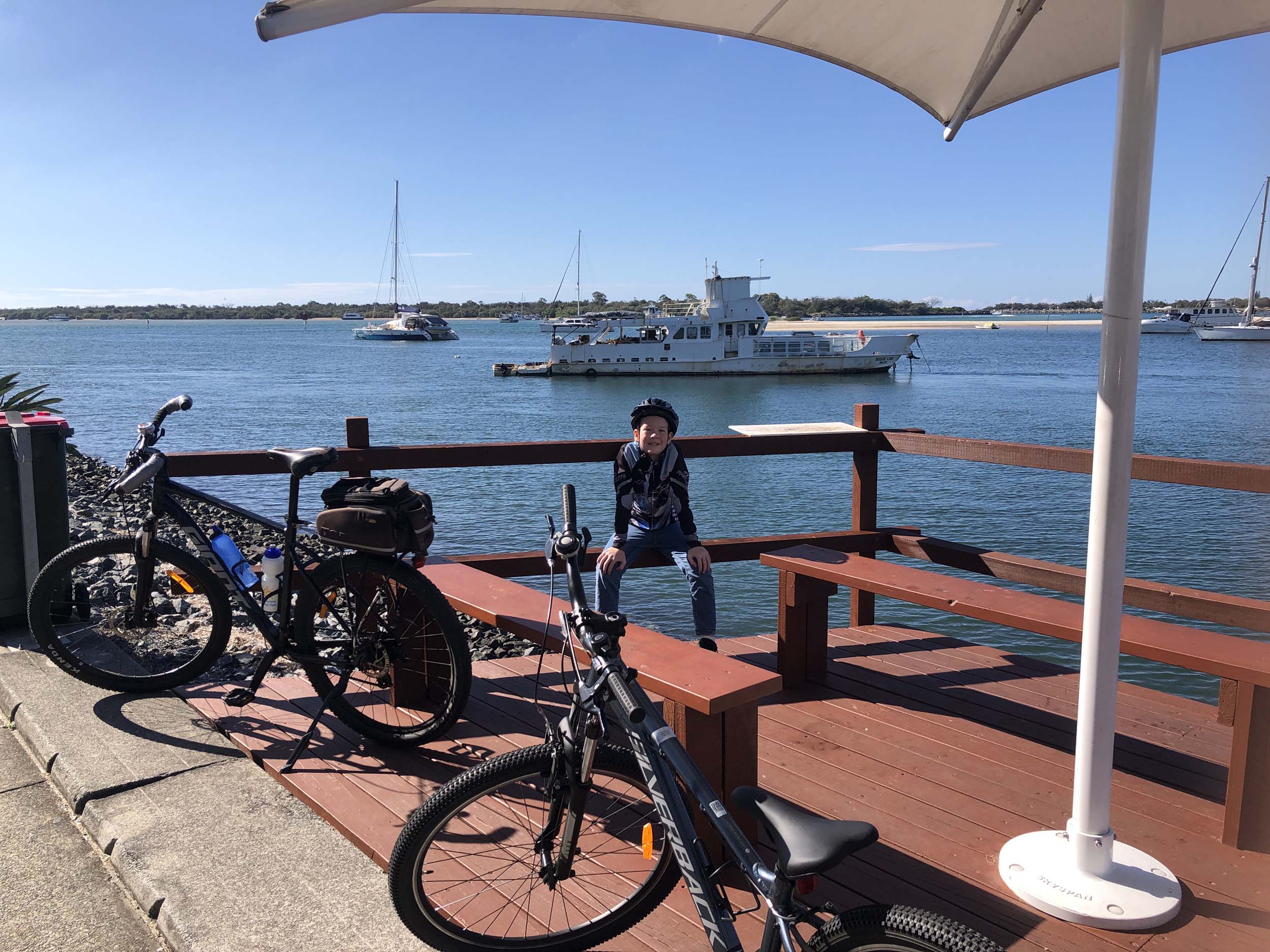 This ride, we concentrated on emergency braking. Mase handled this very well. The 1st emergency braking, Mase stopped on a sixpence, while a larger gentleman (me) had to swerve to miss him. All good. We also concentrated on Mase getting used to changing his front gears. We will concentrate of his rear gears next ride. As we rode back to Biggera Creek, Mase liked changing the front gears into an easier gear when riding into the wind.