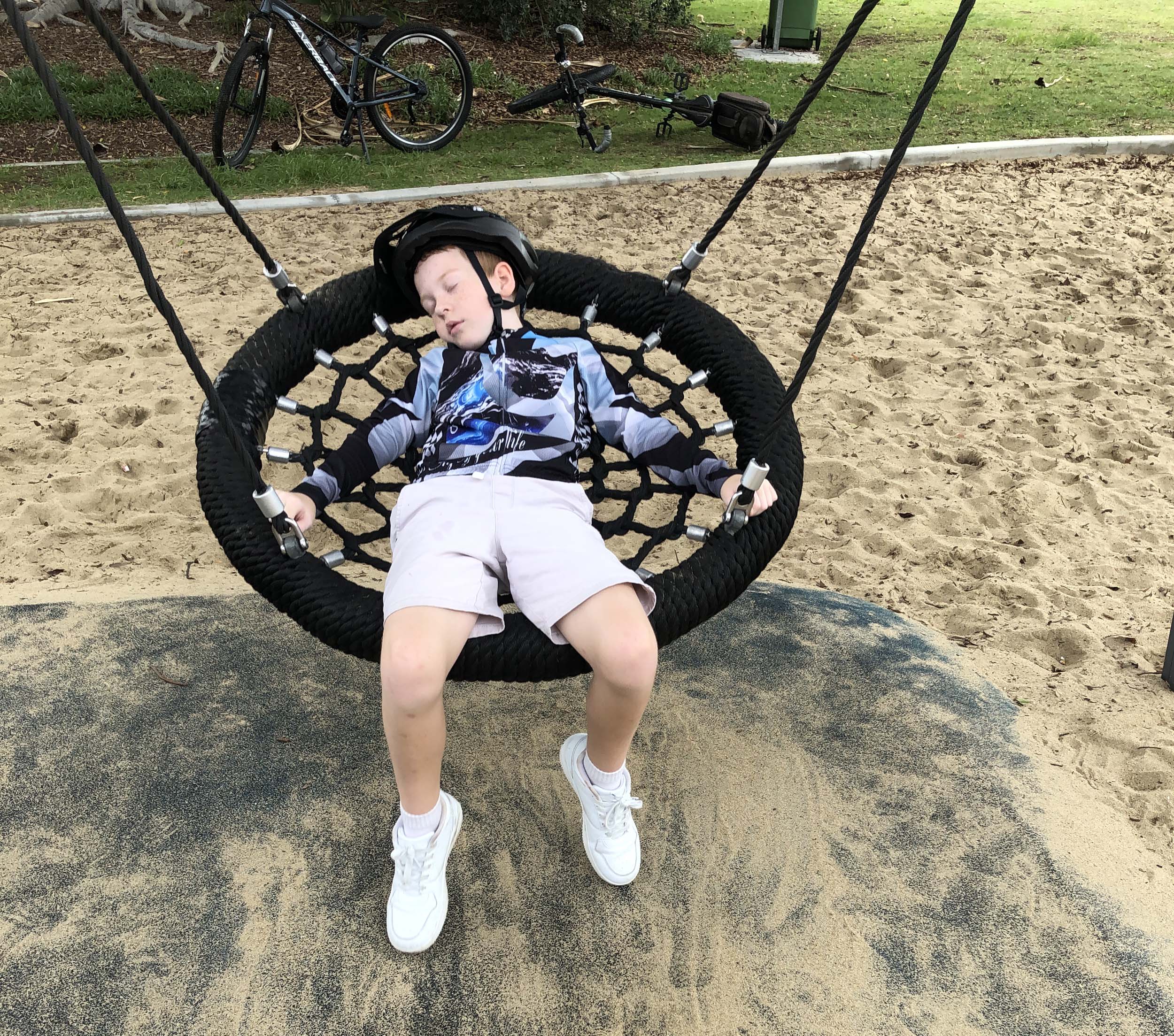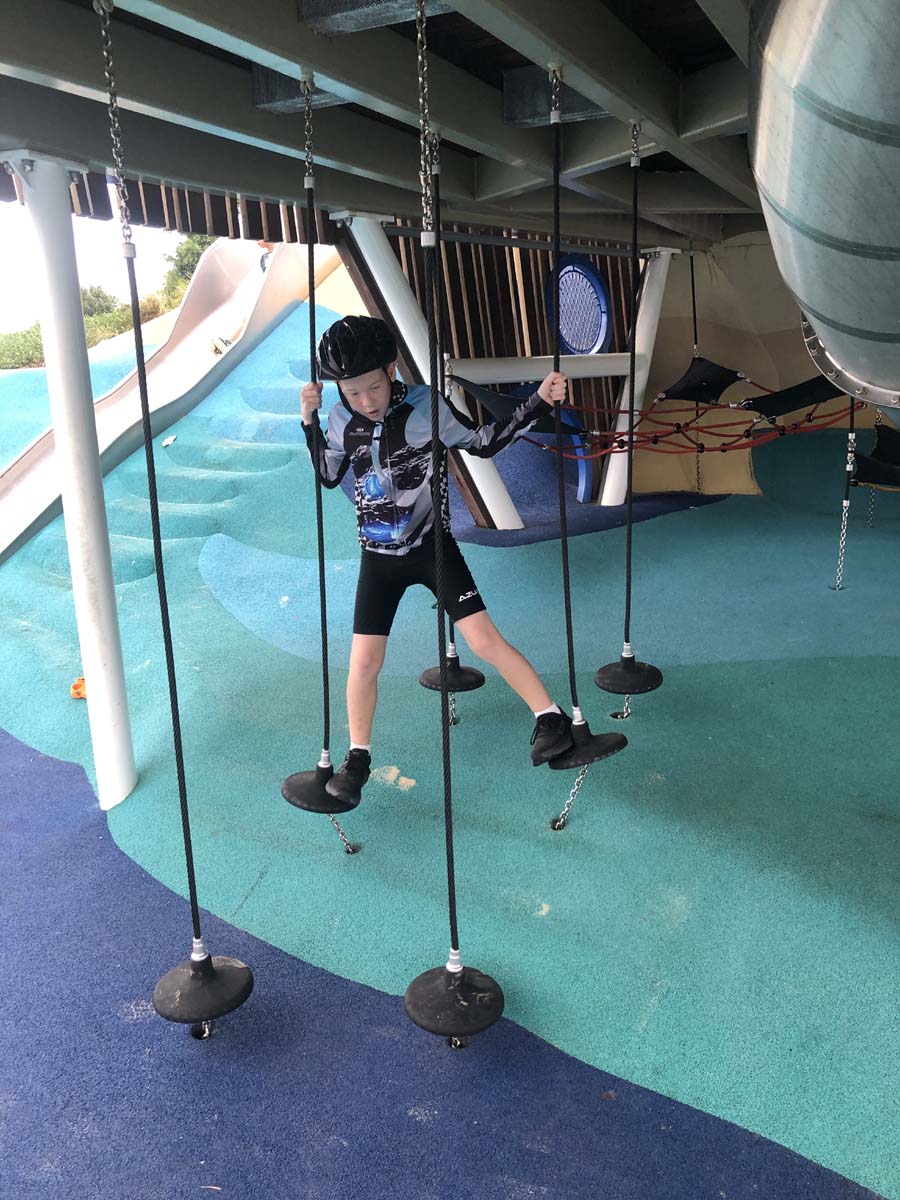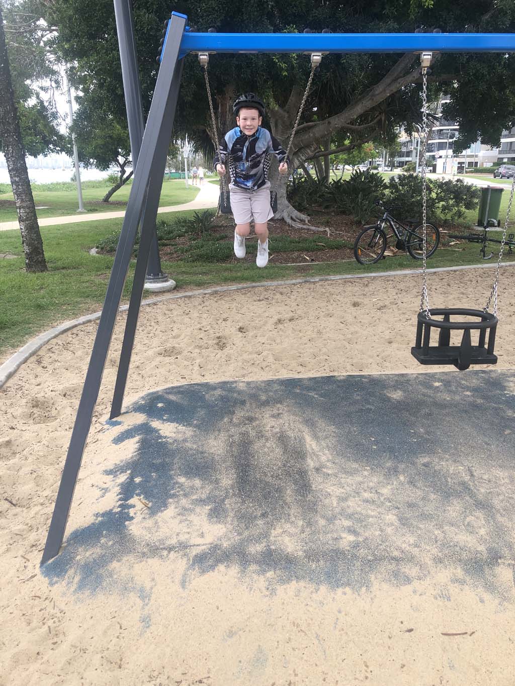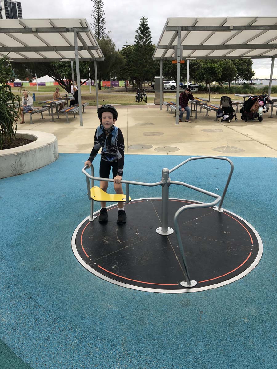 We managed a lap when Mase stopped, to test the playground near Biggera Creek. It passed. I said do you want to ride another 2 laps, he said 1 more would suit him. He appeared a bit buggered, check out his photo on the 'swing thingo'