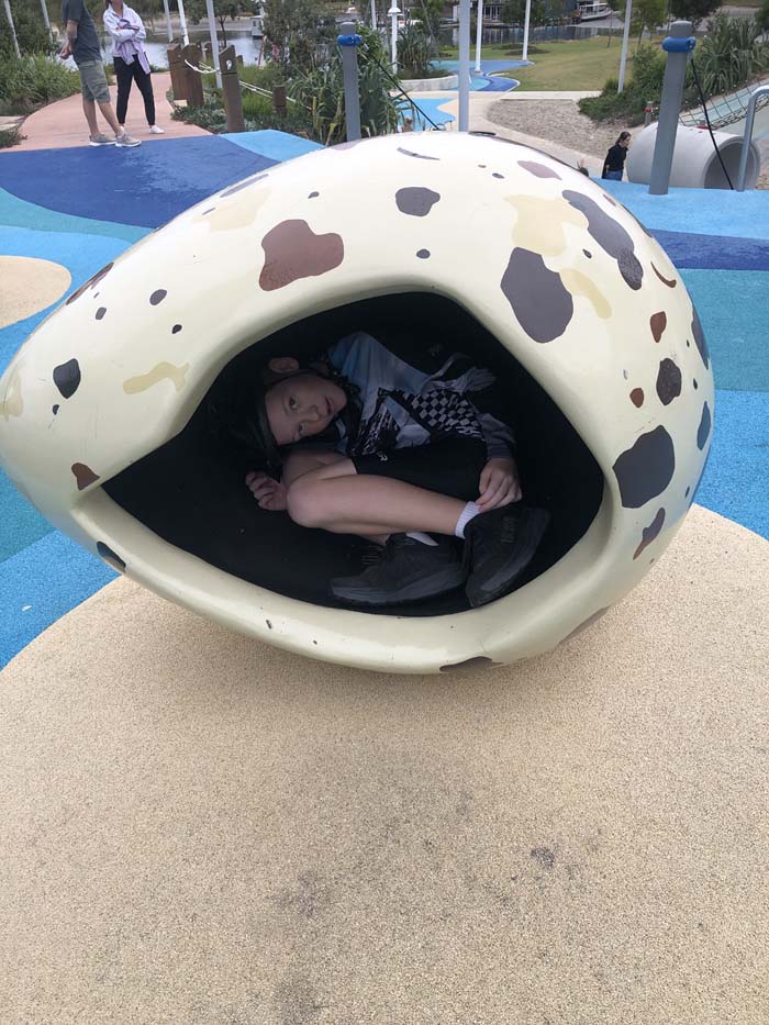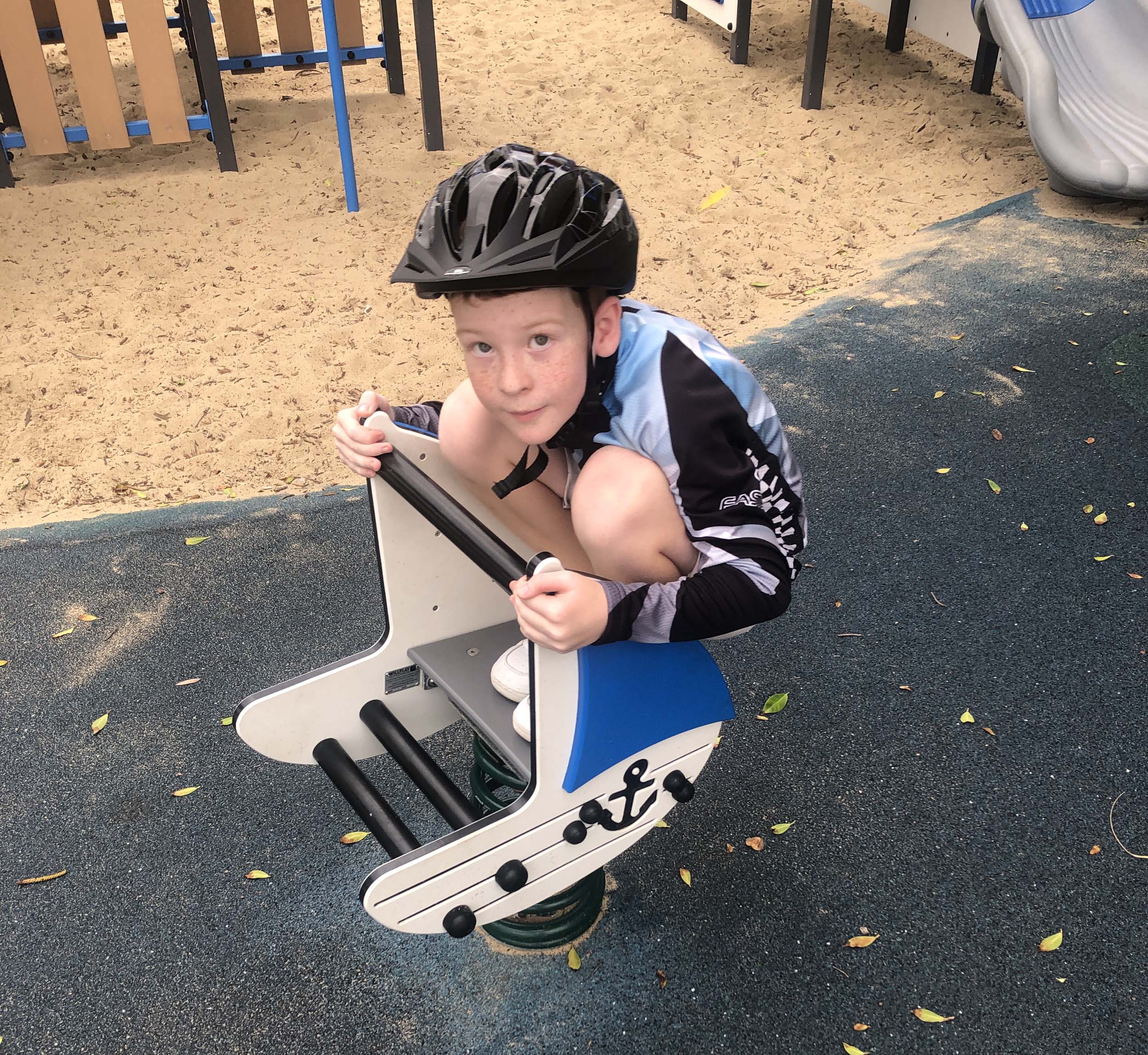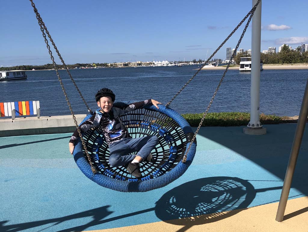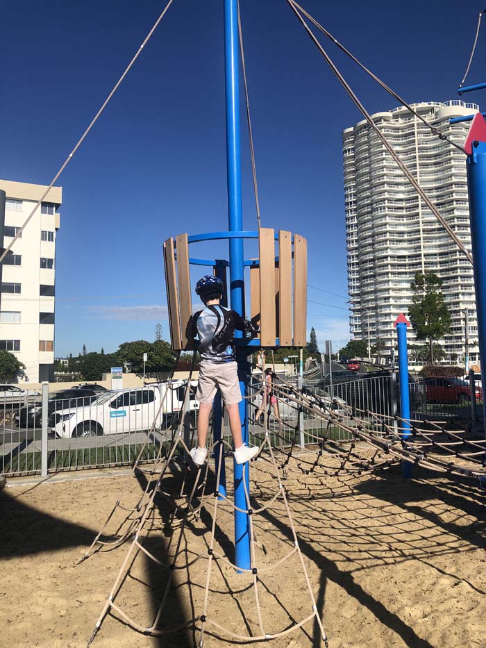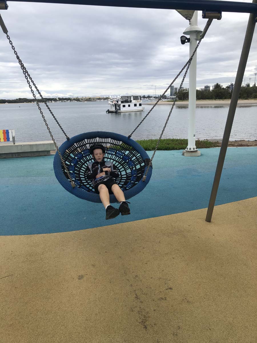 We managed a lap when Mase stopped, to test the playground near Biggera Creek. It passed. I said do you want to ride another 2 laps, he said 1 more would suit him. He appeared a bit buggered, check out his photo on the 'swing thingo'
