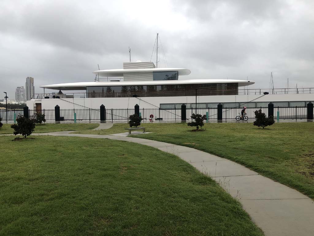 I rode Northward, to my Lands End turnaround point. Continued through the Broadwater Parklands over the Sundale Bridge and turned left and stopped at the Super Yacht jetty. Clive Palmer's Australia was still moored at the jetty. Continued through the Southport YC, along the jetties at Marina Mirage and then around the edge of the Seaworld carpark, stopped and took a photo, then continued along the shared path to The Spit.