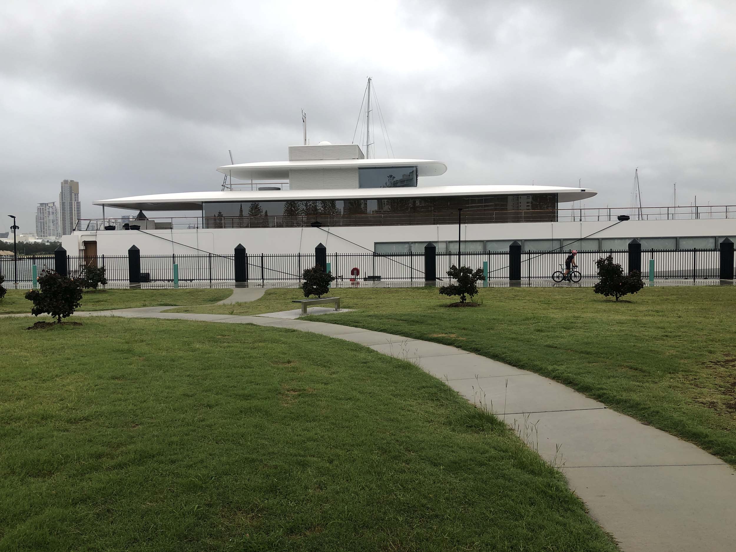 I left home about 6:51am, and rode Northward, to my Lands End turnaround point. Continued through the Broadwater Parklands over the Sundale Bridge and turned left and stopped at the Super Yacht jetty. Venus (Mrs Steve Jobs - Apple) was still moored there. Continued through the Southport YC, along the jetties at Marina Mirage and then around the edge of the Seaworld carpark, stopped and took a photo, then continued along the shared path to The Spit.
