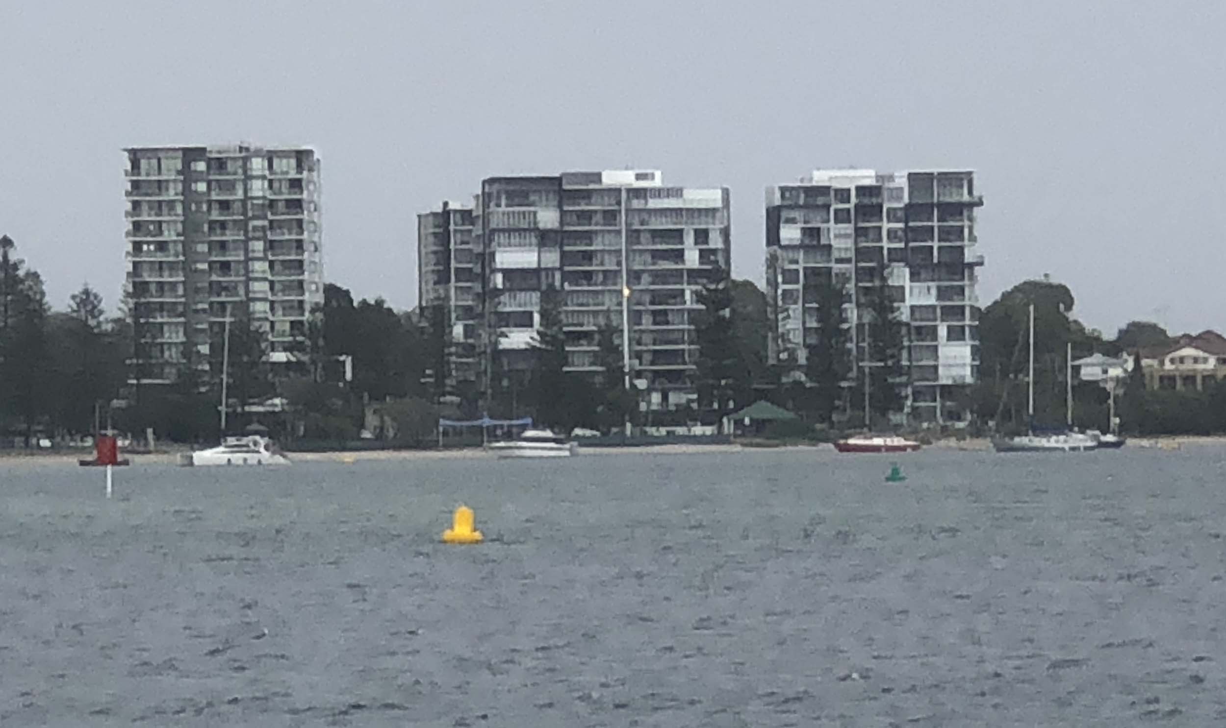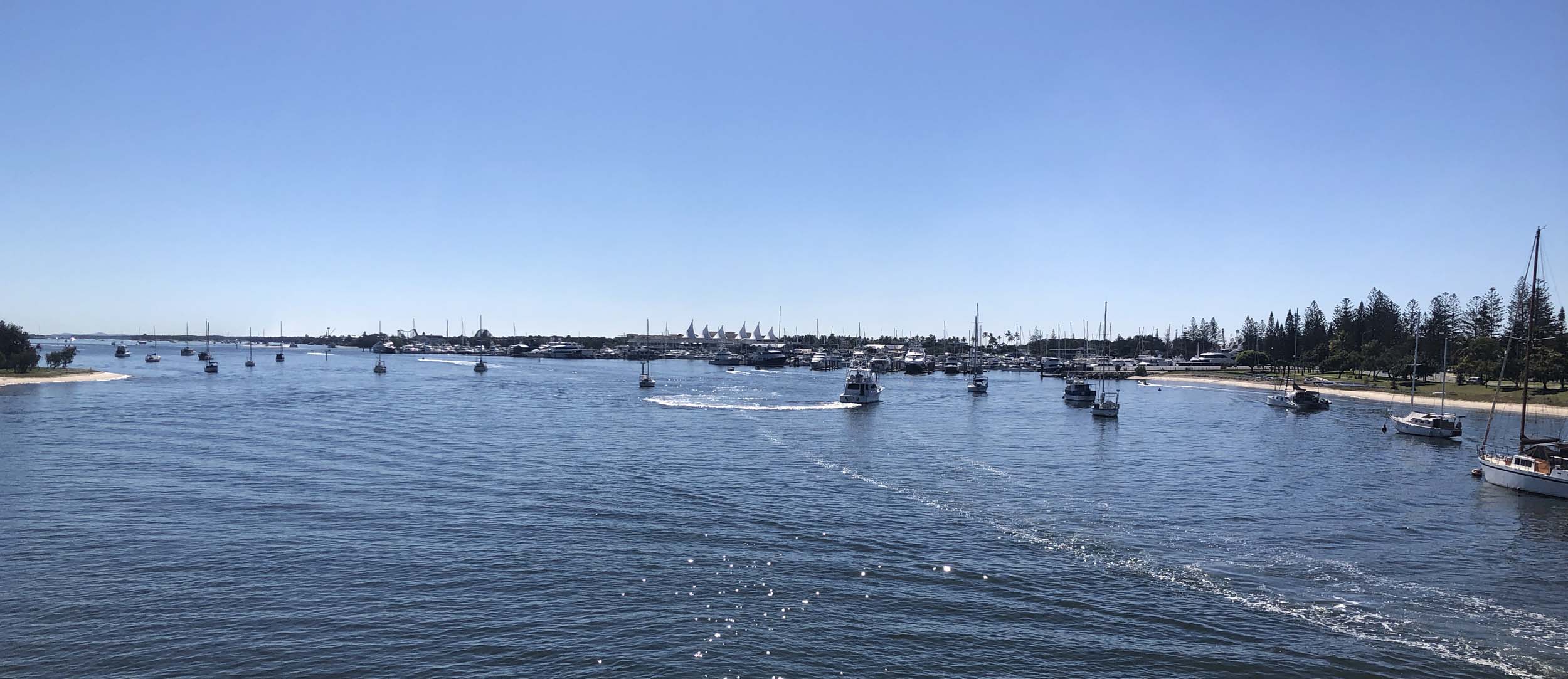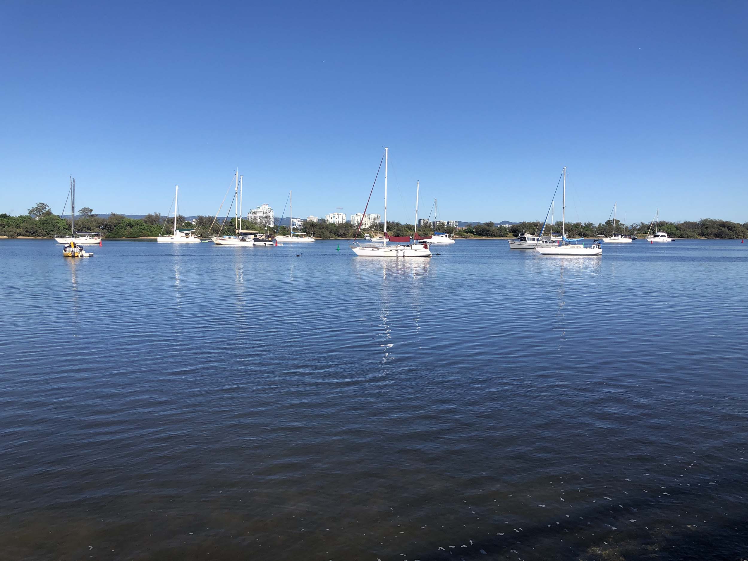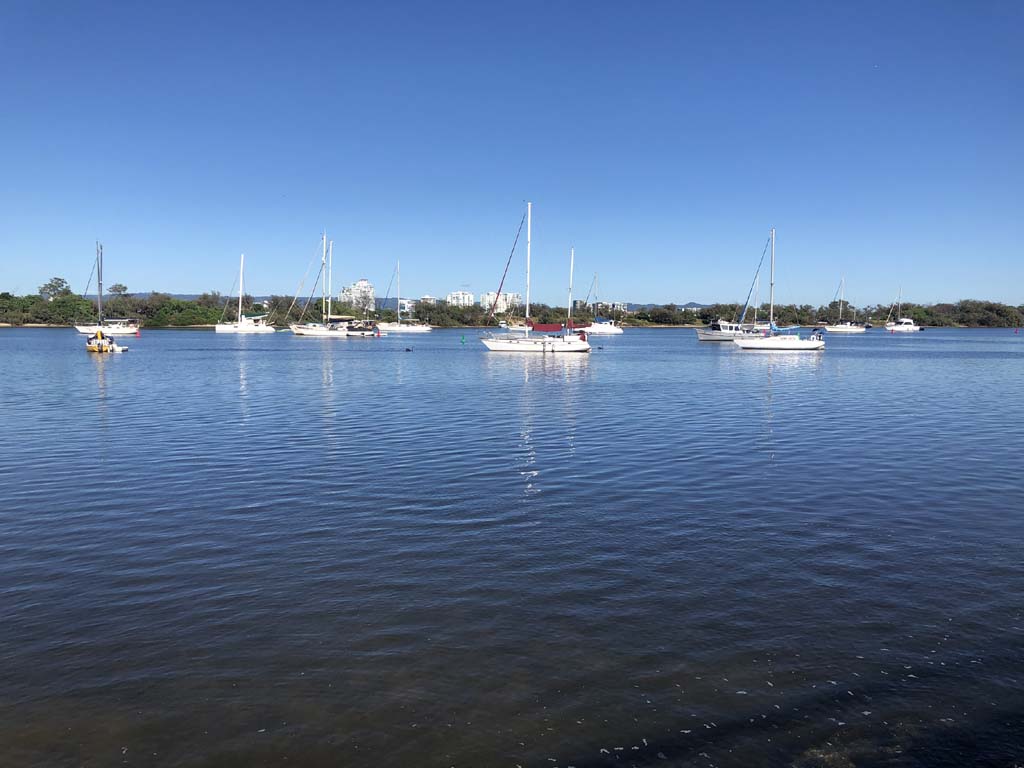 I left home about 7:43am, after going for a coffee and some shopping at Coles Lab Park. The breeze was building from the North East. The Broadwater was calm.