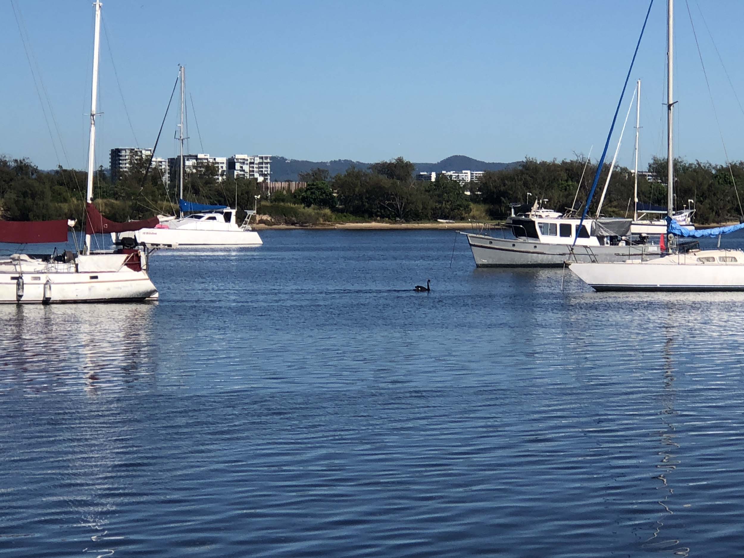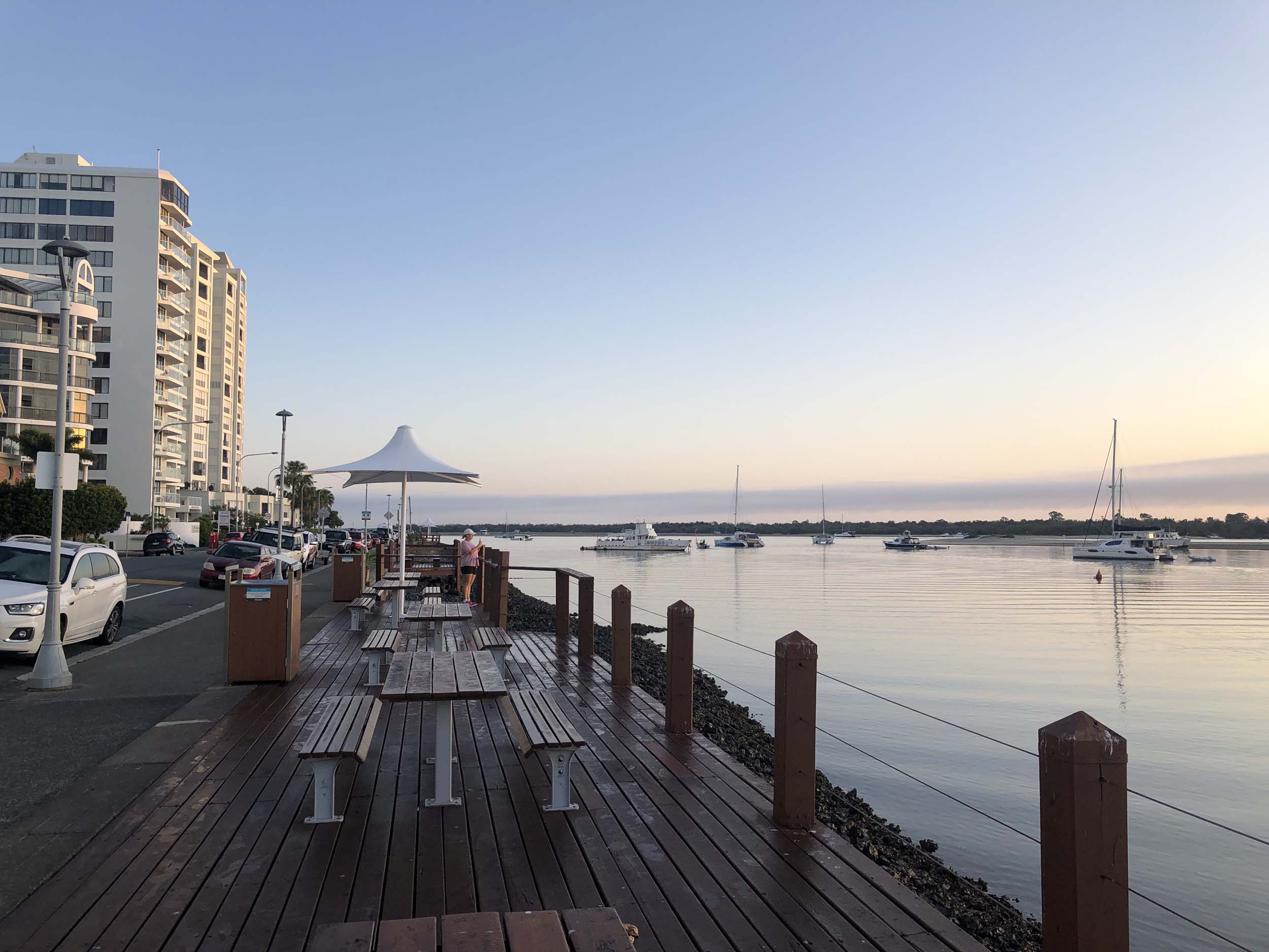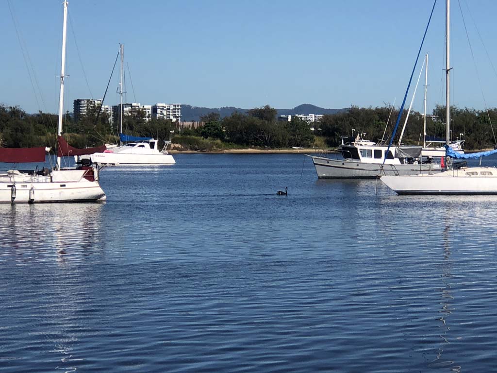 I left home about 8:18am, after going for a coffee and some shopping at Coles Lab Park. The breeze was slowing building from the East. The Broadwater was calm.