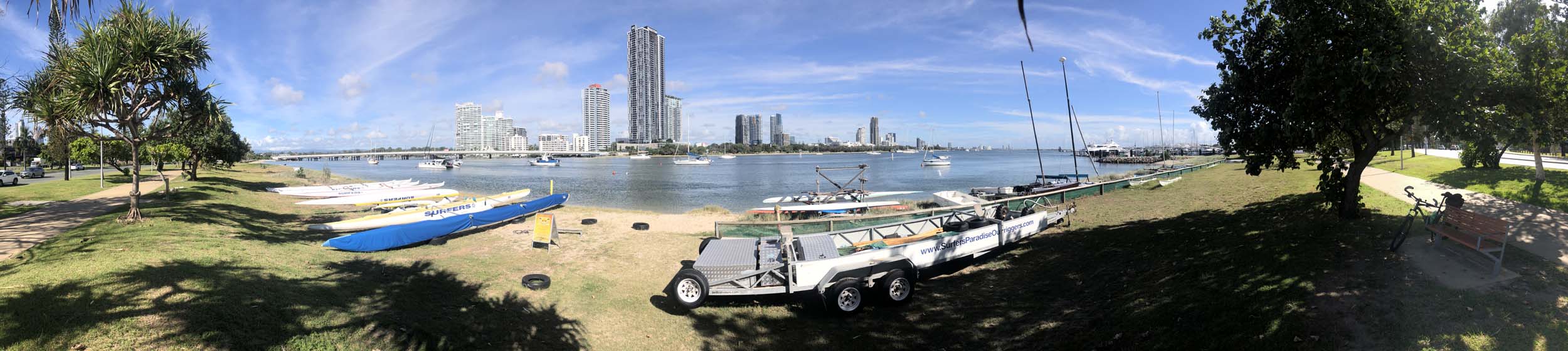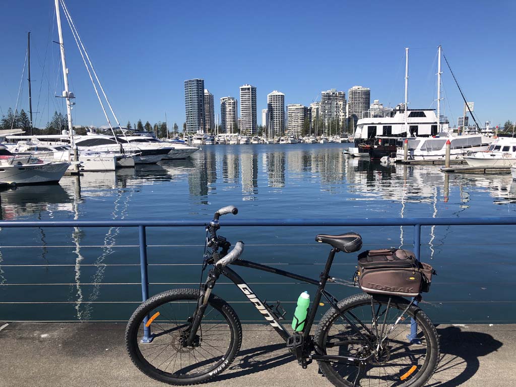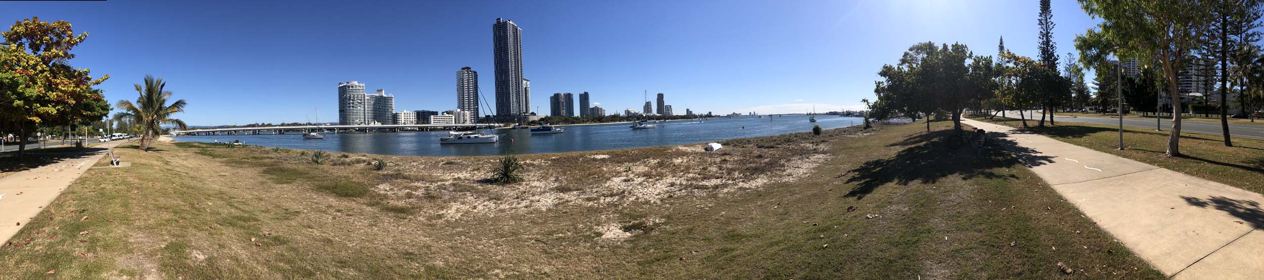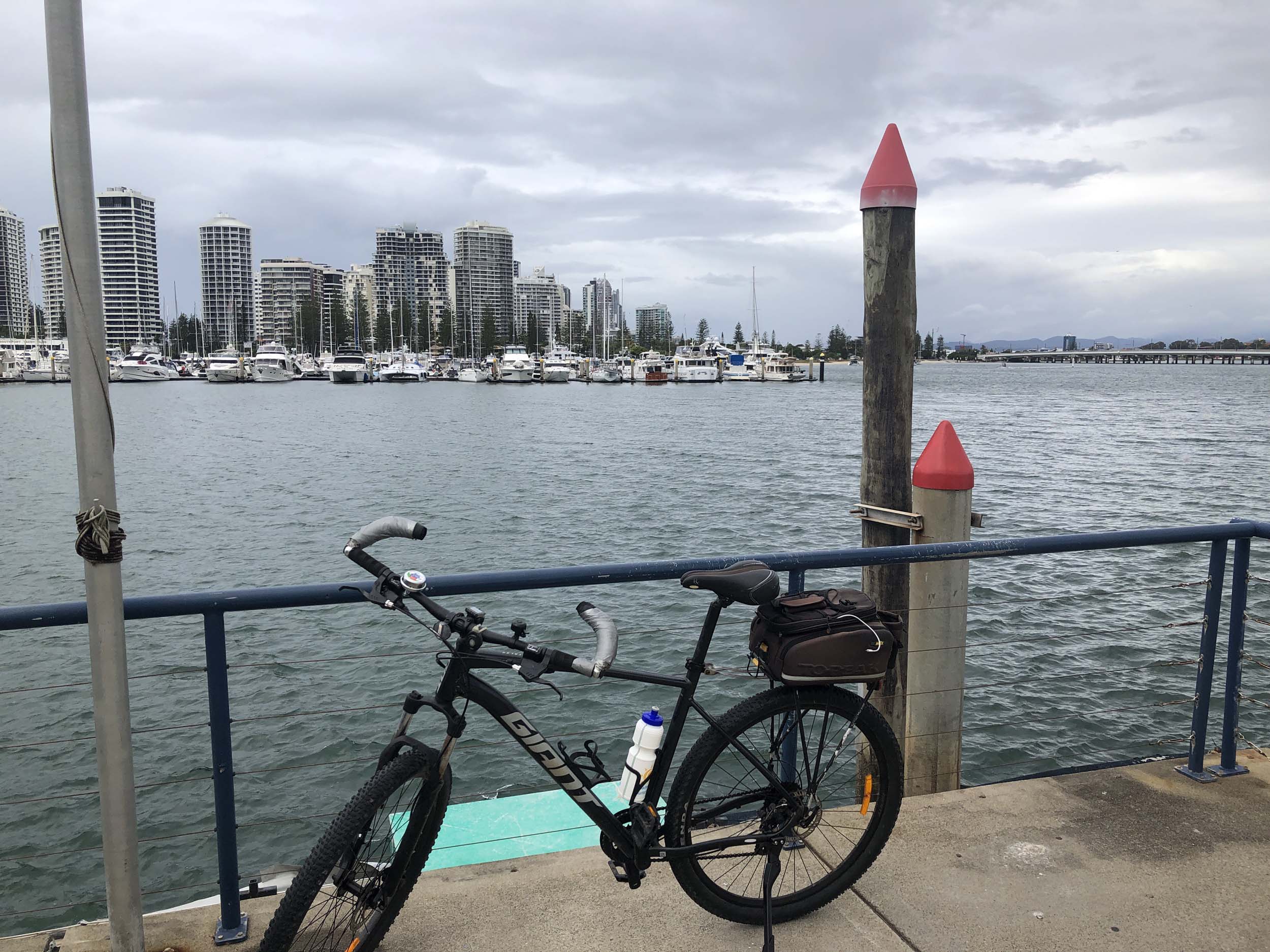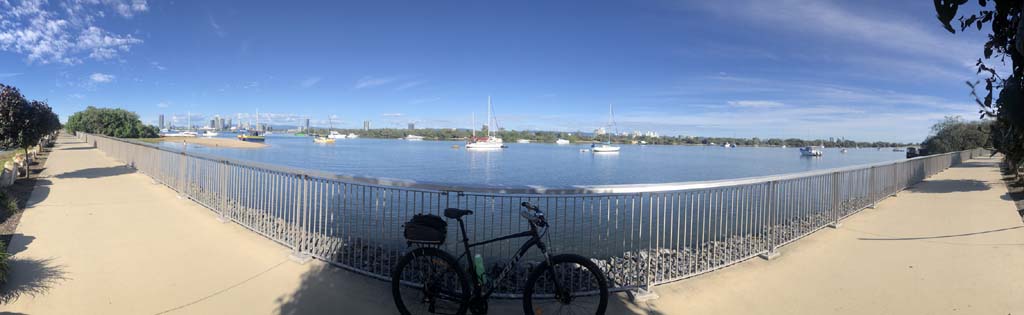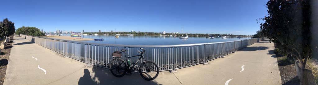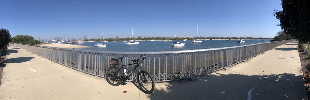 I rode Northward, to my Lands End/Biggera Creek turnaround point. Continued through the Broadwater Parklands over the Sundale Bridge and turned left and rode past the Super Yacht jetty. 3 boats were moored there. Continued through the Southport YC, along the jetties at Marina Mirage, then around the edge of the Seaworld carpark, stopped and took a photo on my way back, then continued along the shared path to The Spit.