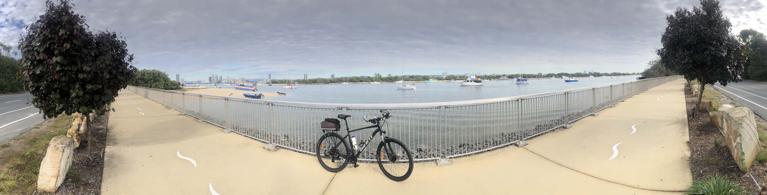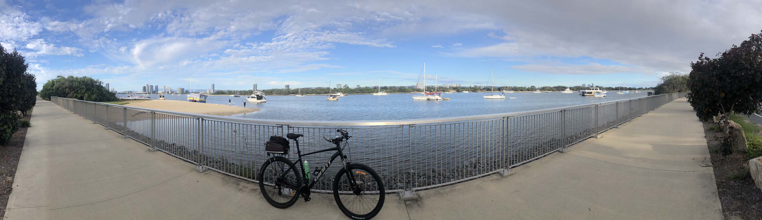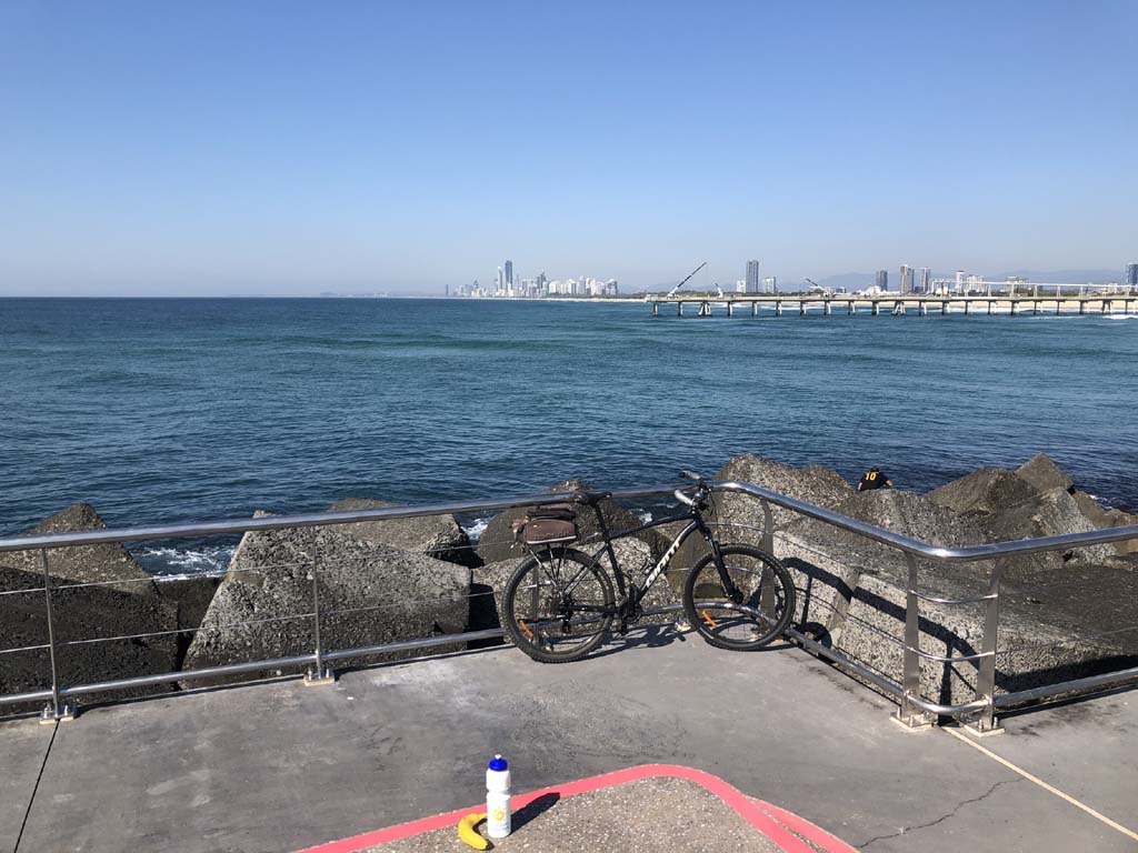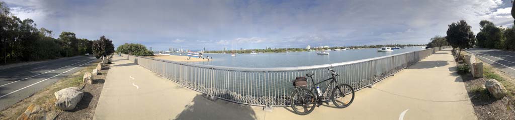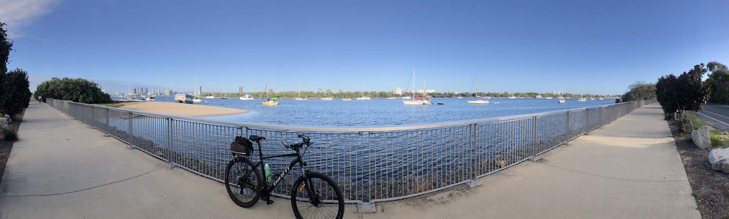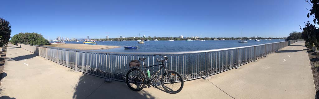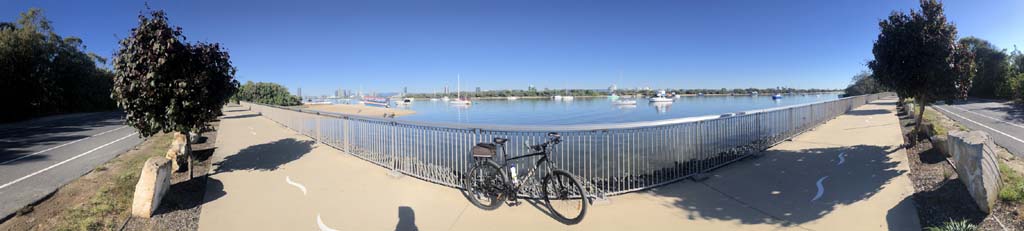 As usual, I rode Northward, to my Lands End turnaround point. Continued through the Broadwater Parklands over the Sundale Bridge and turned left and rode past the Super Yacht jetty, through the Southport YC, along the jetties at Marina Mirage and then around the edge of the Seaworld carpark, continuing along the shared path to The Spit.