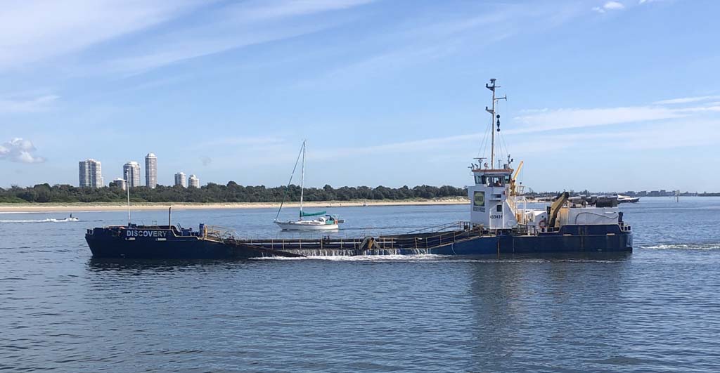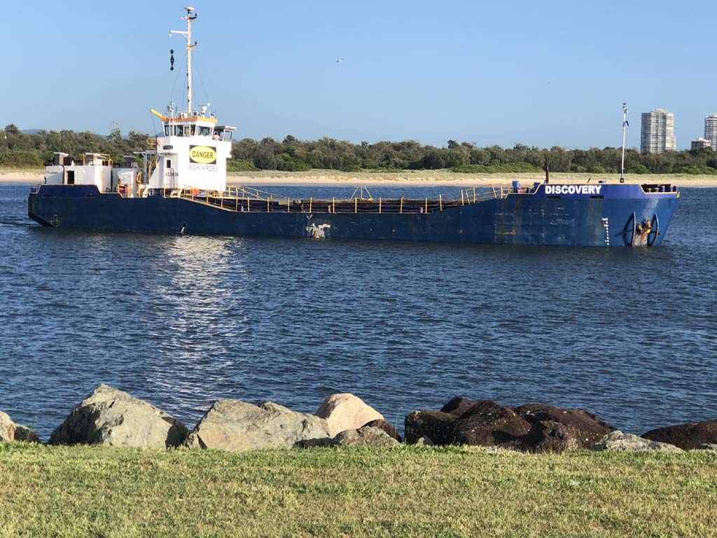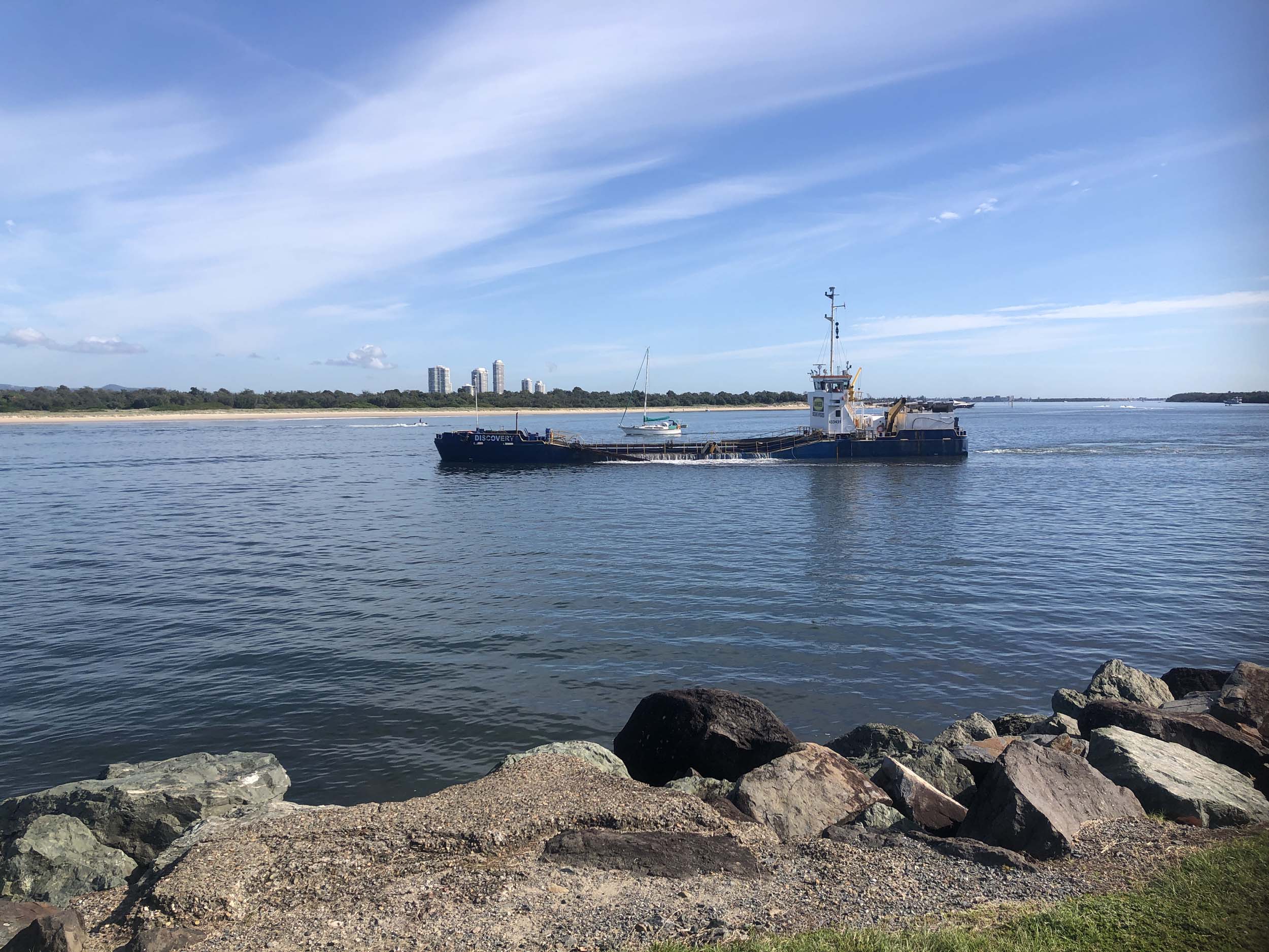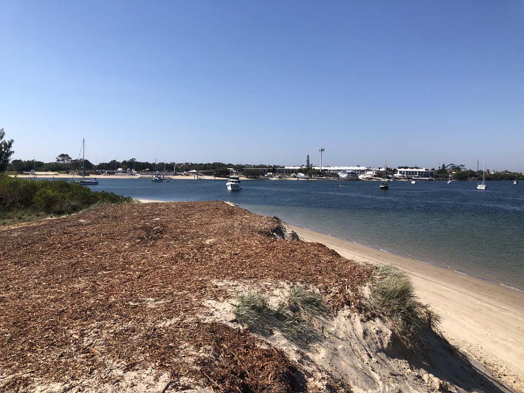 Continued riding to the tip of the Seawall/Spit. I took some photos and ate my banana, then rode to the tip of the Moondarewa Spit, took more photos and then rode back to the end of the Seaway/Spit. I noticed that there were about 20 surfers trying to catch waves between the Seaway/Spit and the Sanding Pumping Pier. The council workers are still adding more tanbark to the Moondarewa Spit. I left The Spit, and continued along the Shared path that runs parallel to Seaworld Drive, back around the Marina Mirage jetty.