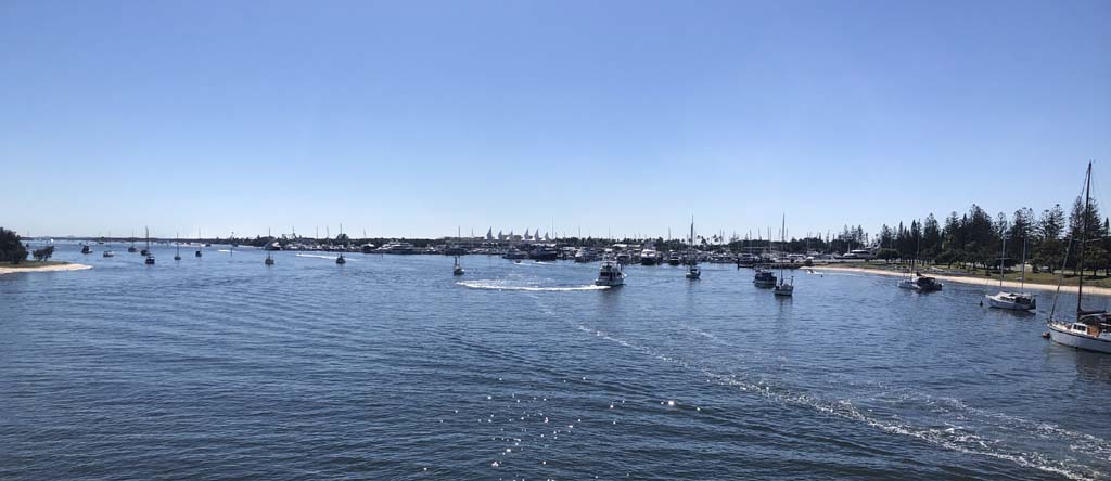 I stopped for a coffee at the Fisherman's Wharf Tavern, before heading up to an entrance to the Track, took a photo of the crowd waiting to get in. Stopped on the Shared Path beside the Sundale Bridge and took some photos looking towards the Southport Marina.