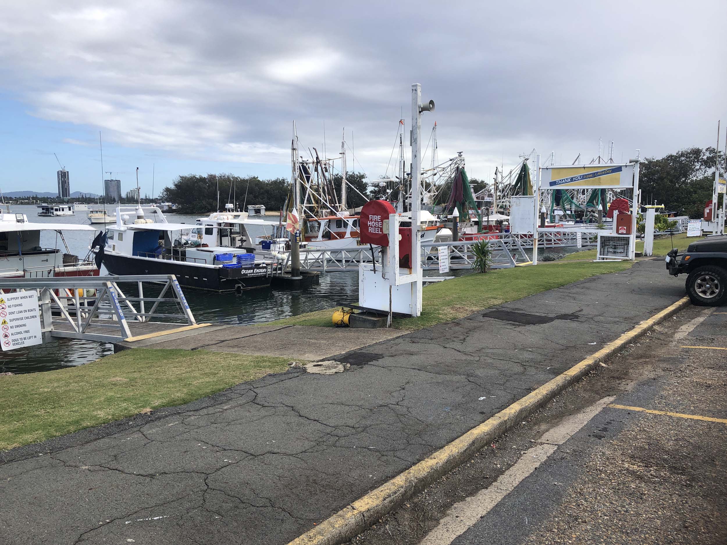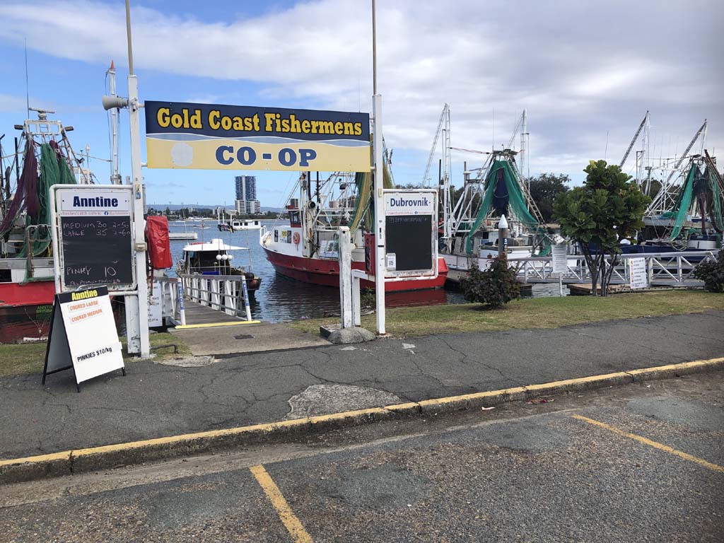 I rode Northward, to my Lands End/Biggera Creek turnaround point. Now the breeze hit me full on, continued through the Broadwater Parklands over the Sundale Bridge and turned left and rode past the Super Yacht jetty. 3 boats were moored there. Continued through the Southport YC, along the jetties at Marina Mirage, stopped and photographed the Gold Coast Fishermen's Co-Op and then rode around the edge of the Seaworld carpark, then continued along the shared path to The Spit.