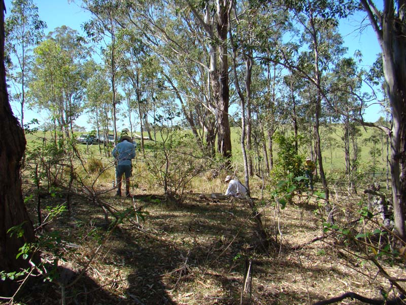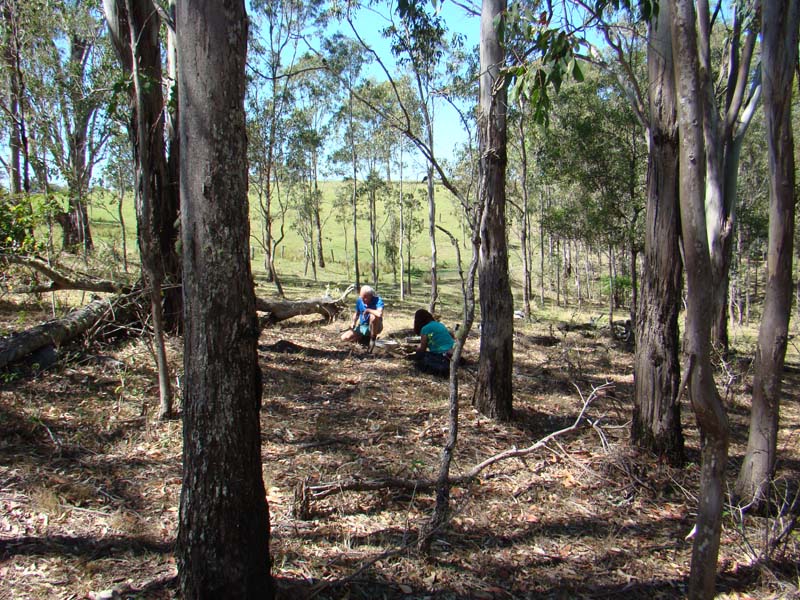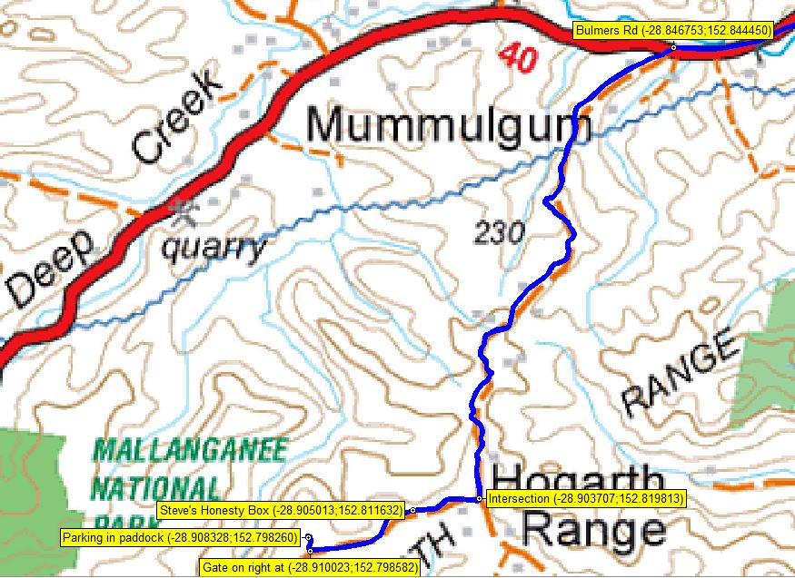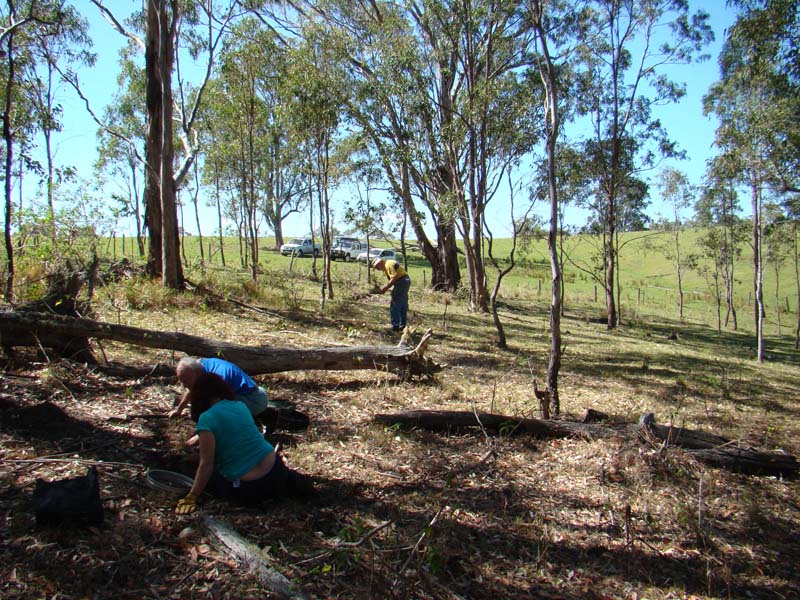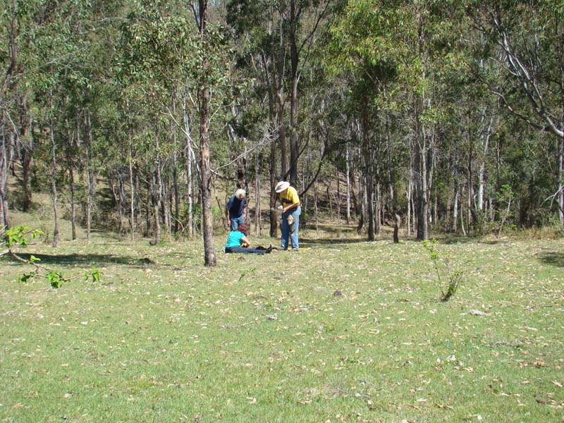 We headed west along Bruxner Hwy for 22kms, then turned left into Bulmer Rd (-28.846753, 152.844450), after 7.9kms you turn right (-28.903707, 152.819813), about 0.8km on the left is Steve's farm (-28.905013, 152.811632), Bruce put our money (Steve charges each person $3 to fossick) in an envelope and placed it in his letter box. He has a Golden Retriever and an old German Shepherd, both dogs barked and walked out to greet Bruce but appeared friendly. We continued to the gate (-28.910023, 152.798582) 1.4kms on our right, leave the gate as you find it, you drive over his paddock to where the 3 trees (2 live and 1 dead one in the middle) are, about 450 meters from the gate (-28.908328, 152.798260).
