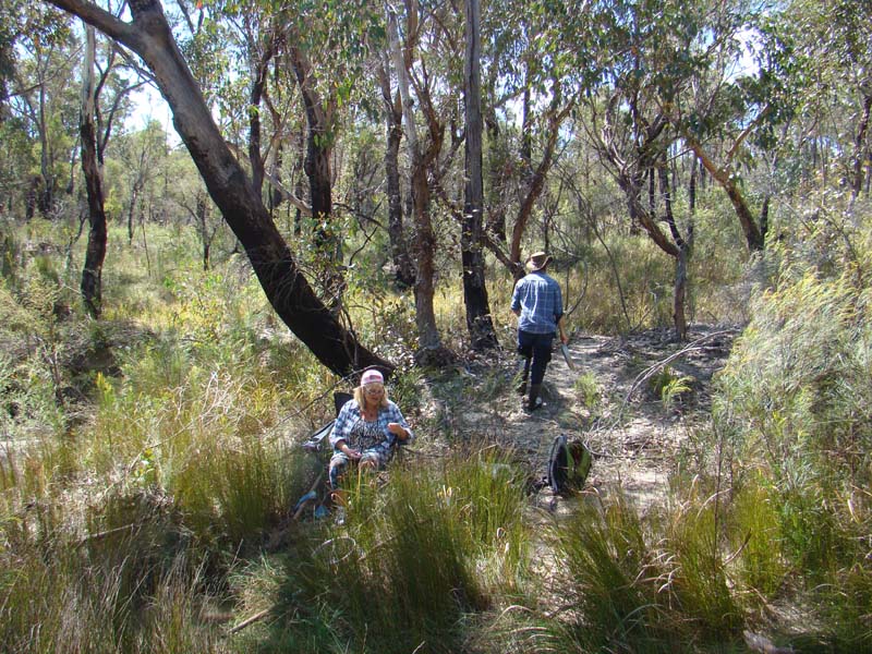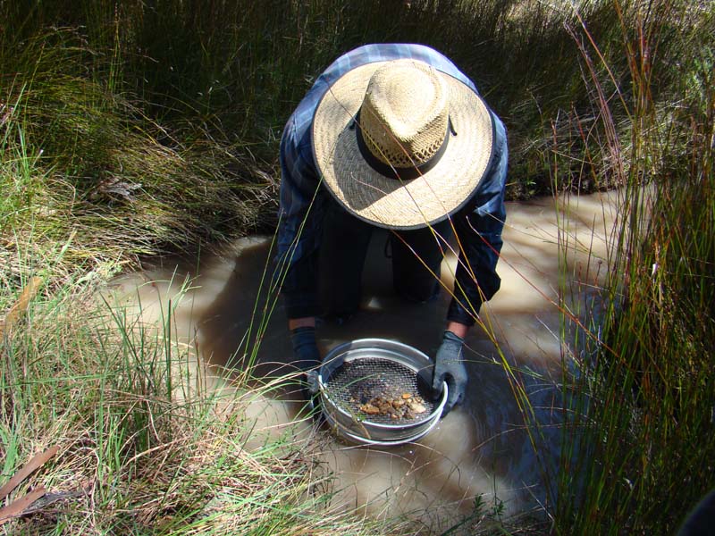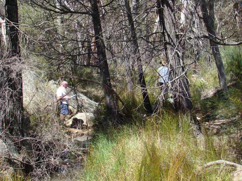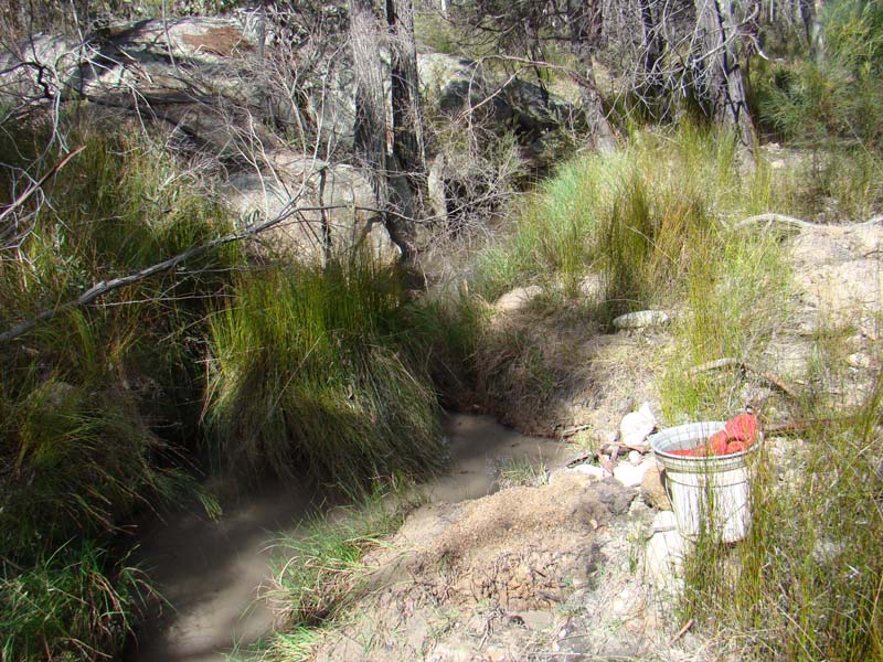 Downstream (and in the Conservation Area) there are small alluvial workings along the creek and sometimes some distance away from it. Go as far down as