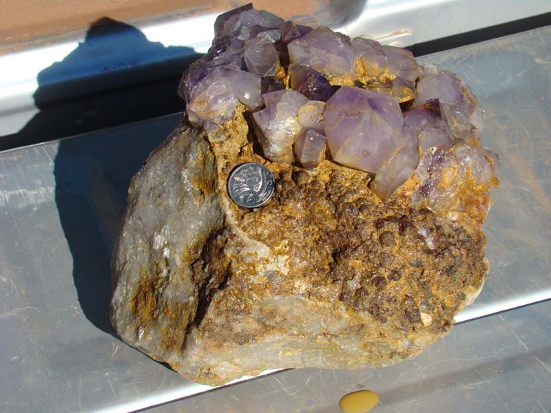 diggings and started to extend the existing hole, shortly after starting, I saw a small section of an amethyst crystal covered in dirt, so I dug it out and put it in