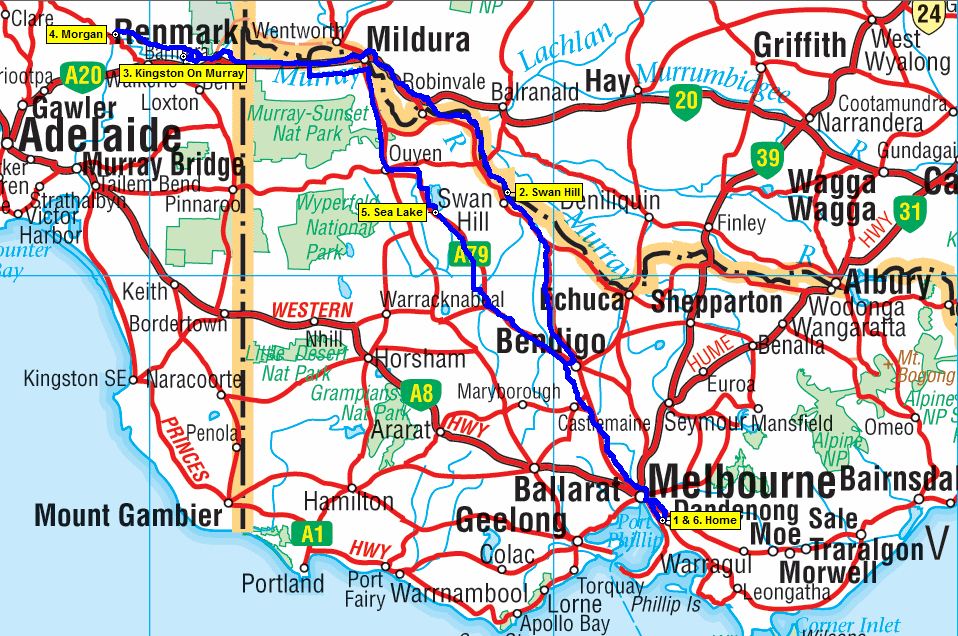These maps cover our trip from Home to Morgan to Home 7th April to 10th April 2010. Staying at the highlighted towns. Total distance travelled towing our fiver: 1,689 kms.