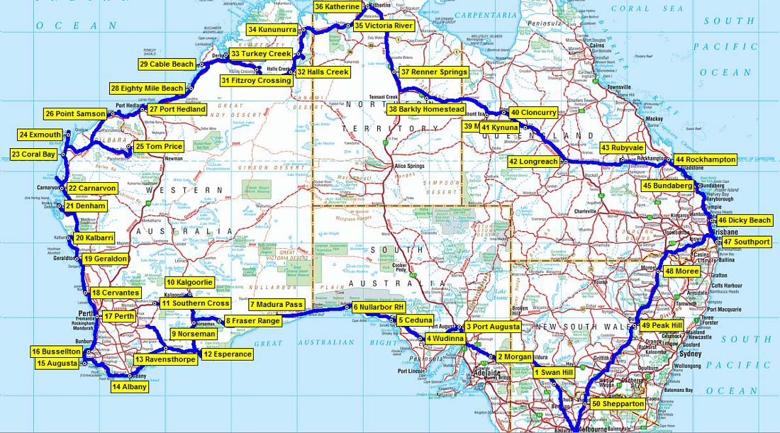 These maps cover our 2011 Lap of Oz 1st April to 28th September 2011. Staying at the highlighted towns. Total distance travelled towing our fiver: 15,817 kms.