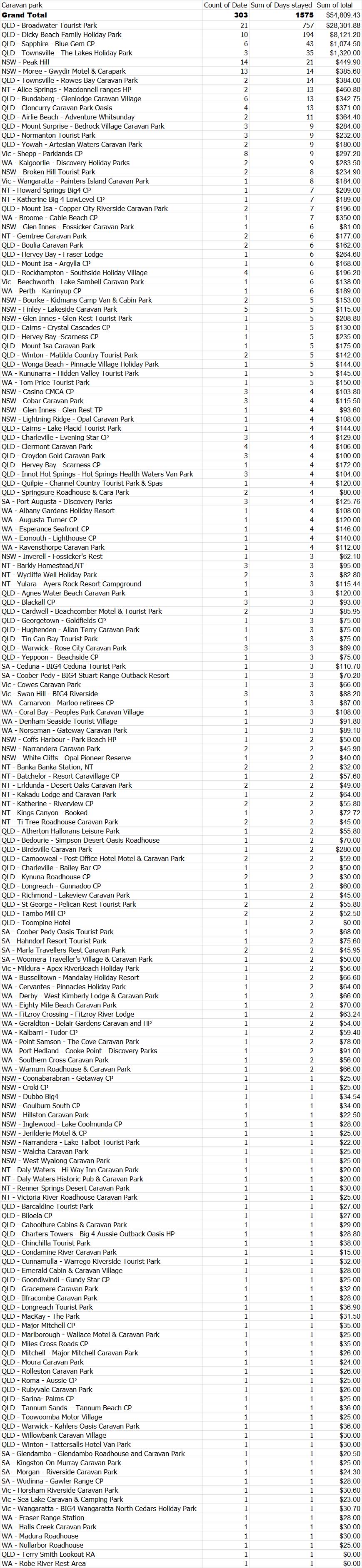 Eg: Broadwater TP - we stayed there on 21 separate occasions totalling 757 days.