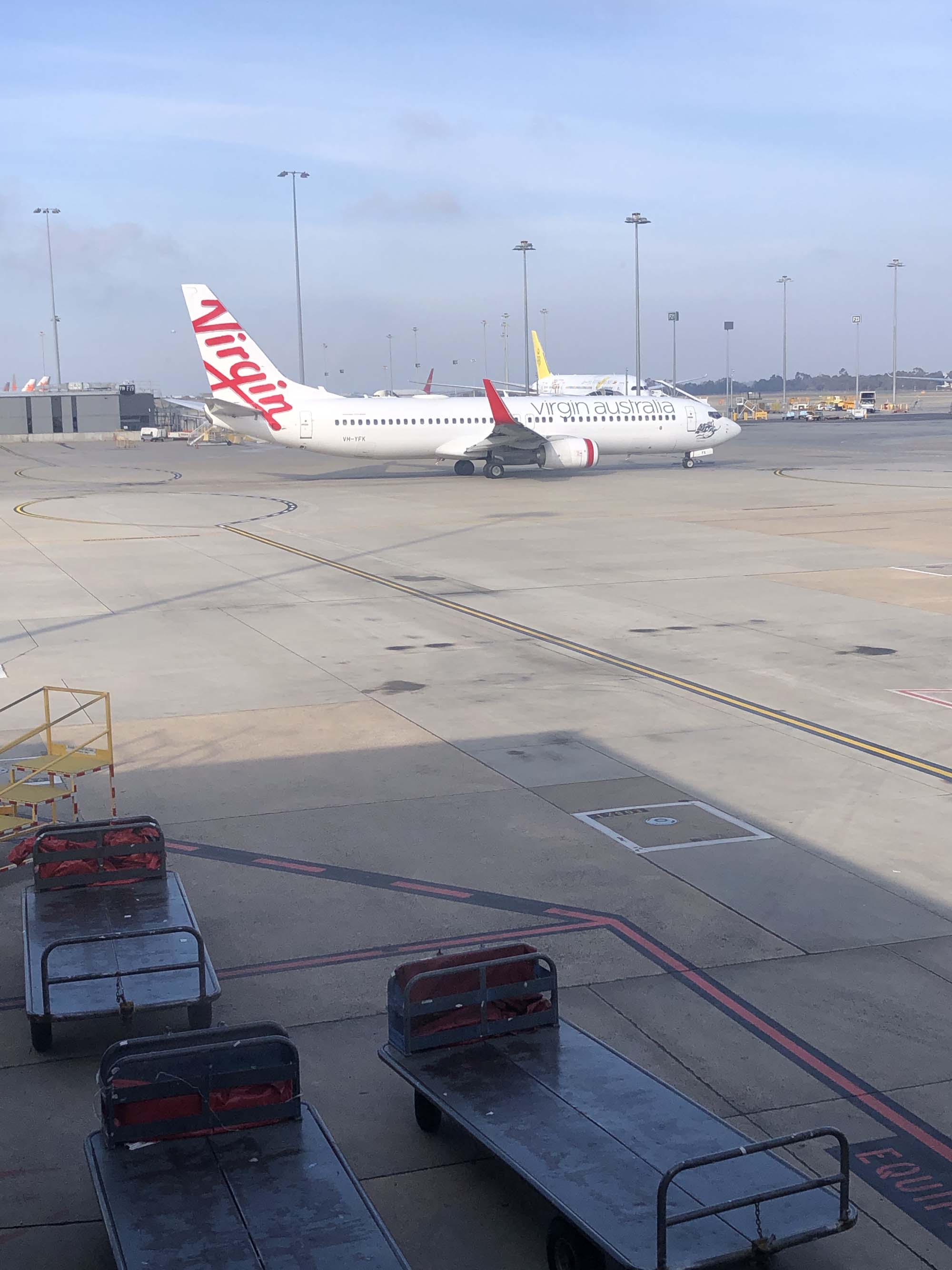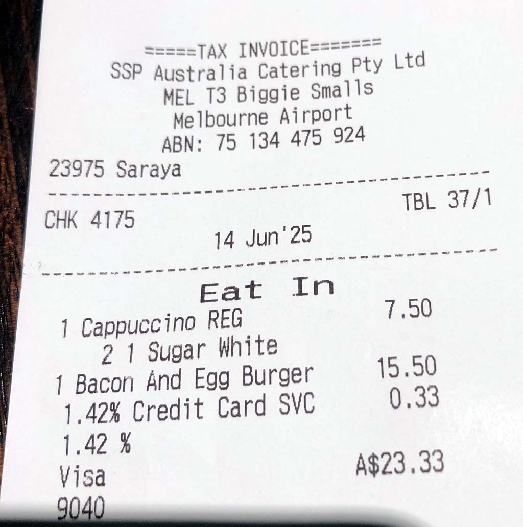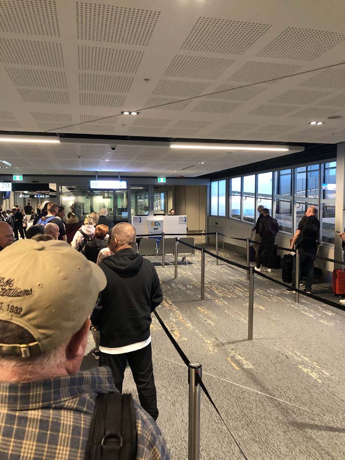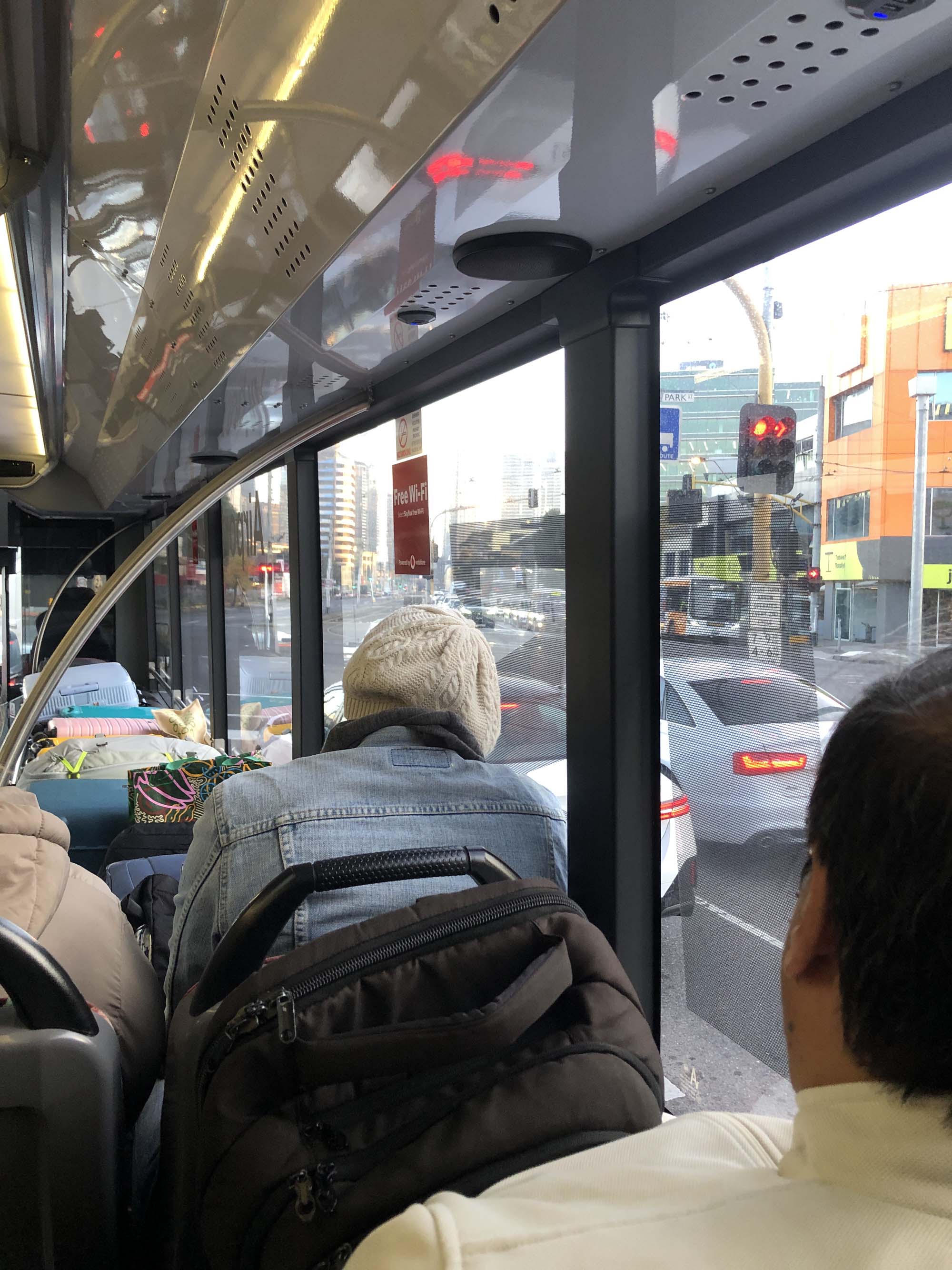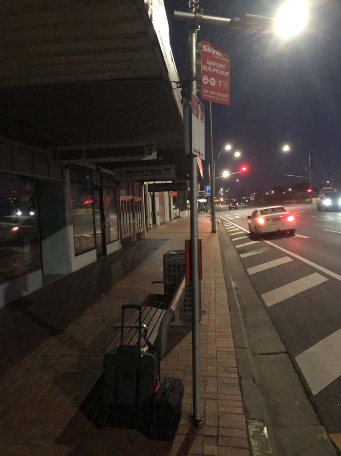 We arrived at Chelsea Skybus Stop at 6:45am for the 7am bus to Tulla airport. It was still dark when the bus arrived about 7:05am. I got on, the driver scanned my electronic ticket, I stacked my luggage in the racks and parked my bum near the back of the bus and relaxed. I expected this bus to stop at every Skybus Stop on the way to Tulla. There is 10 stops between Chelsea and Tulla. The trip was great, with me staring out the window all the time. As we were driving North along King St, the traffic heading South was unbelieveable. It was 4 lanes wide and approx a kilometer long and not going anywhere. There was no prang and it was about 8am on a Saturday morning. UNREAL.
