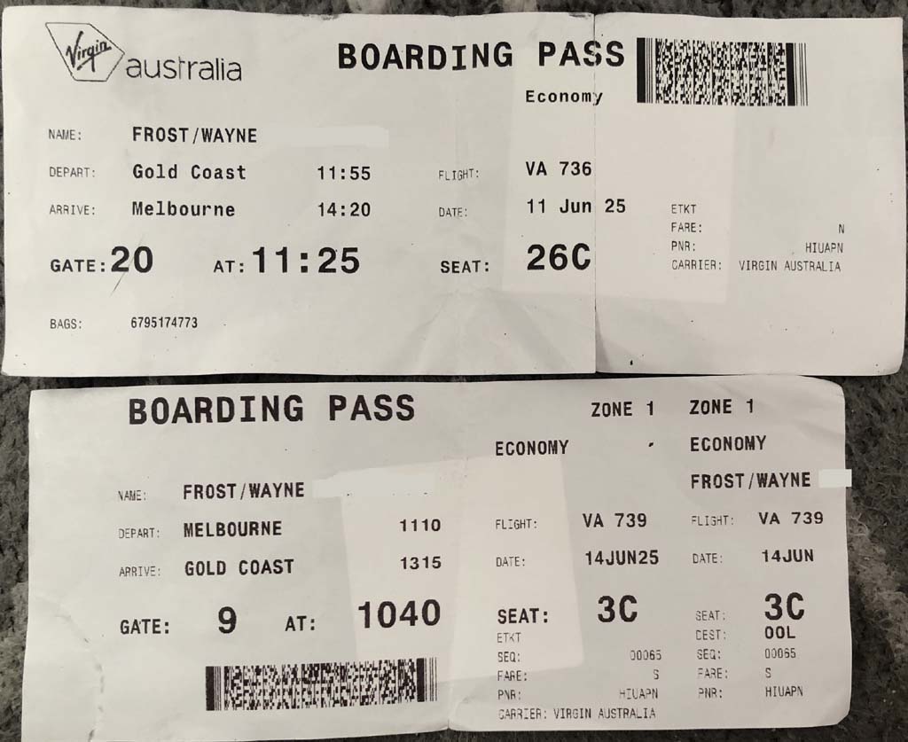 I walked up to the 'Check In Baggage' area. I used my 'old fart' attitude and walked up to the "Specialist Assistance" desk.. Ohhh, I forgot to say that I am wearing a "Big Freeze #11" beanie. So I walk up to the "Specialist Assistance" desk. The lady noticed my Big Freeze beanie and as there was noone behind me, we chatted. She is involved with Neale Daniher's Big Freeze. As an aside, I am booked into seat 26C, the same seat that I had coming down. While having a quick talk, she asked how I found 26C, I told her that my knees were hard up against the seat in front. She said do you want an upgrade to seat 3C. I asked how much and she said "No Cost". So I agreed to the upgrade. All this as I had a connection with her through the Big Freeze. I thanked her so much and continued off to the Security check in.