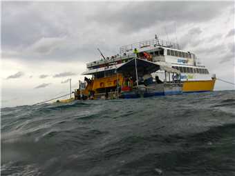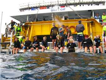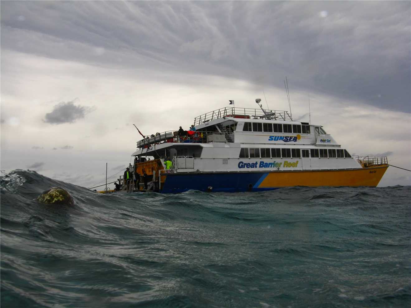 We were going out to Kelso reef, approx 60kms due east of Townsville, for a day of snorkelling. The Good Ship ReefCat was our vessel and it was approx 100ft long and 33ft wide with 2 main decks and a sun deck on top. It can handle 140 people at its maximum, so 26 people for our trip was brilliant. There were approx 10 crew and 26 divers, including us. We left the terminal at 8:30 and proceeded to Magnetic Island (Maggy Island to us locals), where we picked up another 2 passengers. It took 2 hours travelling at 25 knots to get to Kelso reef. I thought that it was an island, but all you can see is water and a glass bottom boat moored there in the middle of nowhere.