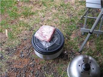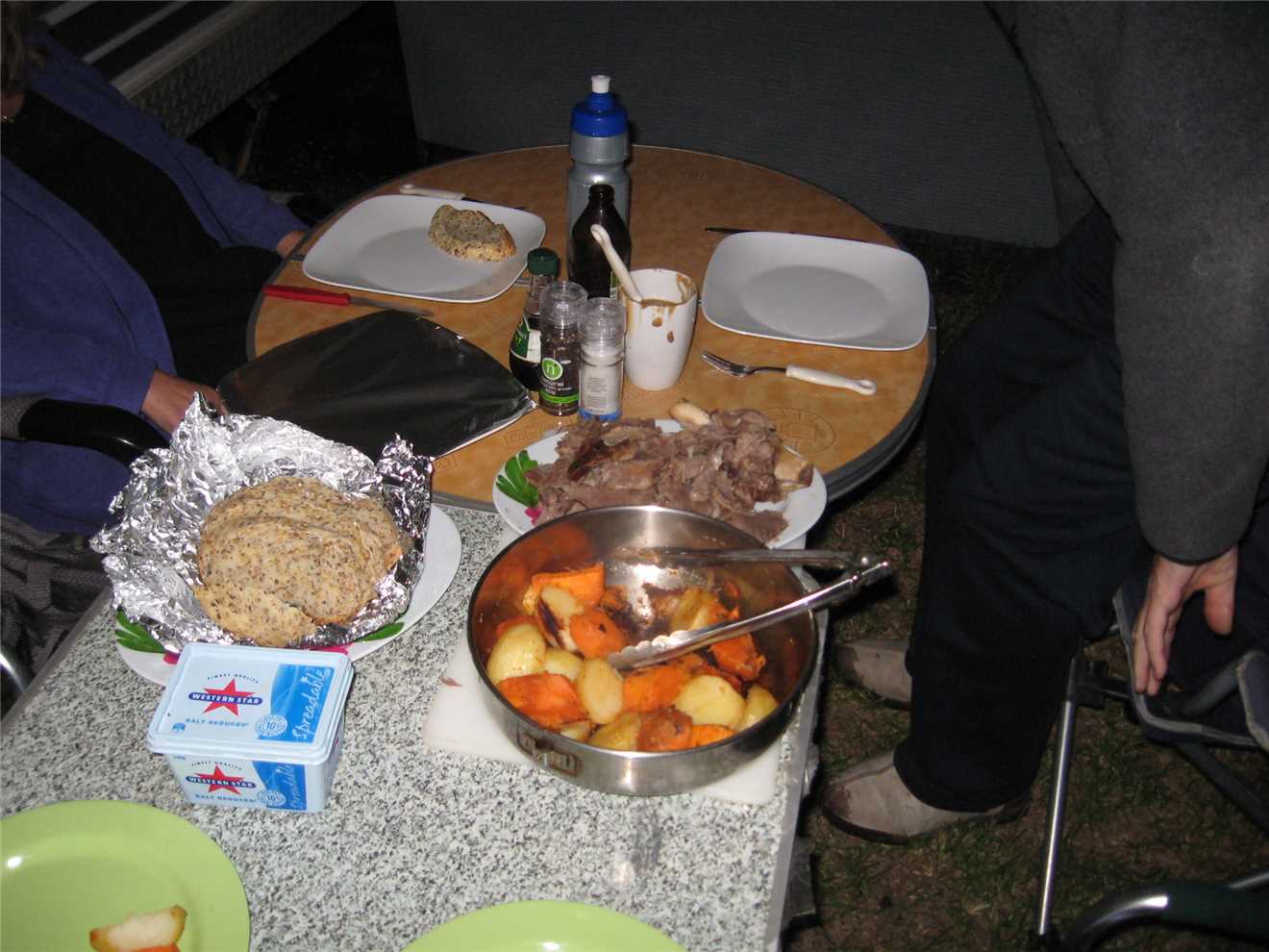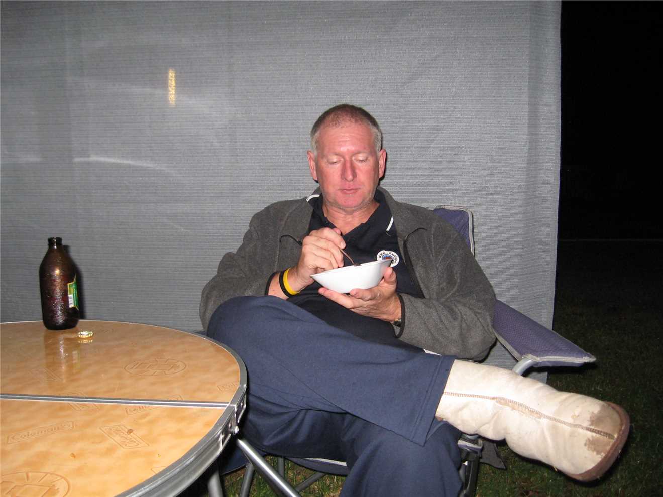 About 2pm, the fab four were all back at camp, so we started preparing the Cobb cookers, we were going to cook the roast and Pat and Cheryl were going to cook the vegies and make bread. Dinner was ready about 6pm and it was bloody brilliant. The bread worked out well. We all sat under Pat and Cheryls' awning for dinner. Cheryl make desert which was pears, soaked in caramel and chocolate and ice cream, purely non fattening. Yeah right..