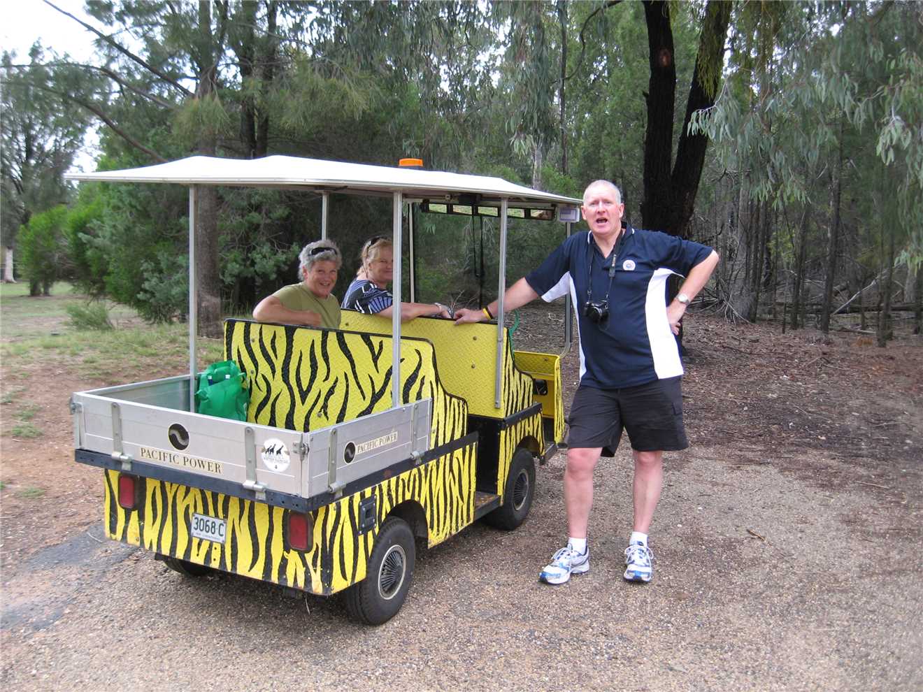 The weather was still a bit shabby, so the 4WD trekking was dropped and the fab four decided to go to the Zoo. I packed my Mountain Bike in the back of the Navara and off to Dubbo, we went, in 2 cars. We arrived at the zoo at approx 11am and as it was still drizzling, we gave the bikes a miss and hired a 4 seater golf cart, and away we went with Pat driving with Cheryl beside him, and Marg and I in the back. The cart has a roof but no sides and as it turned out the rain stopped just after we started the tour. The zoo is brilliant and well worth the expense $35 per person and $70 for 3 hour cart hire, so it cost $105 per couple. As we were preparing to leave, I set TomTom for Leightons, our estimated time of arrival was 4:01pm, so I told Pat that we would have to drive closer to the 110kph limit, we arrived just in time for scones. Yummy as usual.