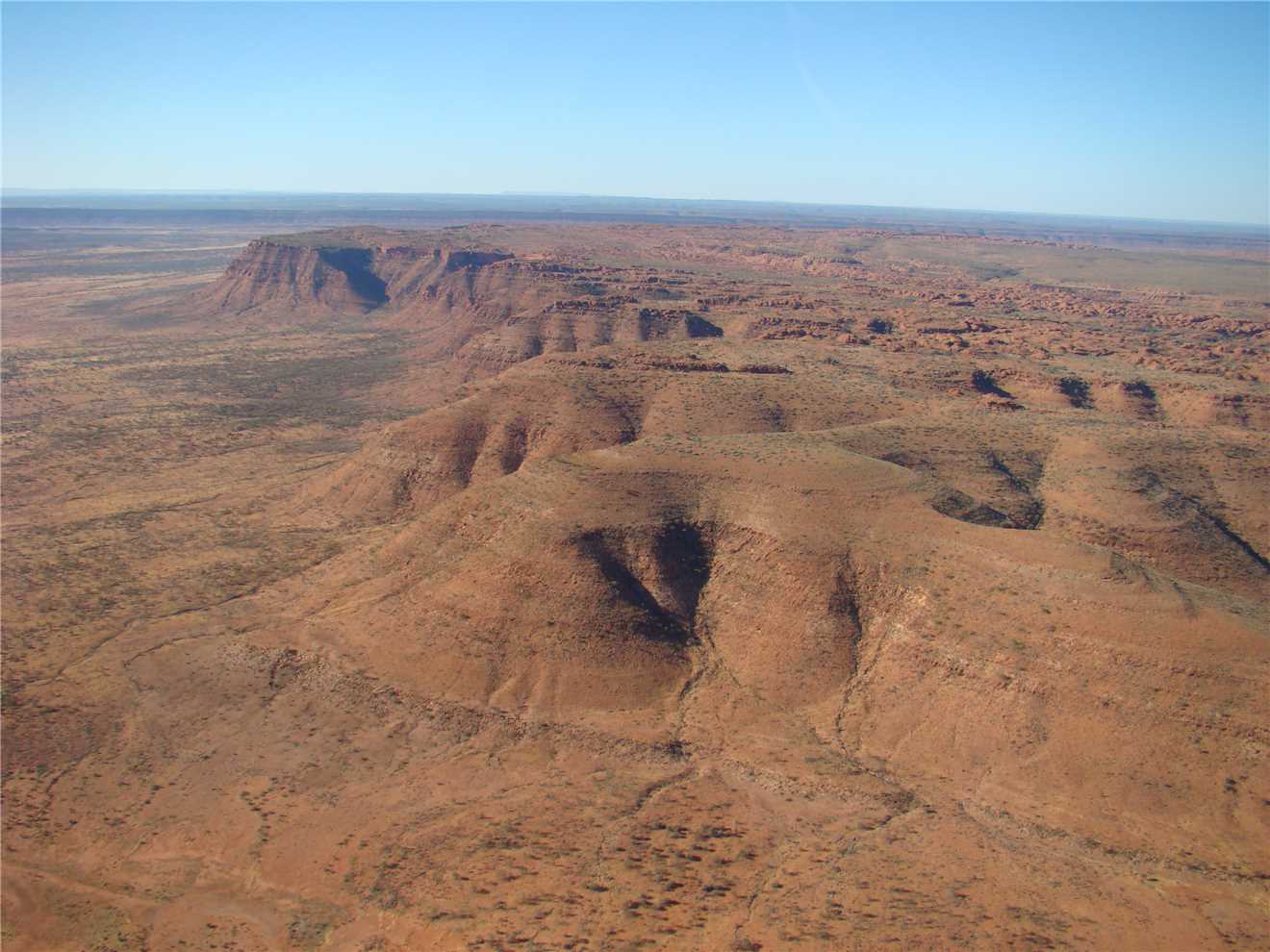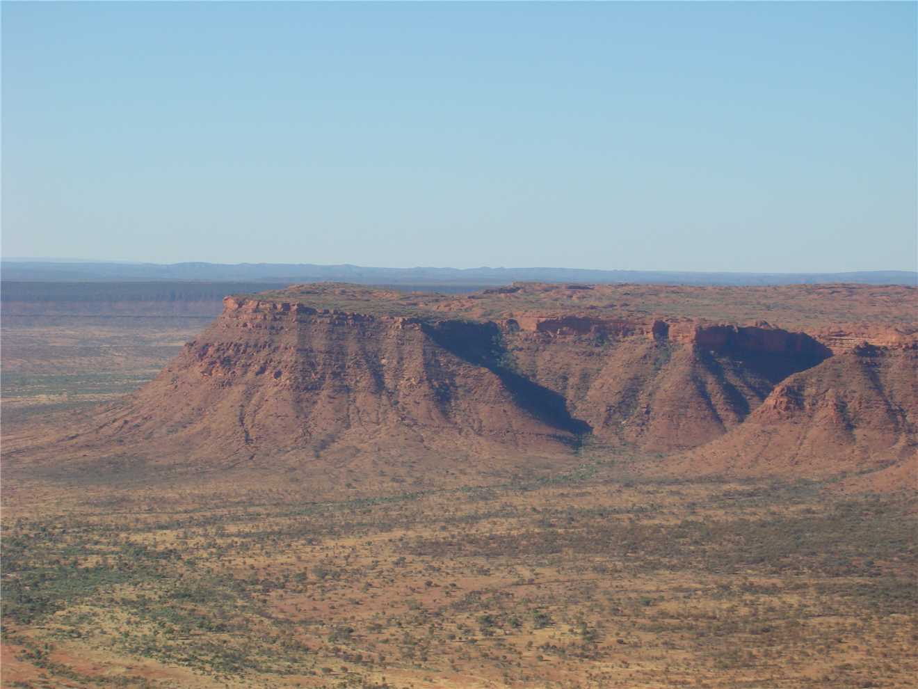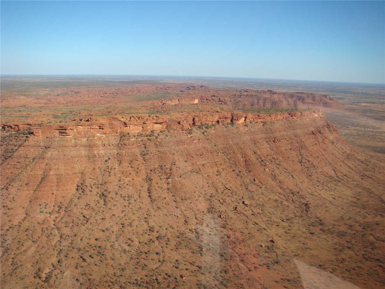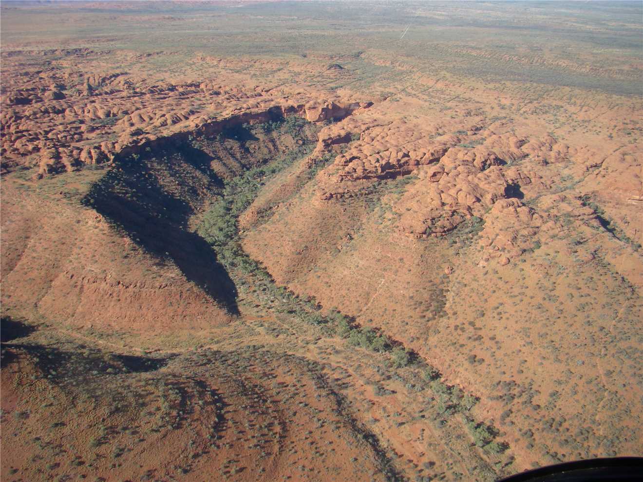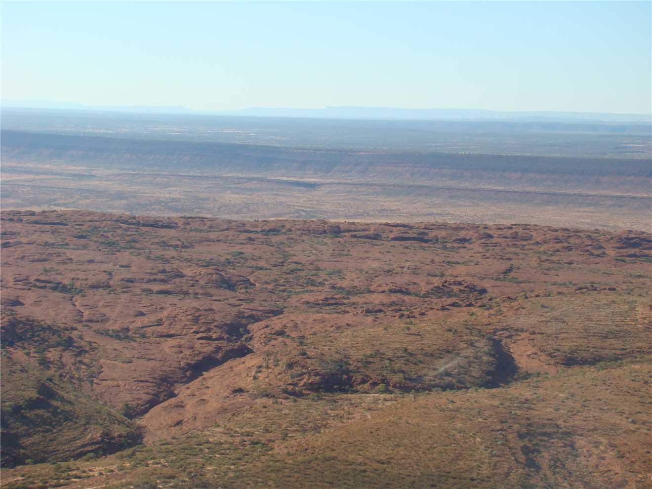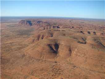 We made it, what a great flight. The helicopter shaked and rattled as we took off, but we got airbourne and headed over the Kings Canyon Resort then onto Kings Canyon and the surrounding hills and cliffs. It held 3 passengers and the pilot, I sat in the front left seat and Marg sat in rear left seat and a young Asian woman (who could hardly speak any English and just started working at the Resort) sat in the rear right seat. I just continually took photos. The helicopter cruised about 1,500 feet and then about 500 ft above the rim of the canyon and the cliff tops. We reached about 100 knots top speed, but cruised around 40 knots. The view was very spectacular, then it was over - Thanks K.Rudd for the money. After this, as we still have money leftover from Kev, we have decided on a 30 minute helicopter tour over Ayres Rock and the Olgas, that should put a hole in the remainder of Kev's money.