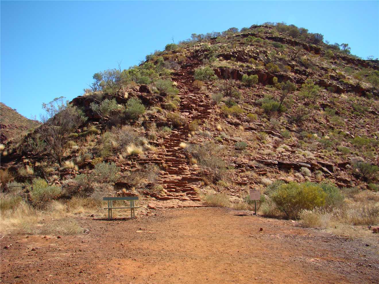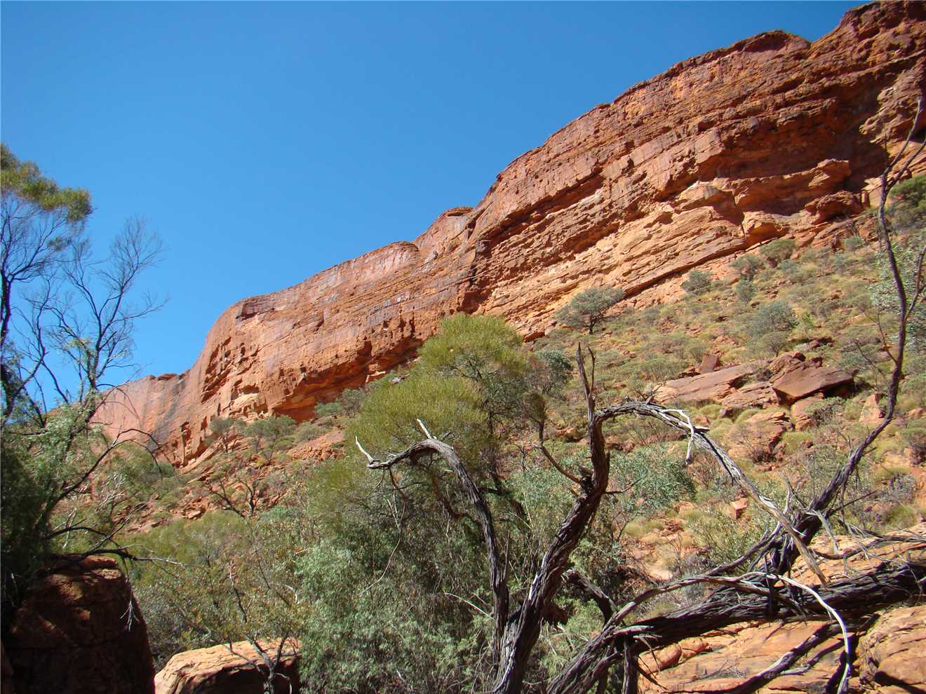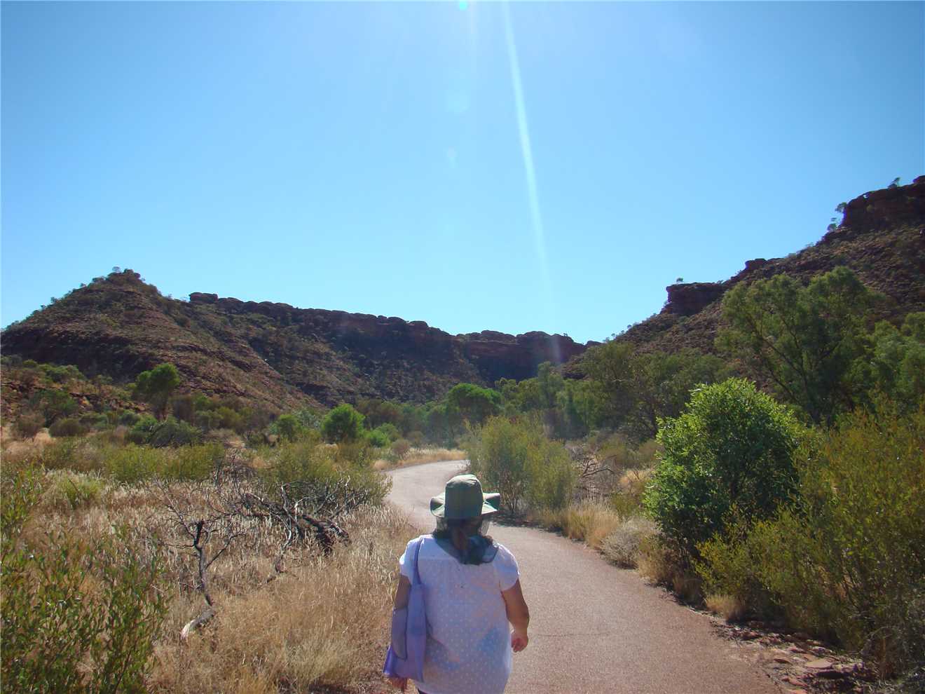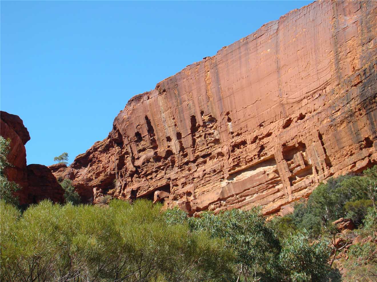 We went to Kings Canyon this morning and took the creek walk. Looking up at the rock walls was awesome. I think that the rim walk would have killed us. Back at camp we did some shopping, not much, because it is expensive, eg. Kirks 1.25litre software was $4.60. I spent most of the afternoon on my laptop, resizing the photos, ready to upload to the internet tomorrow, when we arrive at Ayres Rock.