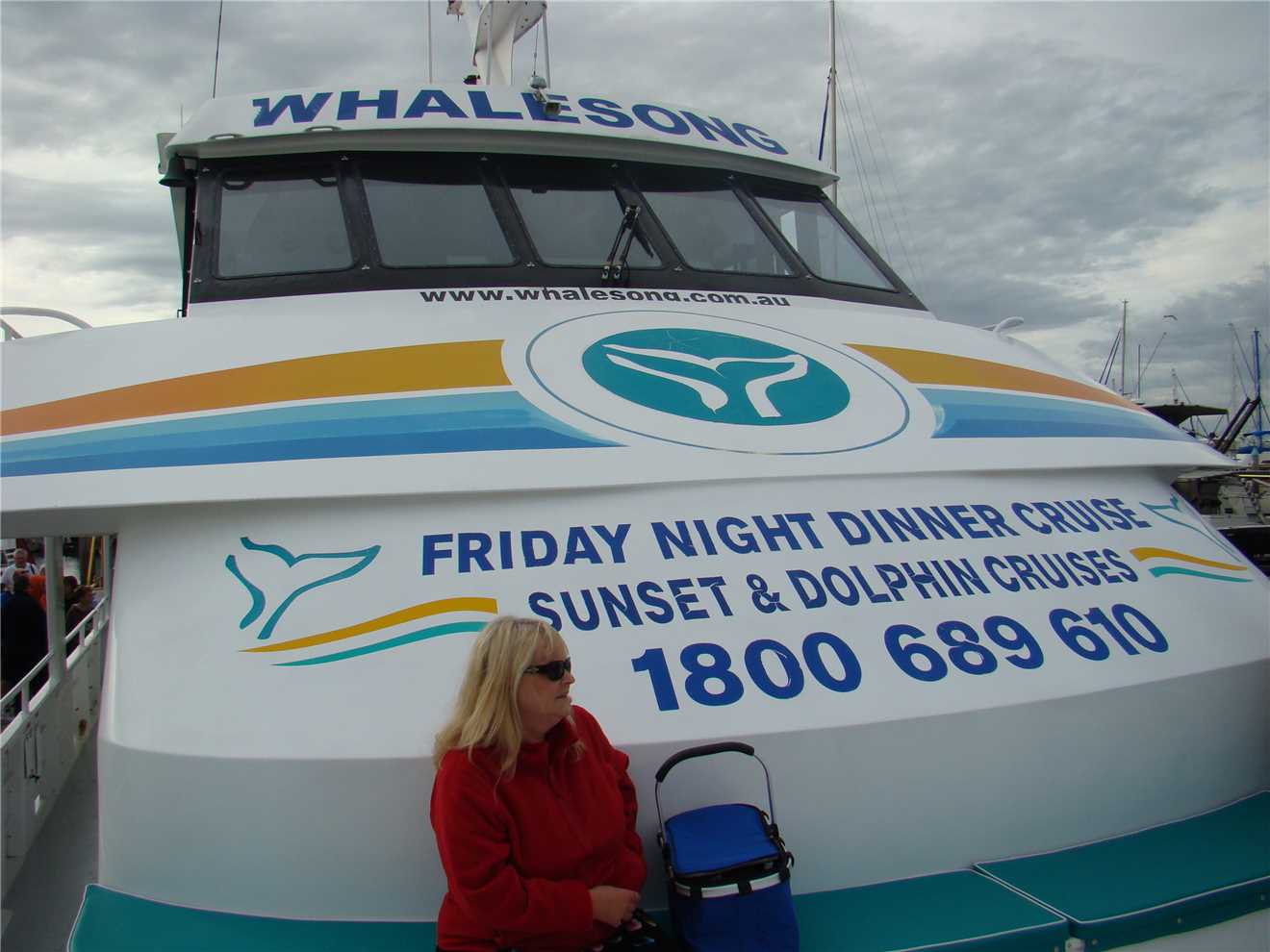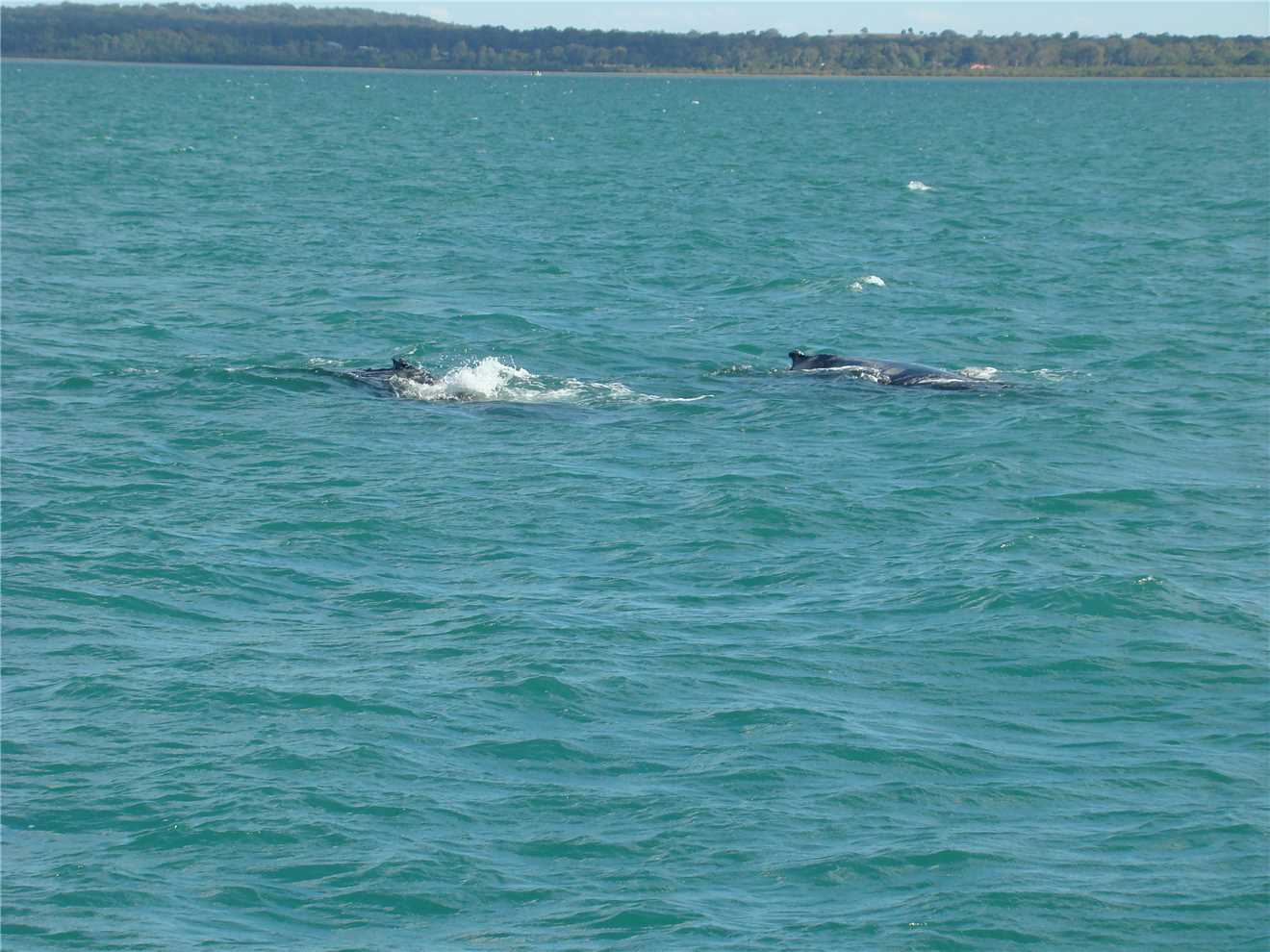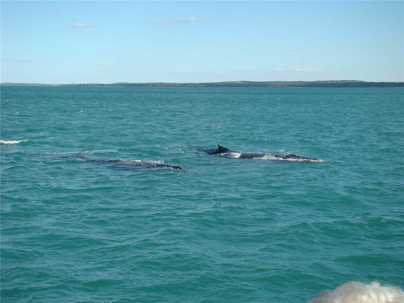 I woke Marg at 6:30am, as the bus is picking us up from reception at 7:55am and taking us to the Whalesong boat at the marina. The boat left the wharf approx 8:15am and was scheduled to arrive back at approx 2pm. There were approx 30 people on board of which 19 came from our caravan park. We were the fourth tour boat to leave this morning, as the other 3 boats do 2 tours per day and are on a very tight schedule. We had a fair bit of luck with us, we saw the first whales a pod of two about 30 minutes into the trip, this was mainly due to the other boats finding them first and radioing their position. After that, we saw a pod of three and then it was time for morning tea and muffins. We stayed on the front deck and as everyone went inside to get morning tea, Marg and I were left alone at the front, when suddenly one of the whales surfaced about 5 meters from where we were, I took a photo but as I photographed the whale his blow (water from his blowhole) wet both of us including the camera, that's why a couple of the photos have spray on the lens but I kept shooting, because I didn't want to miss the opportunity. Within a few seconds, the front deck was covered with people, but we were in the best position. We then continued further east, along the North West coast of Fraser Island, where we came across some dolphins. These dolphins came to play and surfed our bow wave it was brilliant. The sea was getting a bit choppy with a 20knot Southerly, so we headed back and found another pod of three whales, then went in closer to Fraser island where it was calmer and we had lunch, which consisted of Quinche, chicken and salad. Very Yumma.