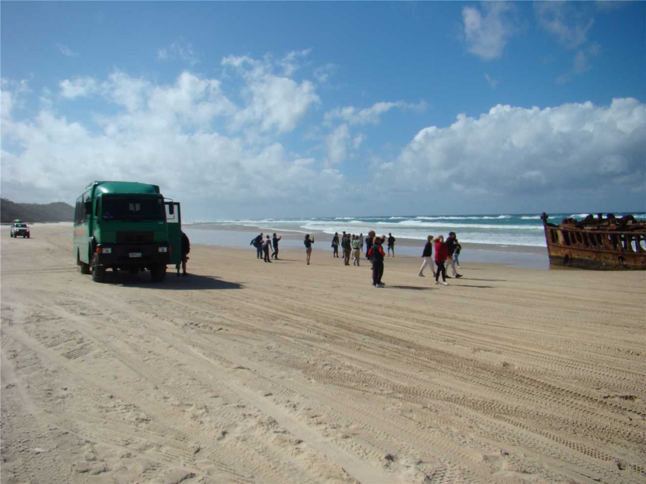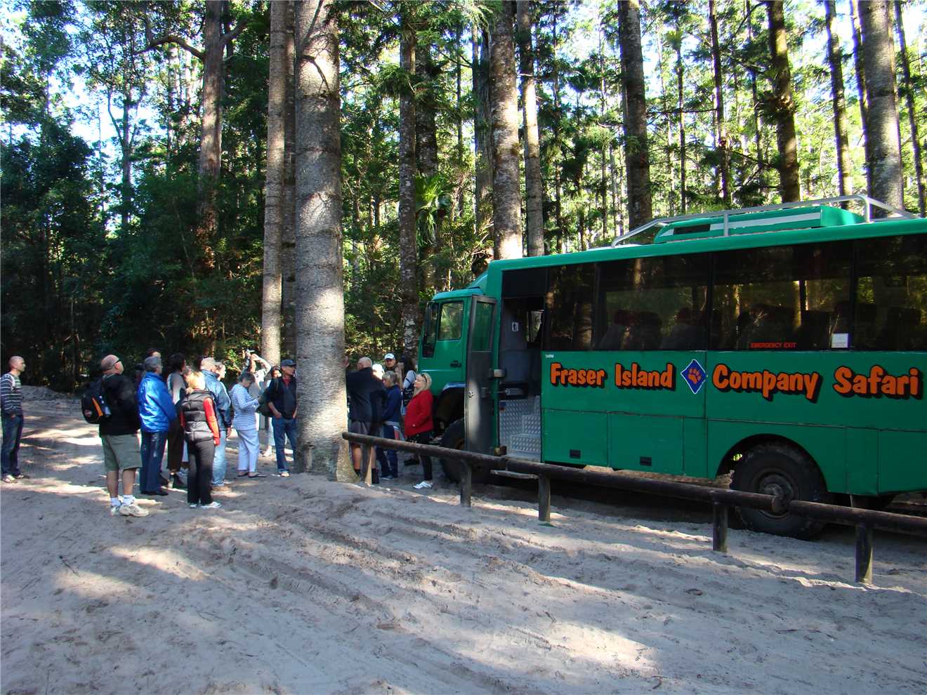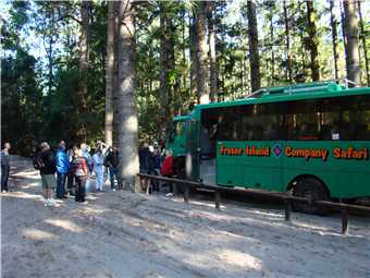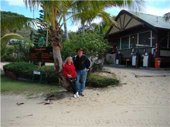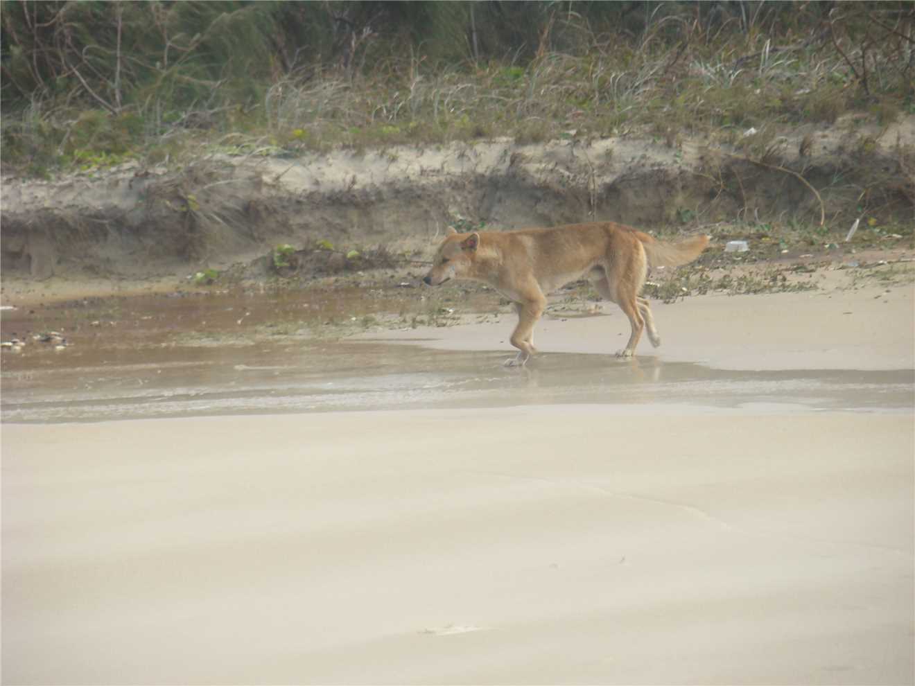 I woke Marg at 6:15am, as the bus is picking us up from reception at 7:45am and taking us to the barge at River Heads. We were the 2nd pickup of the day and the only people from our caravan park. There were 28 people on our tour, about 6 Aussies and then New Zealanders, English, France and other Europeans. The barge "Fraser Venture" was waiting for us, it had approx 10 4WDs and probably 100 people on board. It took approx 45minutes to get against the Great Sandy Straits to Wanggoolba Creek. Our 4WD coach was on the island waiting for us, so we all got on and then off we went to our first stop which is called Central Station, except there were no trains. It is in a rainforest and the trees were absolutely brilliant, tall as and straight as. Fritz our guide took us on a walking tour of the rainforest and the streams on Fraser Is are crystal clear and all fresh water. Back on the bus and off to Eurong, which is on the east side of the Island, the roads are sandy tracks through the forests and are as rough as guts, we had to wear seatbelts in the coach as you are thrown about in your seats. we eventually got to Eurong and it was an experience, so bloody rough, but good fun. Now we drove through 'town' and onto the beach where we headed for the 'coloured sands' about 40kms north along the beach. The speed limit on the beach is 80kph with some sections at 30kph. On our way to Coloured Sands, we stopped at the Happy Valley Resort for lunch. Lunch was all you could eat cold meat and salads, very nice. The streets of the Happy Valley Resort are sandy and all driving is in 4WD low, on the beach it is 4WD high. After lunch back onto the beach and continued heading North to the Coloured Sands. On the way, we spotted a dingo just going about its business, it ignored us. We got to the Coloured Sands, it was pretty spectacular. Next stop on the way back, was the Japanese shipwreck Maheno, then we stopped at Eli Creek, which was crystal clear like all the waterways. Continued along the beach back to Eorong and then back to the very rough sandy tracks to Lake Birrabeen, which would be better appreciated if it was summer, because it was too cool to swim. We got back to the barge terminal about 4:50pm for a 5pm departure.