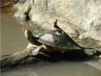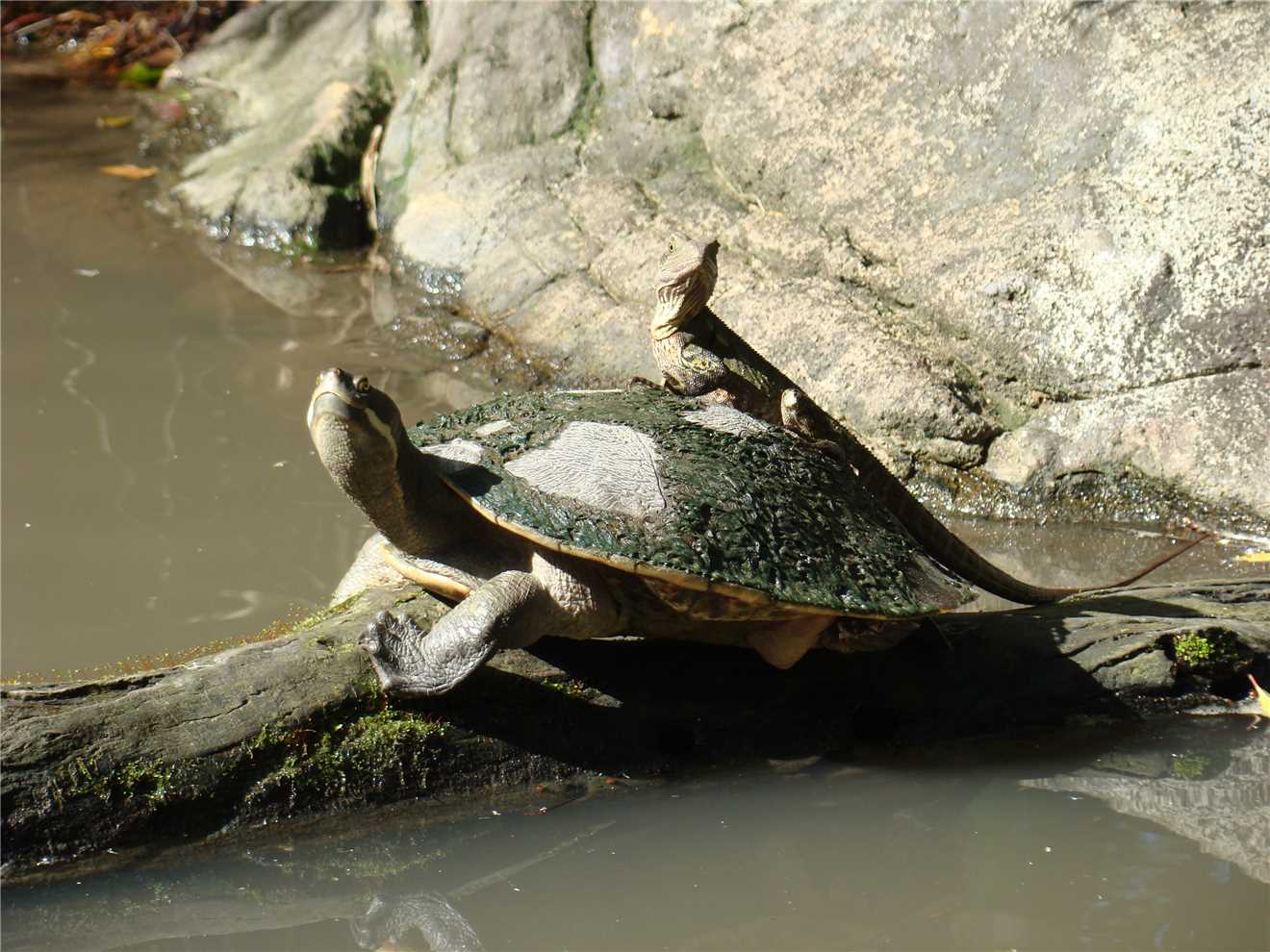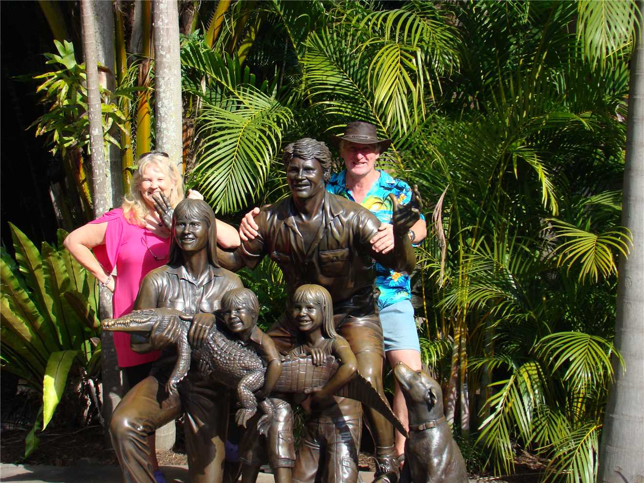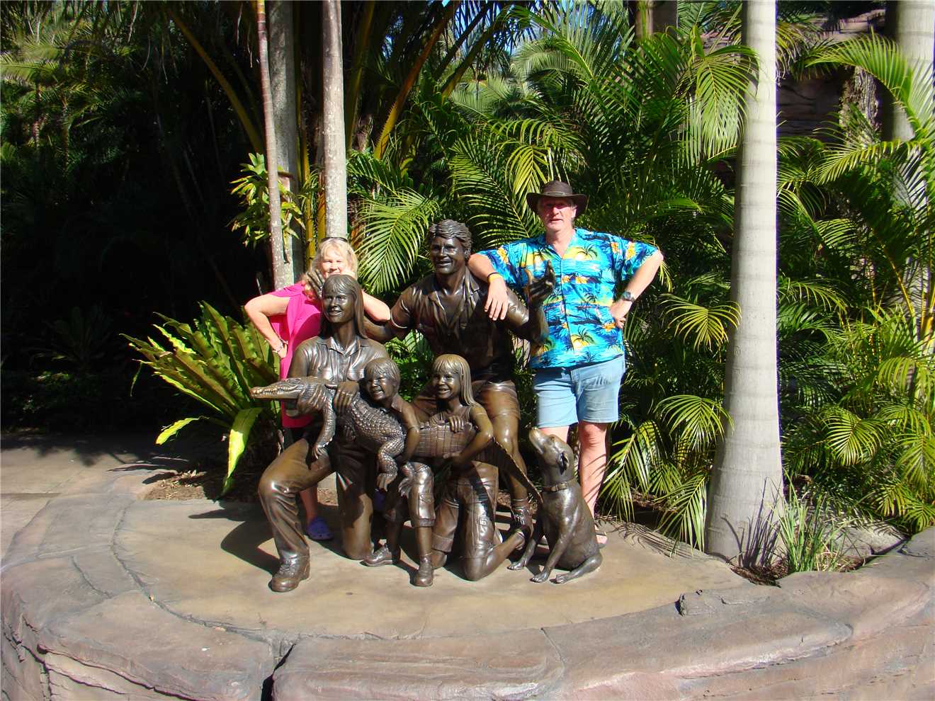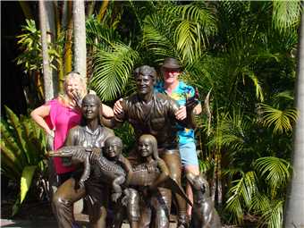 Past the dingo enclosure, not as nice as the Fraser Island dingoes, nah only joking. I had to show Aggro the croc to Luke or is it the other way, because he wanted to see a large croc and Aggro didn't let us down (see photo, nice mouth and teeth). We are now getting towards the end of our epic journey, so it was off to see the turtles and tortoises. A crazy water dragon entertained us by jumping on the back of one of the turtles/tortoises - see photo. On the way to the big souvenir shop, we came upon a statue of the Irwin family, so it was time for a family snap. As we left the souvenir shop on our way to the car, I noticed that some of my money had changed into plastic bags with Australia Zoo emblazoned over them, filled with a stubby holder and of course, KING JULIEN XIII of Madagascar fame.