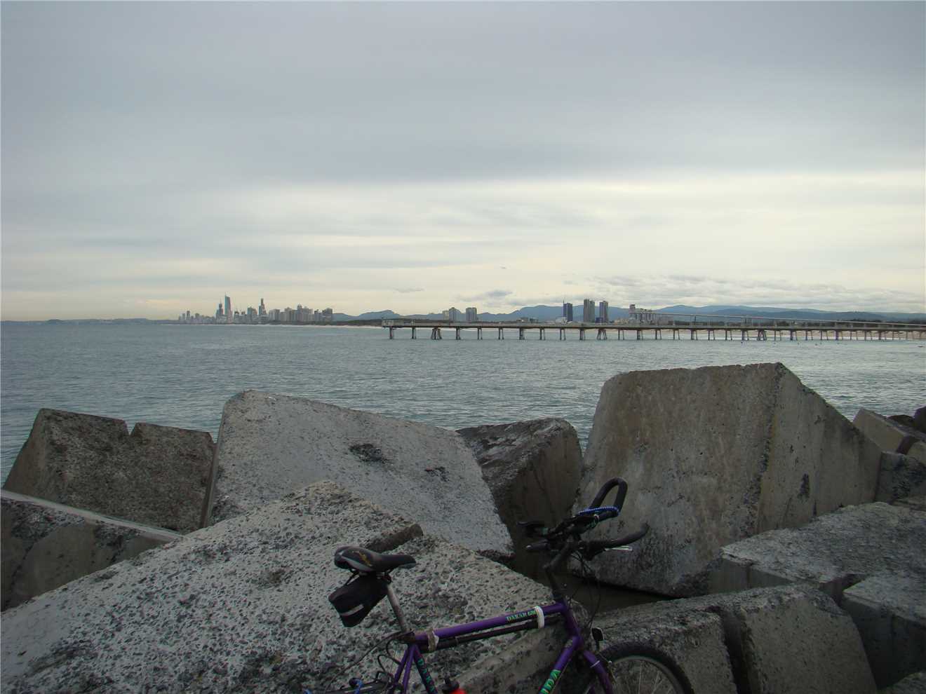 Highlight 2: As I was riding along Seaworld drive, just past Seaworld on my way to the spit, I saw a police car up ahead, it was stationary and had its lights flashing. As I got closer, I noticed that it had pulled over a commodore station wagon, with 2 surfers in it. One cop had the 2 males sitting on the footpath, while the second cop was searching their car. After riding out to the end of the seawall and returning past this spot, the cops and surfers were still there, with one cop on the radio and the other cop watching the surfers sitting on the footpath. I assume that they were surfers as there were 2 boards on the roof.